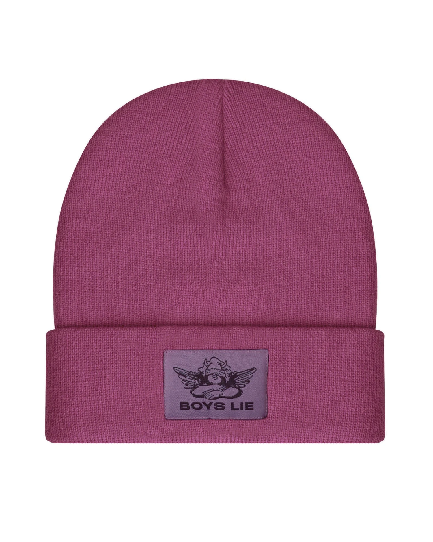 Magenta beanie with purple Boys Lie logo patch.