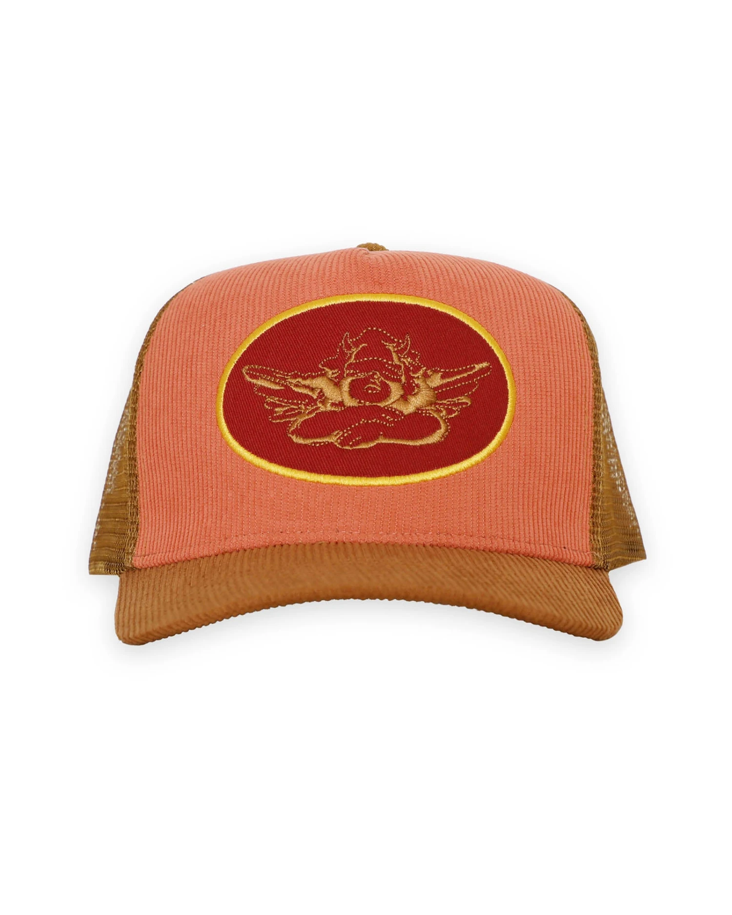 Dark tan trucker hat with maroon patch and peach corduroy. Adjustable snapback.