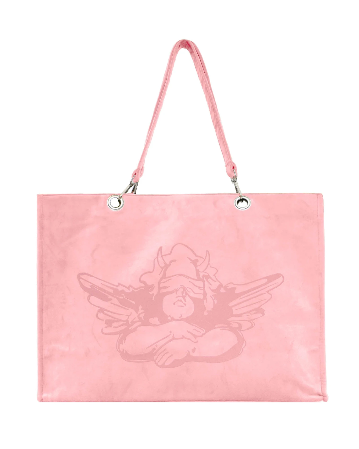 Oversized baby pink velour structured tote. Small interior pocket, silver hardware, and magnetic closure.