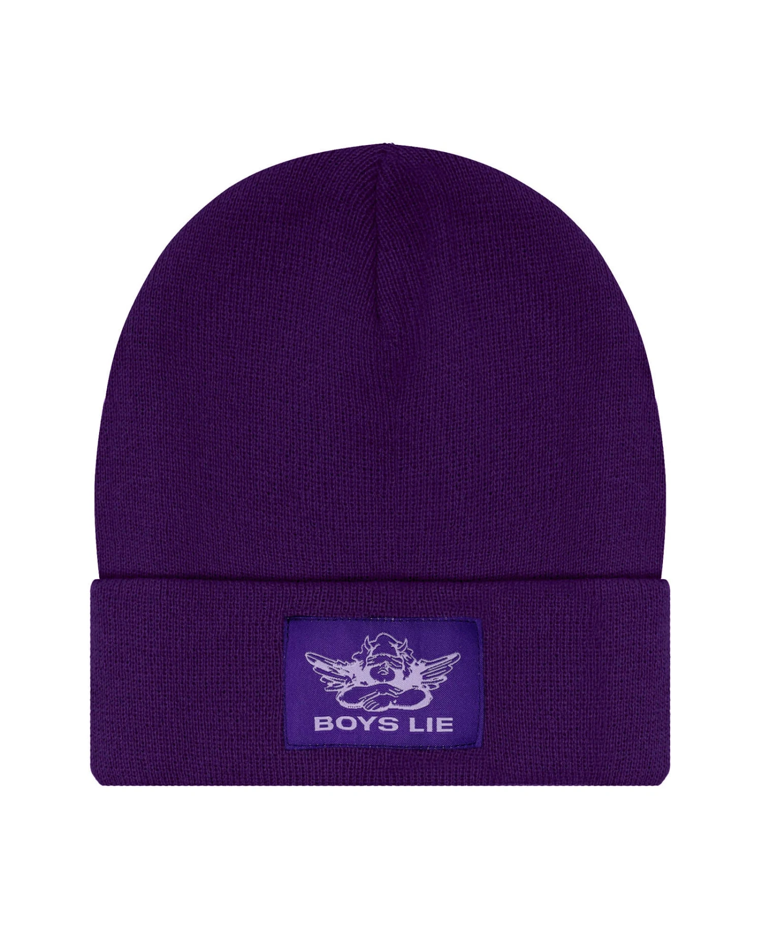Deep purple beanie with monochromatic purple Boys Lie logo patch.