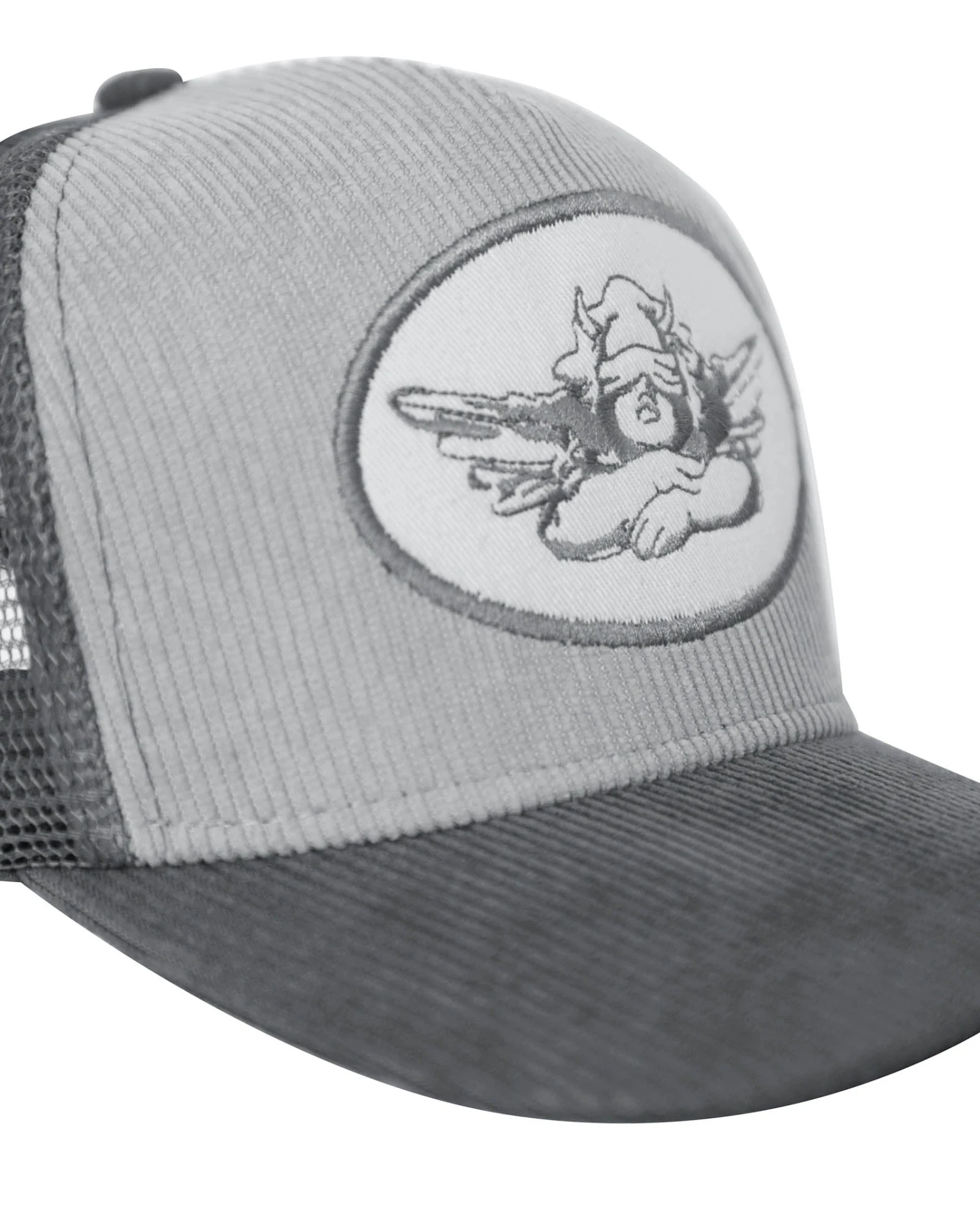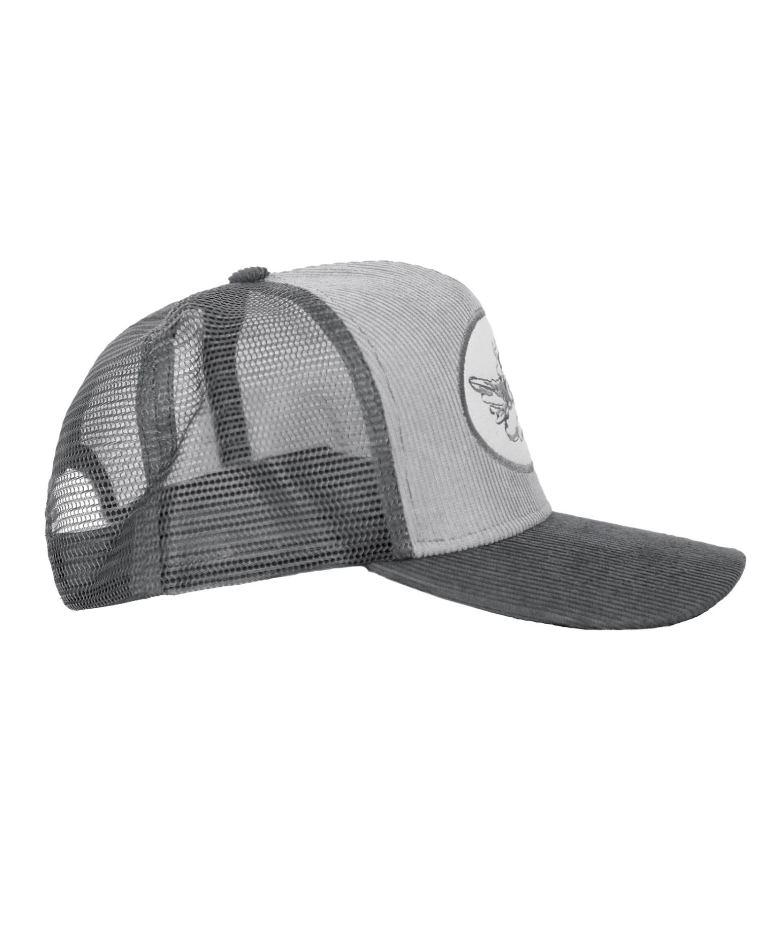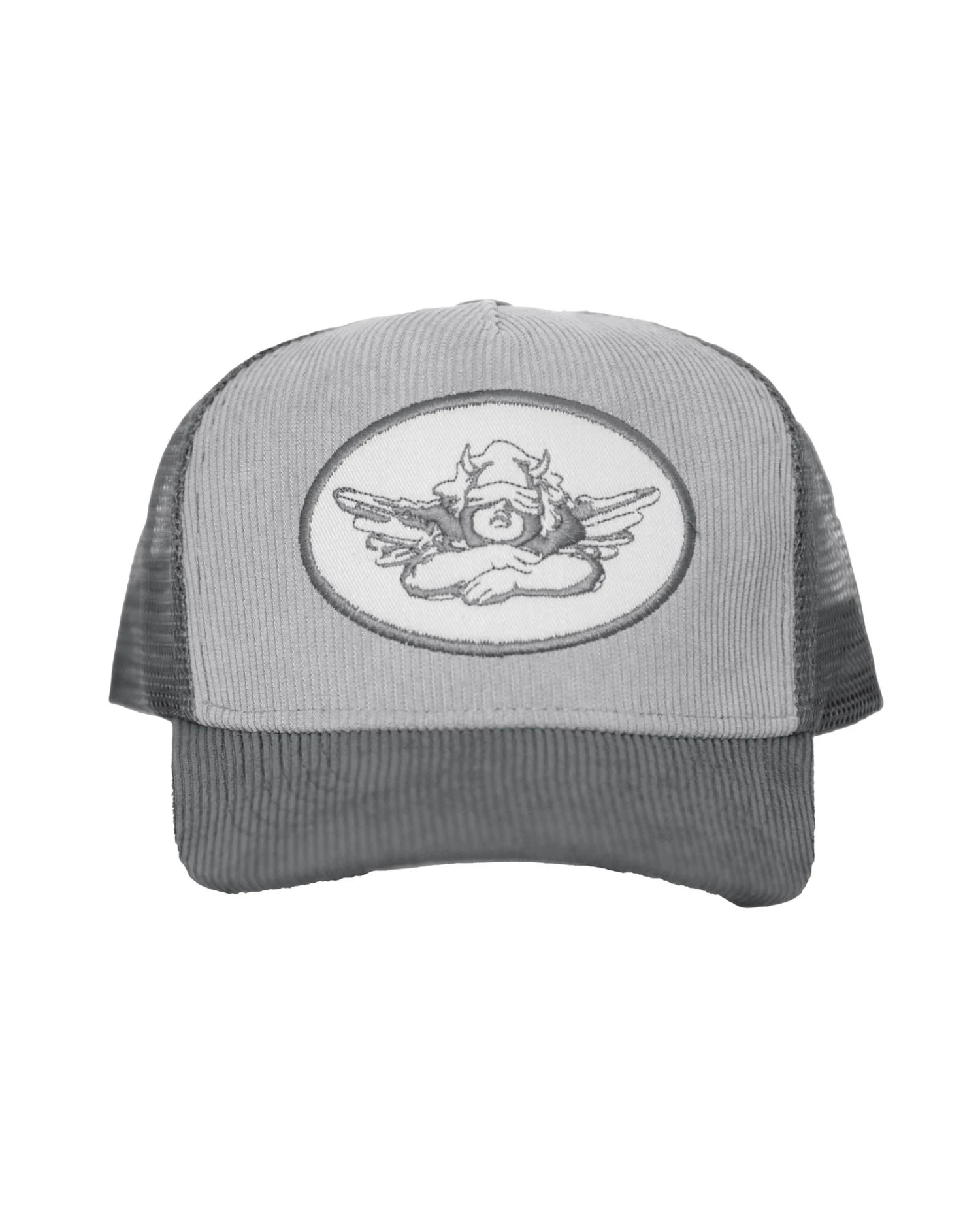 Grey corduroy trucker hat with monochromatic patch. Adjustable snapback.