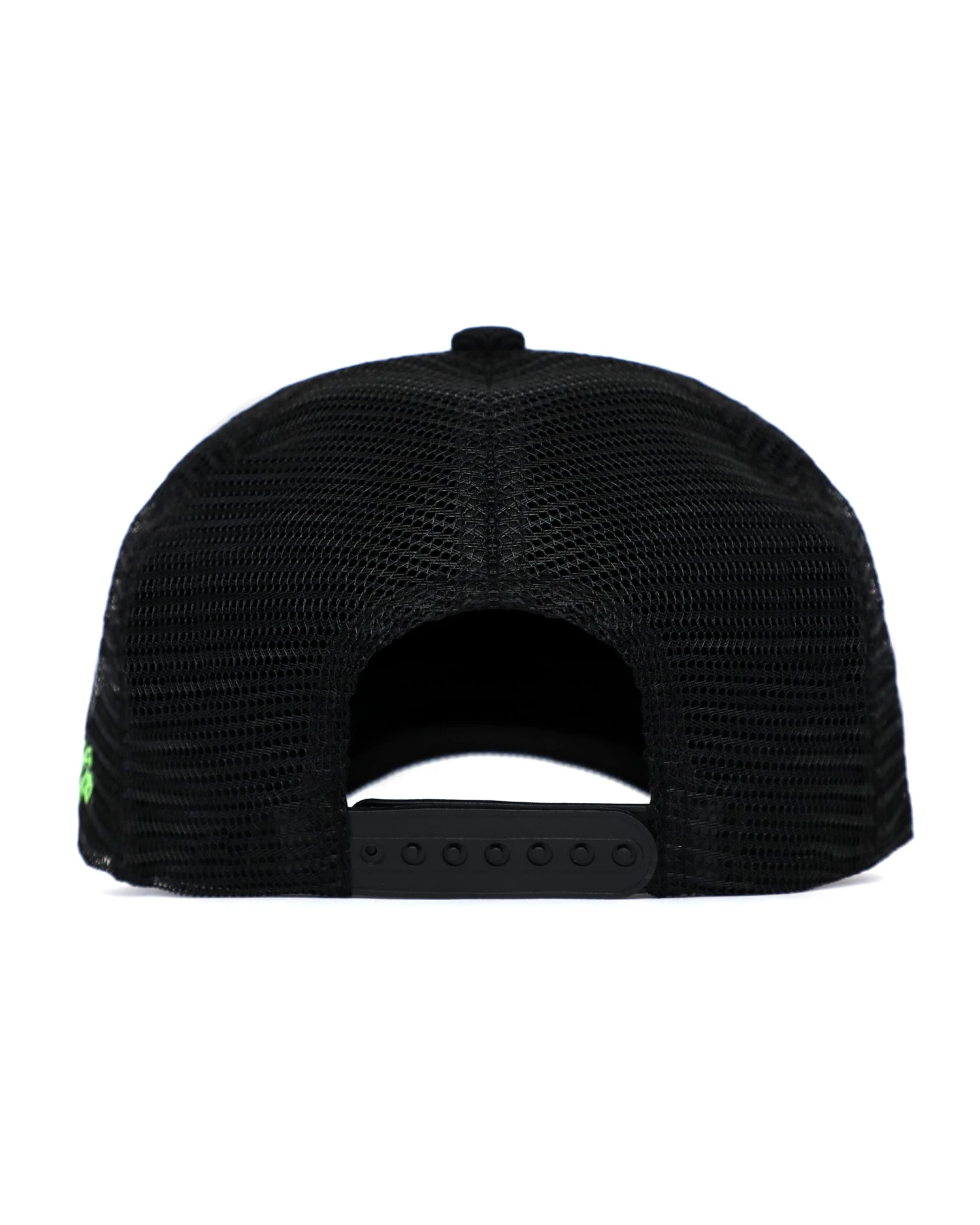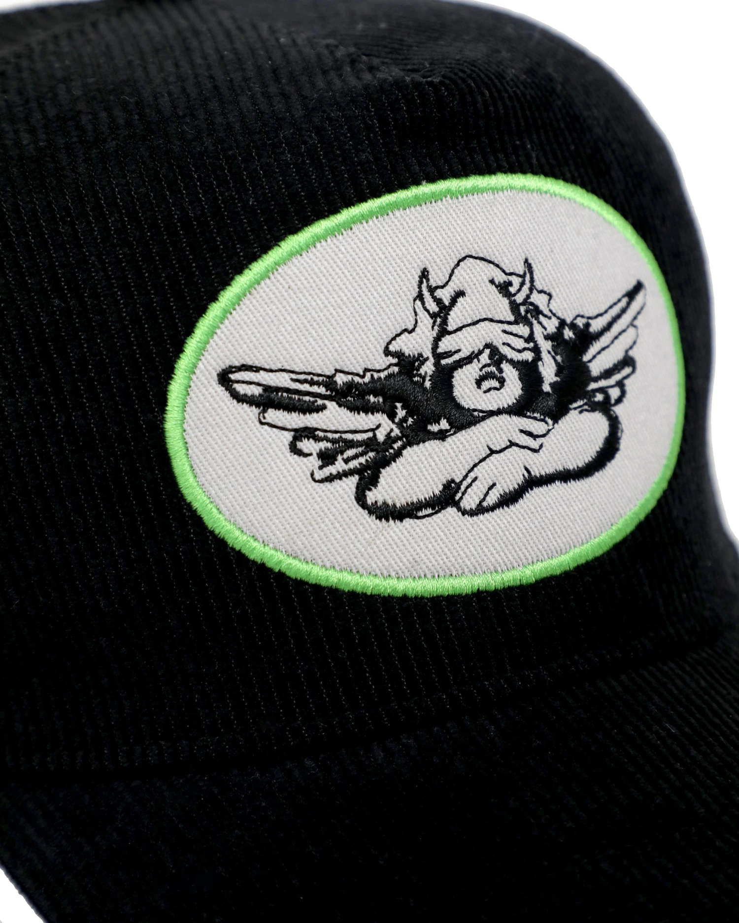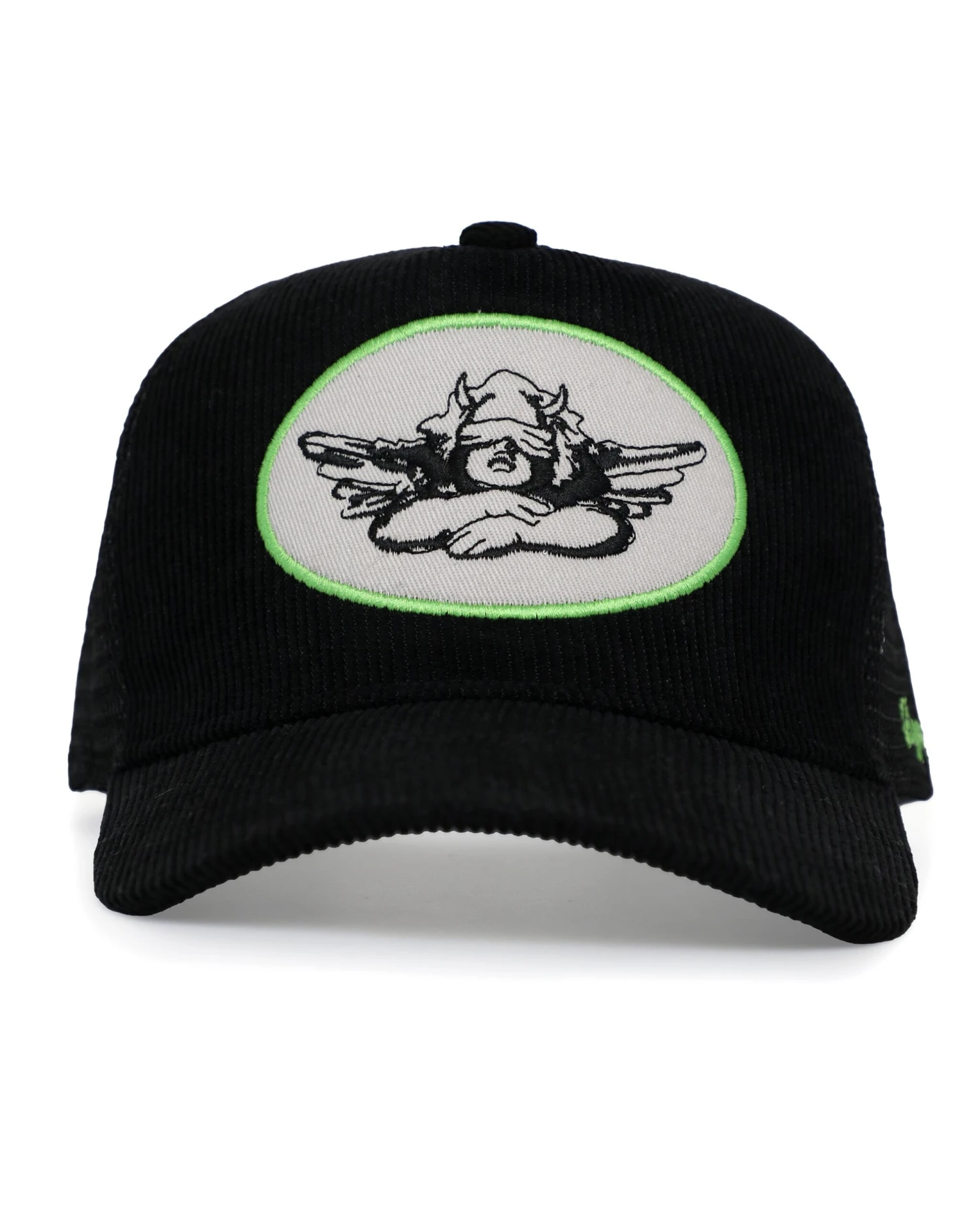 Black corduroy trucker hat with white patch and embroidered details. Adjustable snapback.