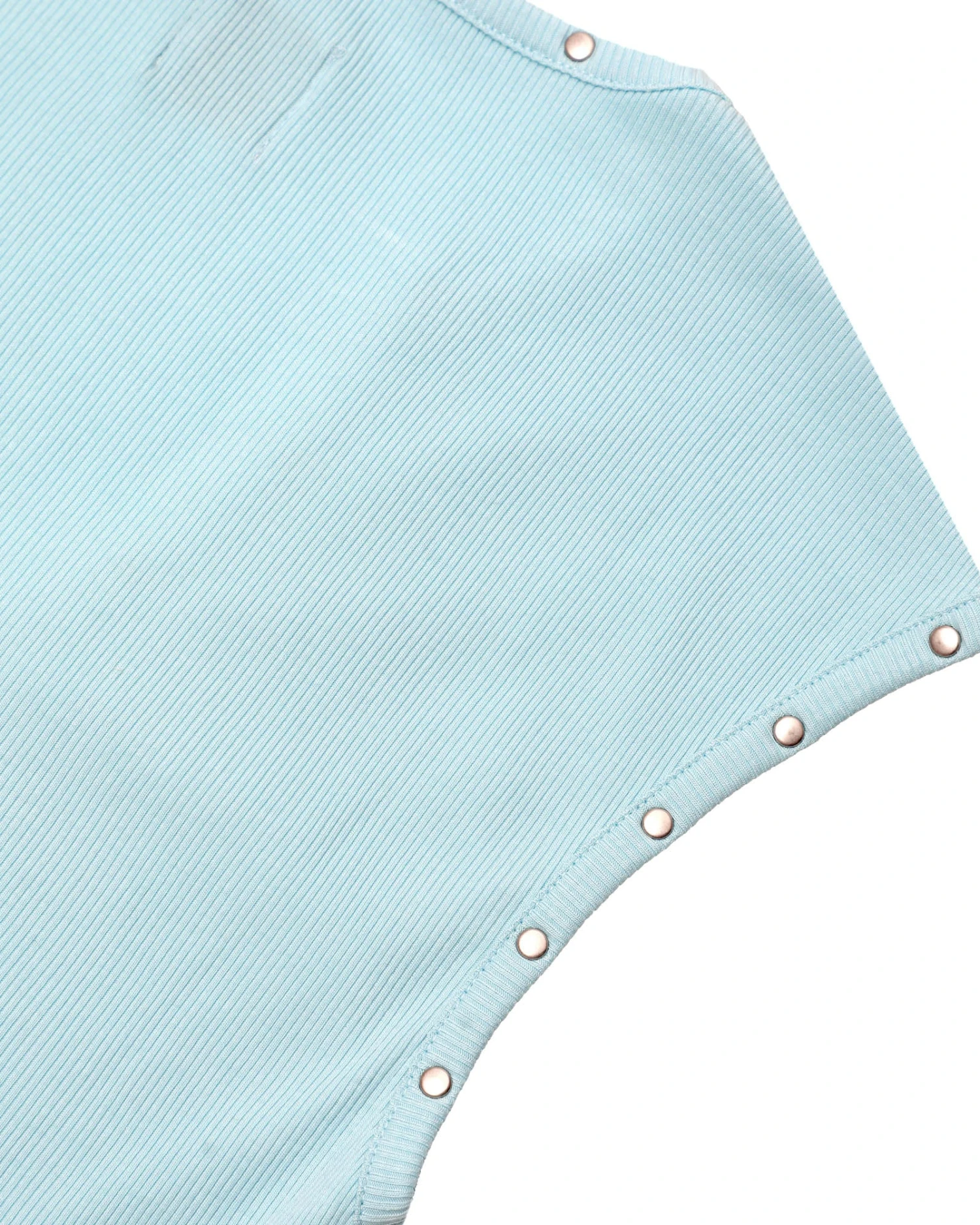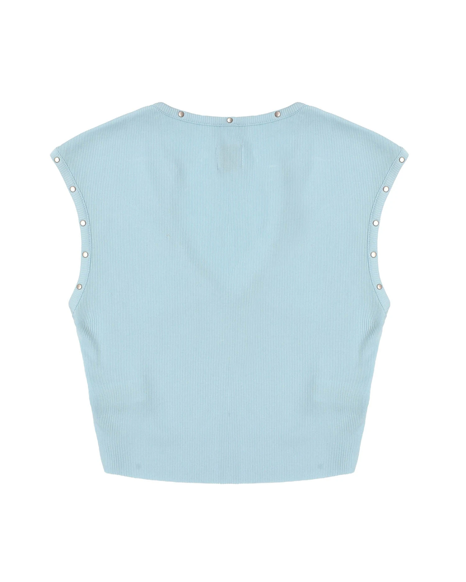 Blue ribbed crop tank with a V neckline and silver stud details.