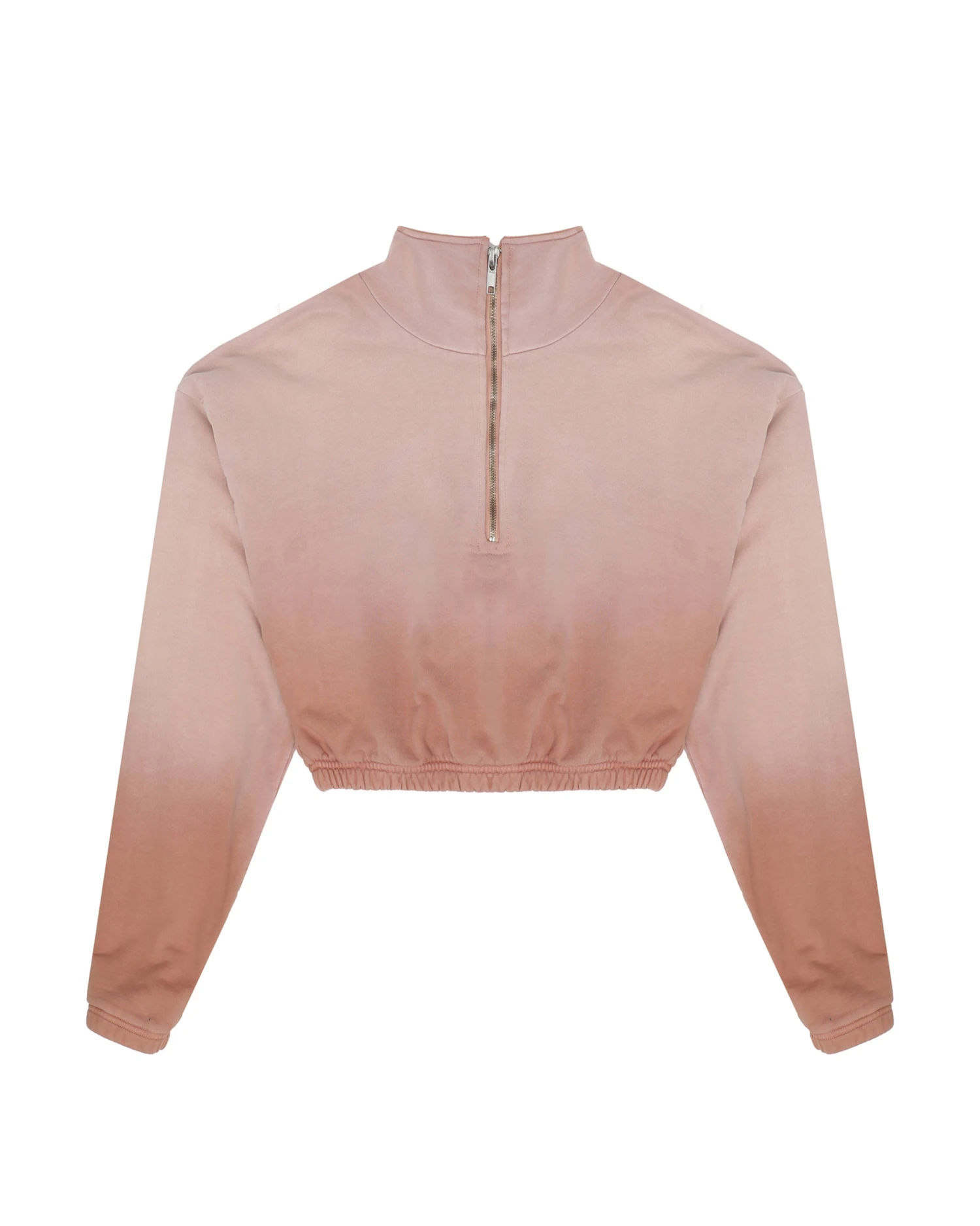Mid-weight fleece fabric with soft jersey interior lining. Cropped length, quarter zip, elastic cuffs and hemline. Each item is hand-dyed and may show slight color variations. Made in Los Angeles, California.