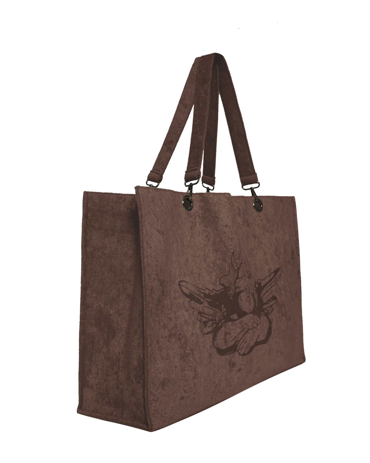 Oversized brown terry cloth structured tote. Small interior pocket, silver hardware, and magnetic closure.