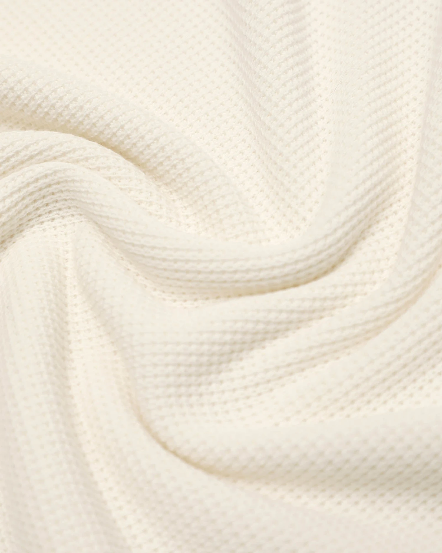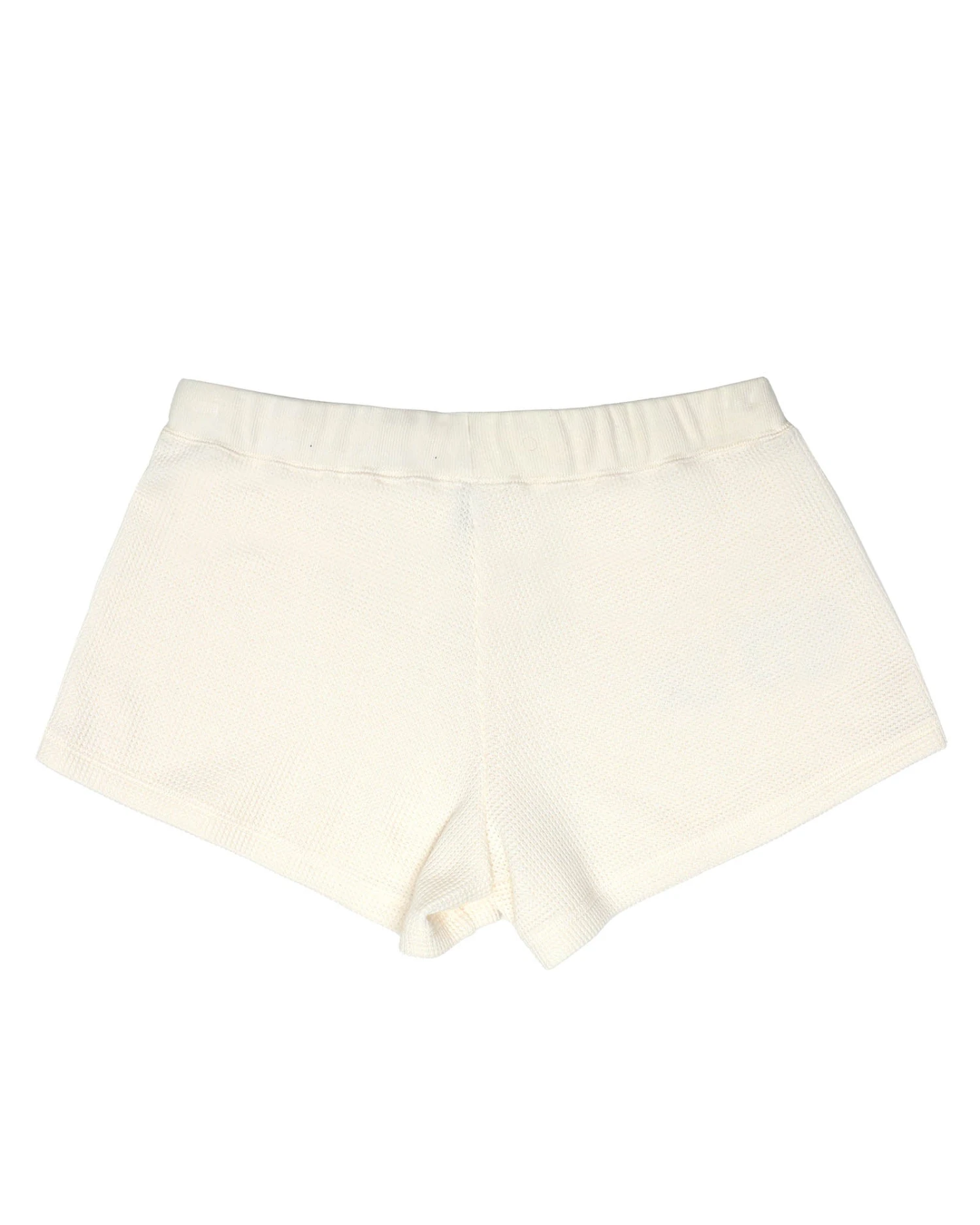 Soft thermal fabric in cream. Mid-rise shorts with adjustable drawstring.