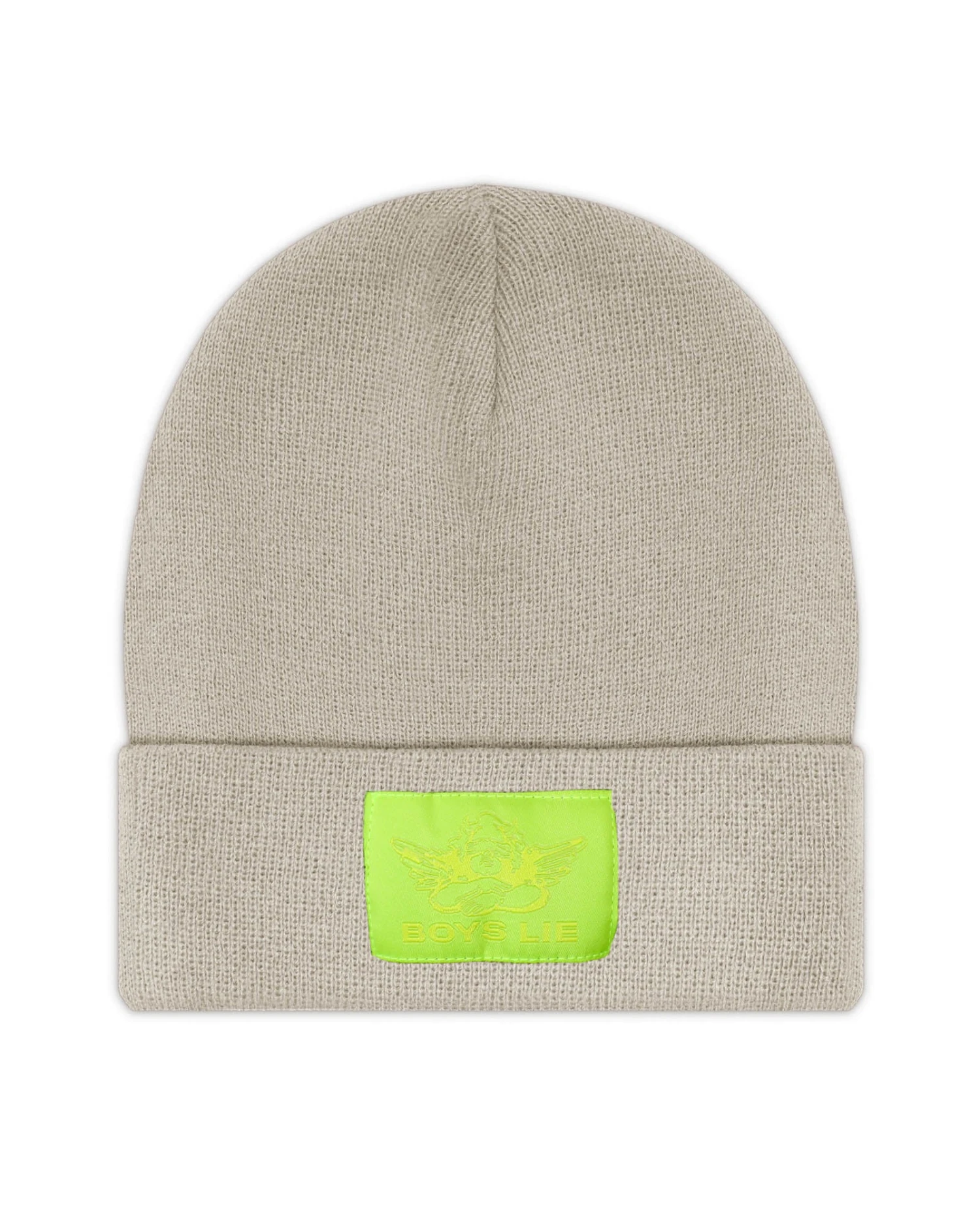 Light beige beanie with neon green Boys Lie logo patch.