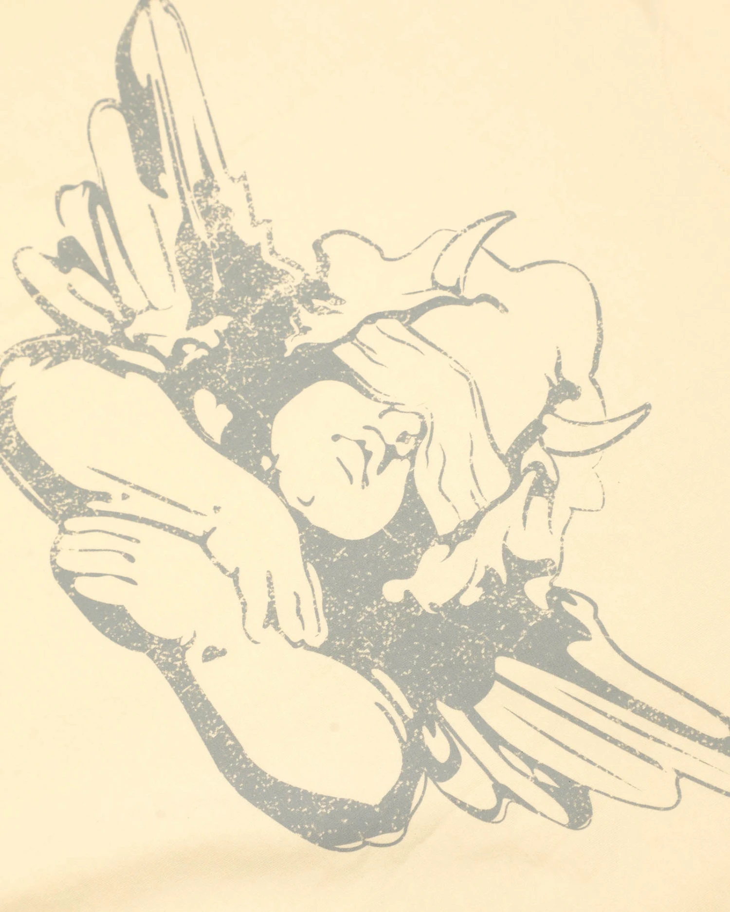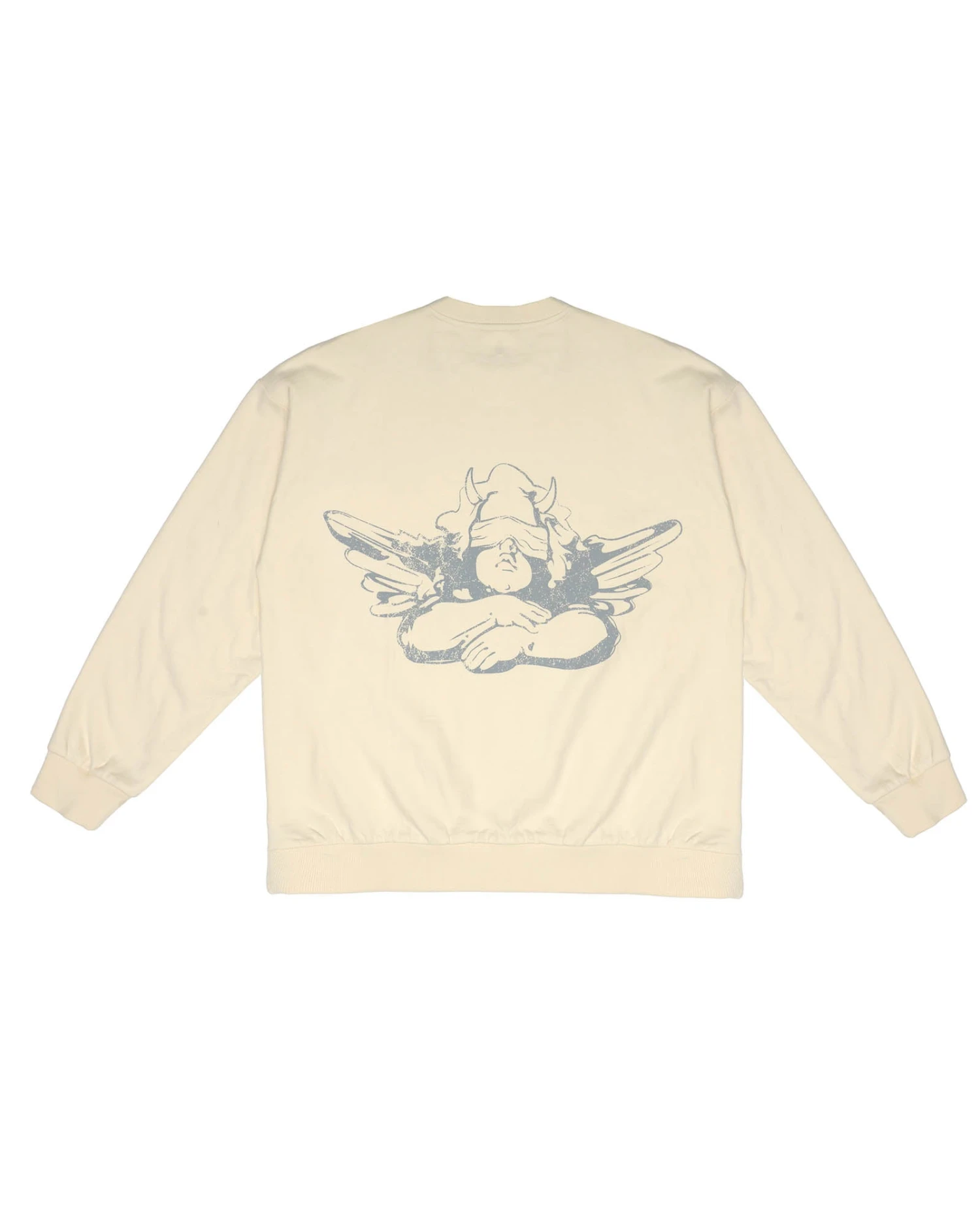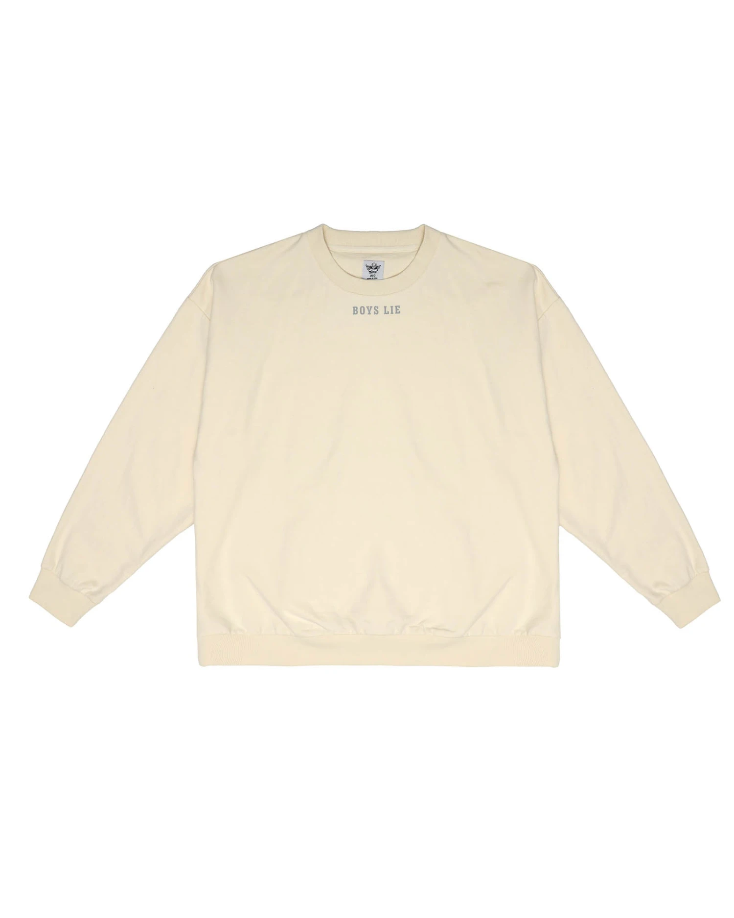 Lightweight fleece fabric in pastel yellow. Oversized crewneck sweatshirt with ribbed neckline, cuffs, and hem. Features distressed logo.