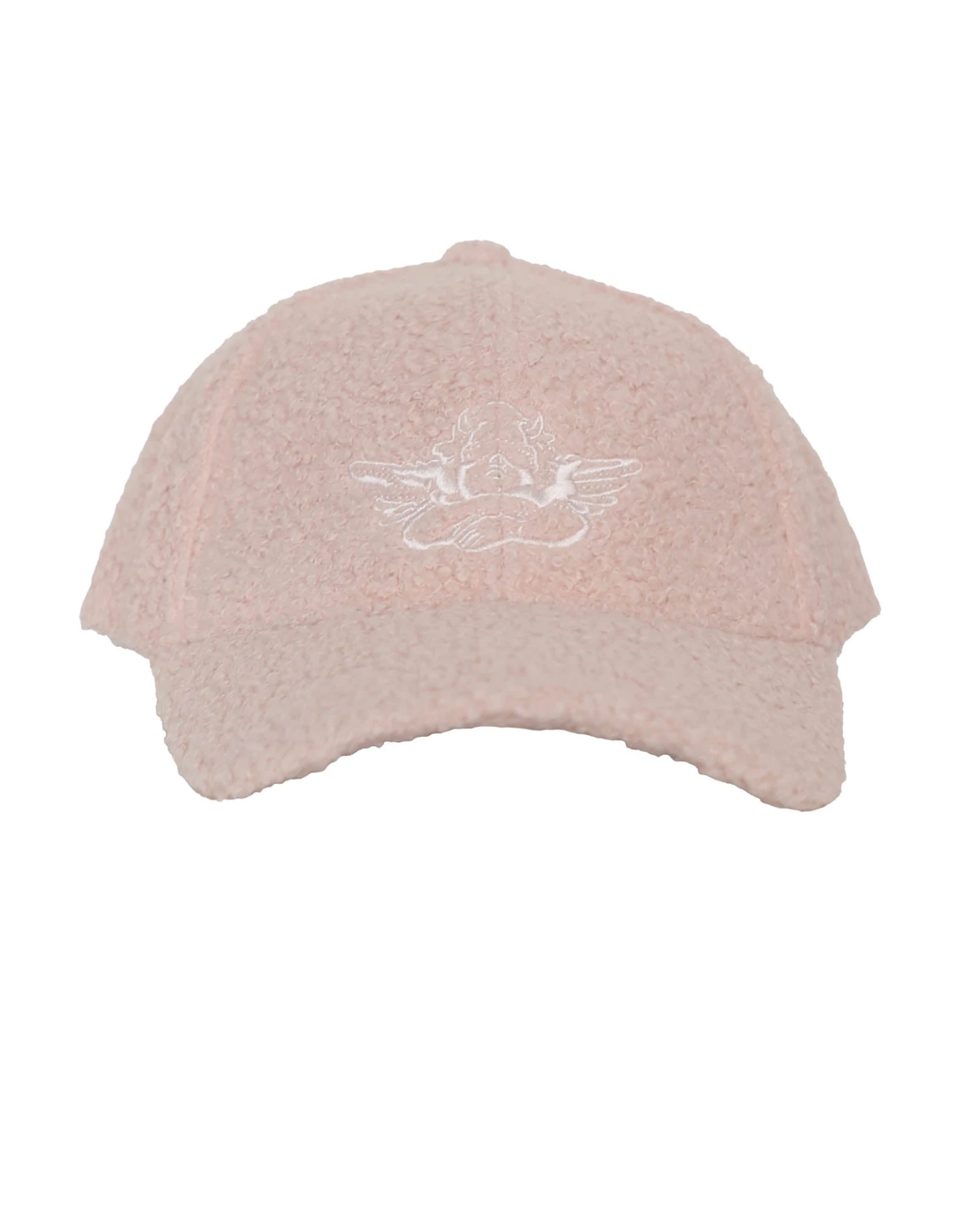 Faux light pink sherpa baseball hat with white Boys Lie cherub logo and an adjustable velcro strap.
