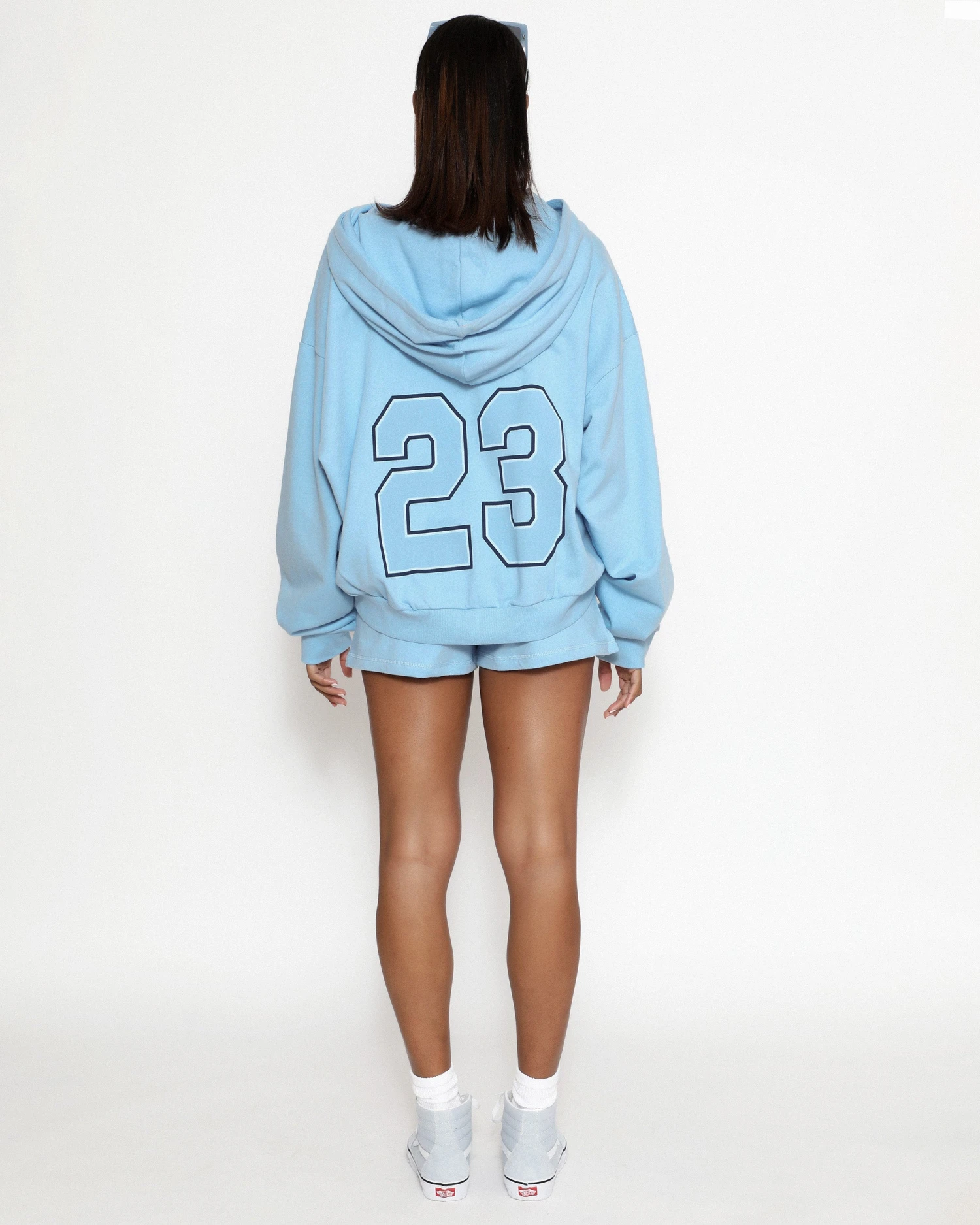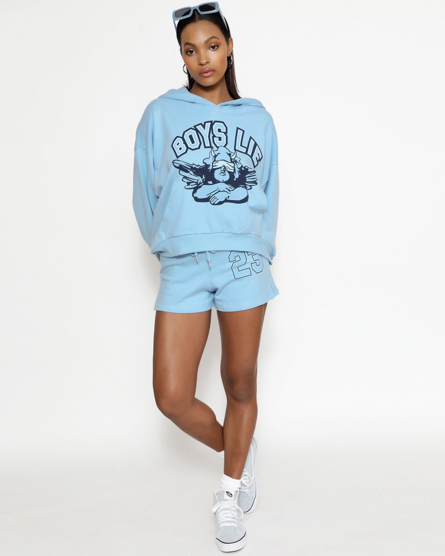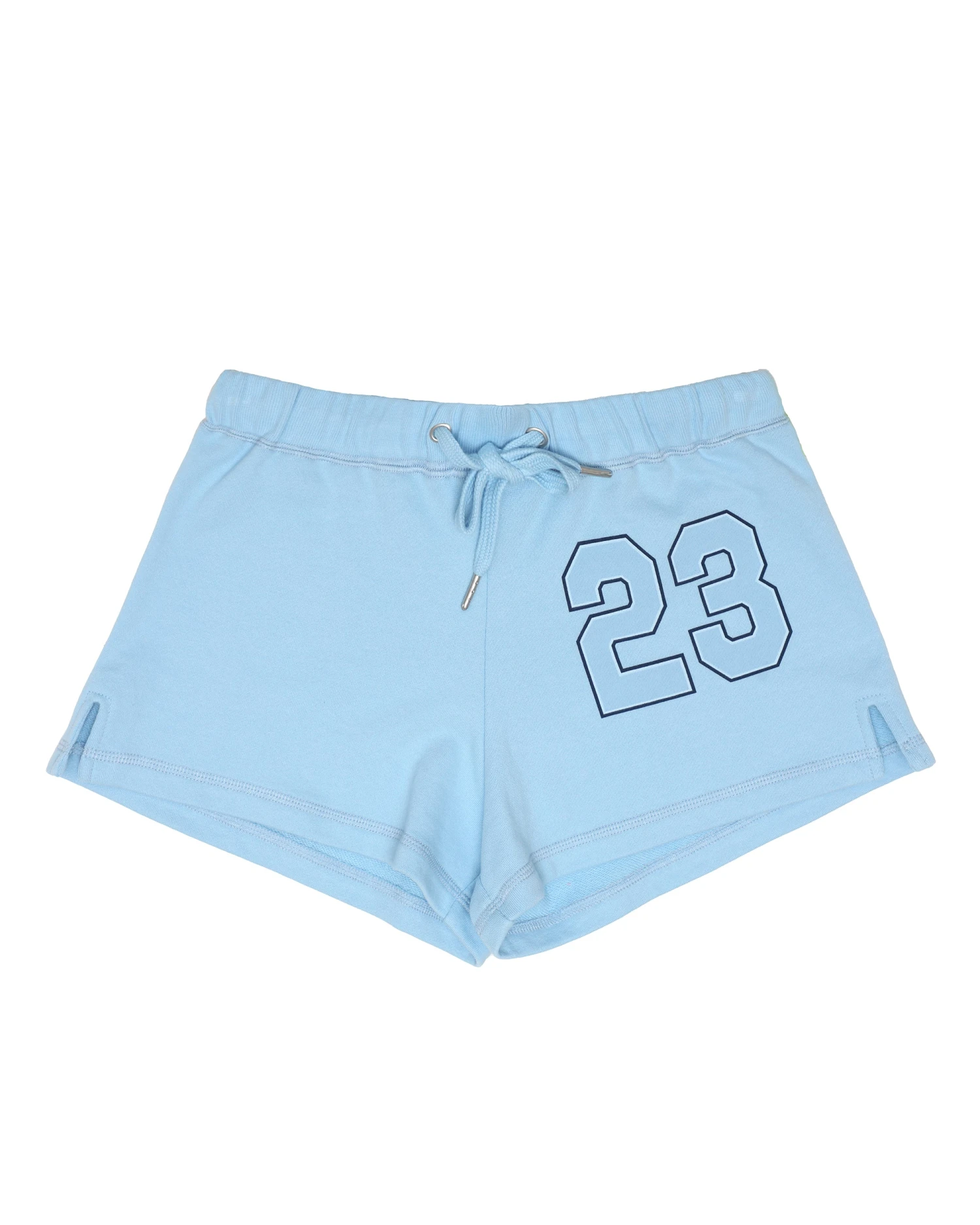Lightweight french terry fabric in sky blue. Mid-rise shorts with adjustable drawstring.