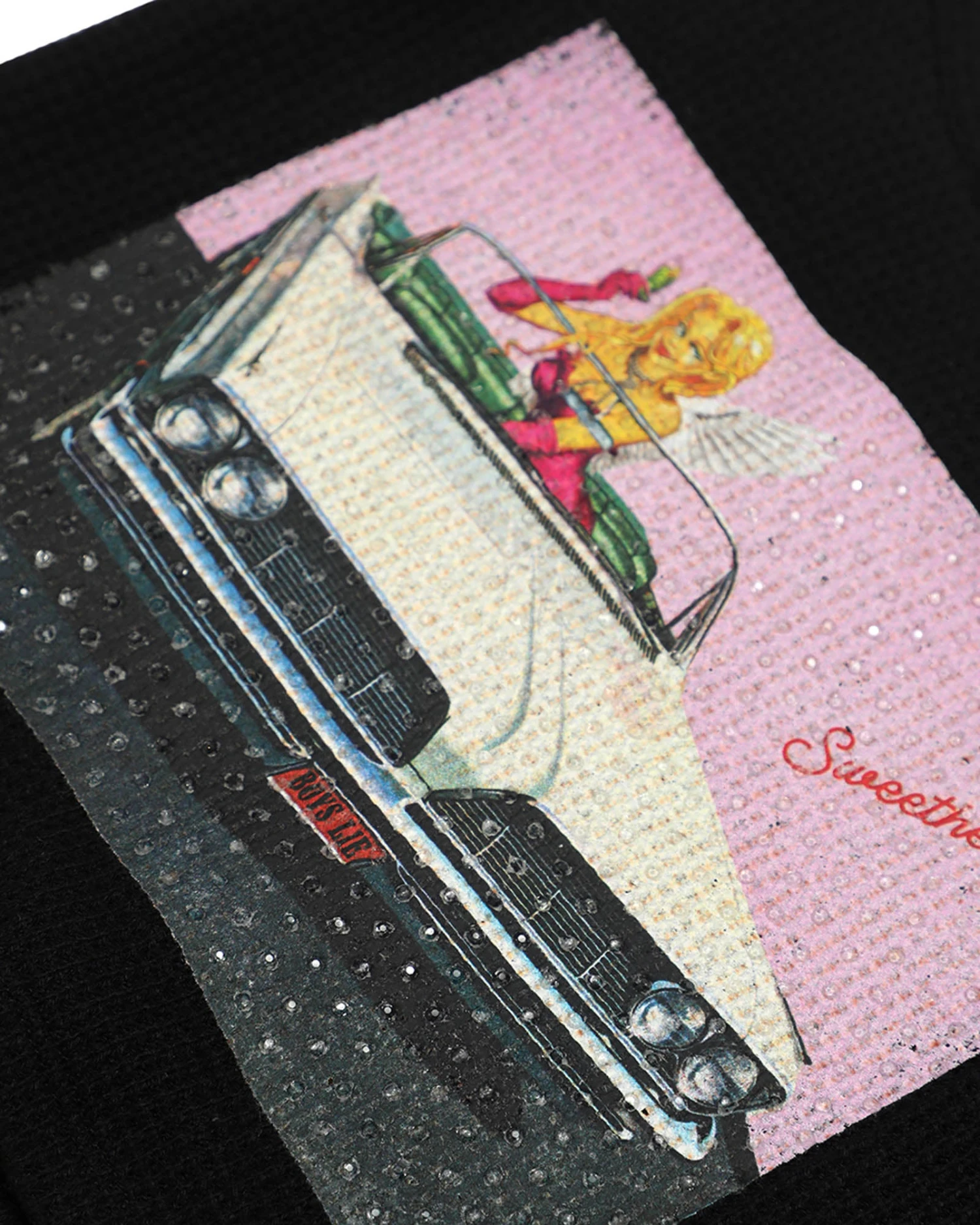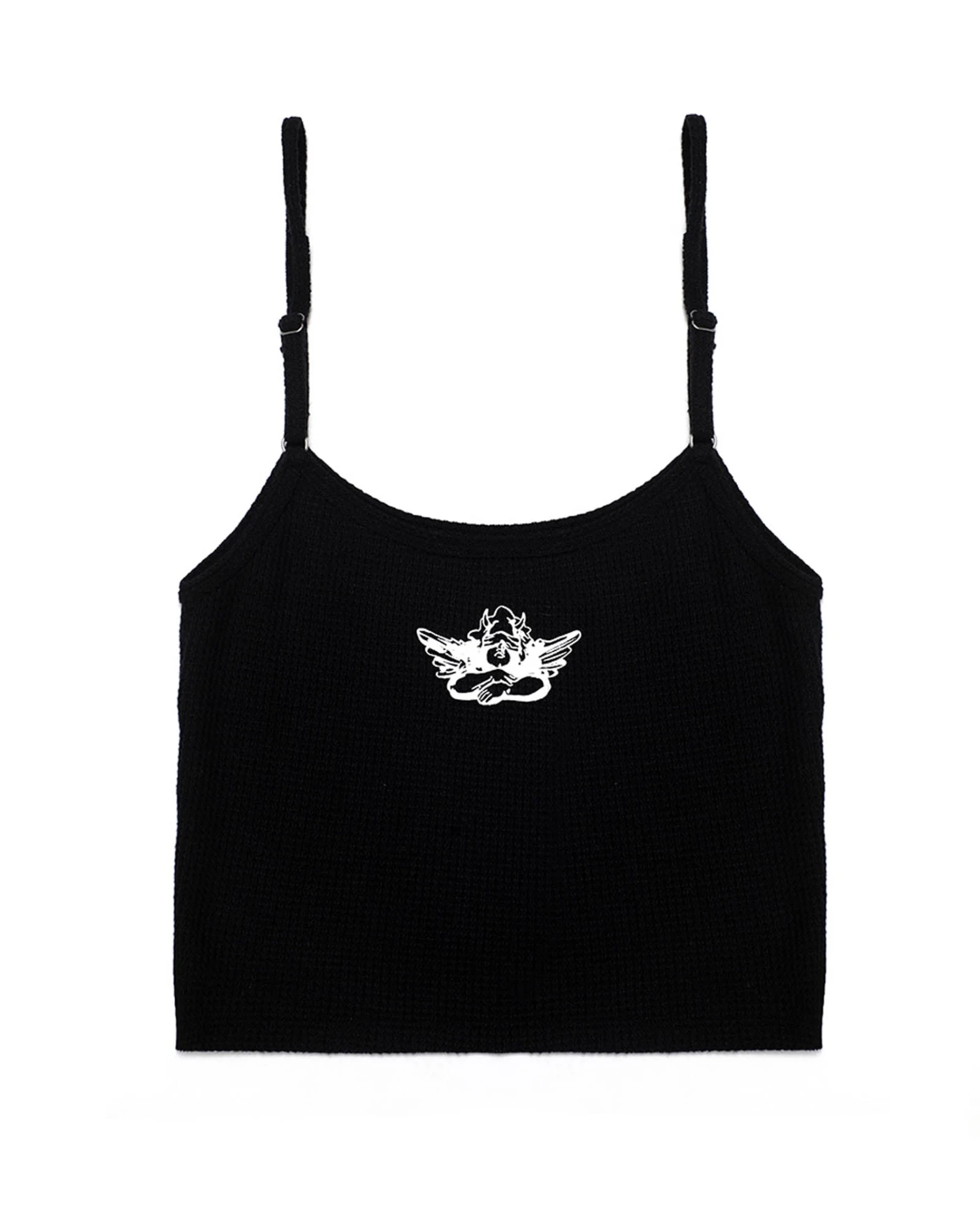 Soft thermal crop tank in black with adjustable straps and rhinestone embellishments.