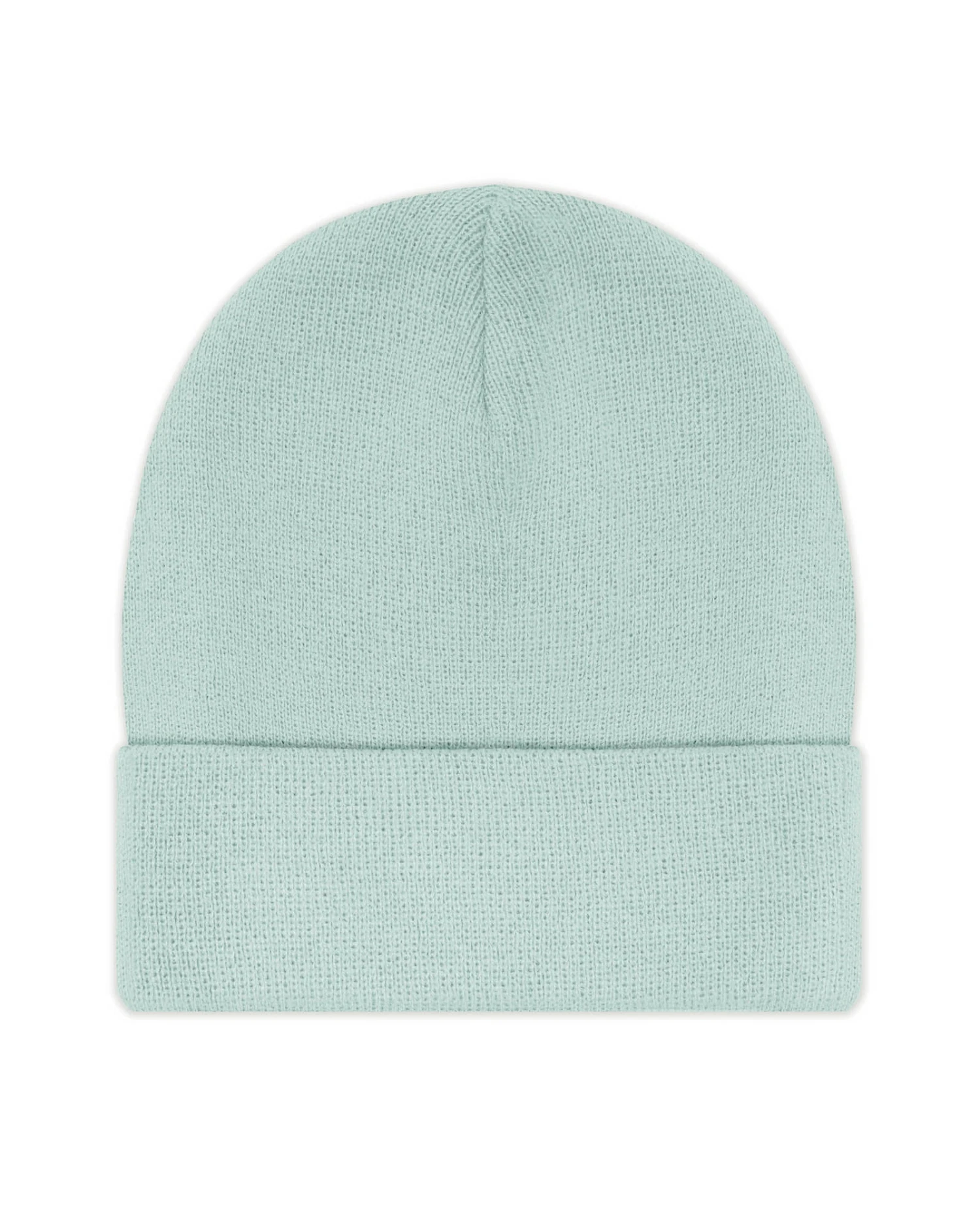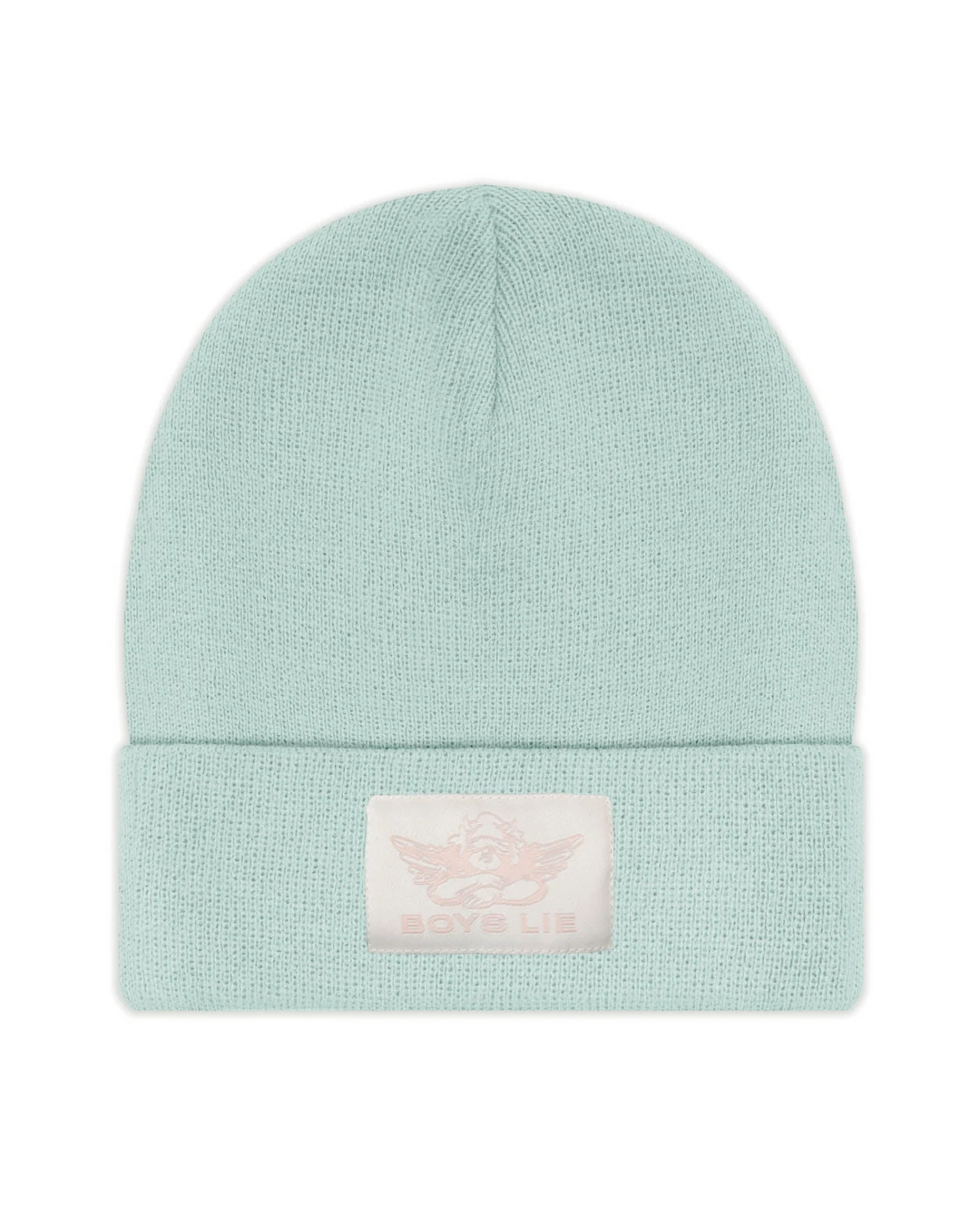 Soft seafoam blue beanie with light pink Boys Lie logo patch.