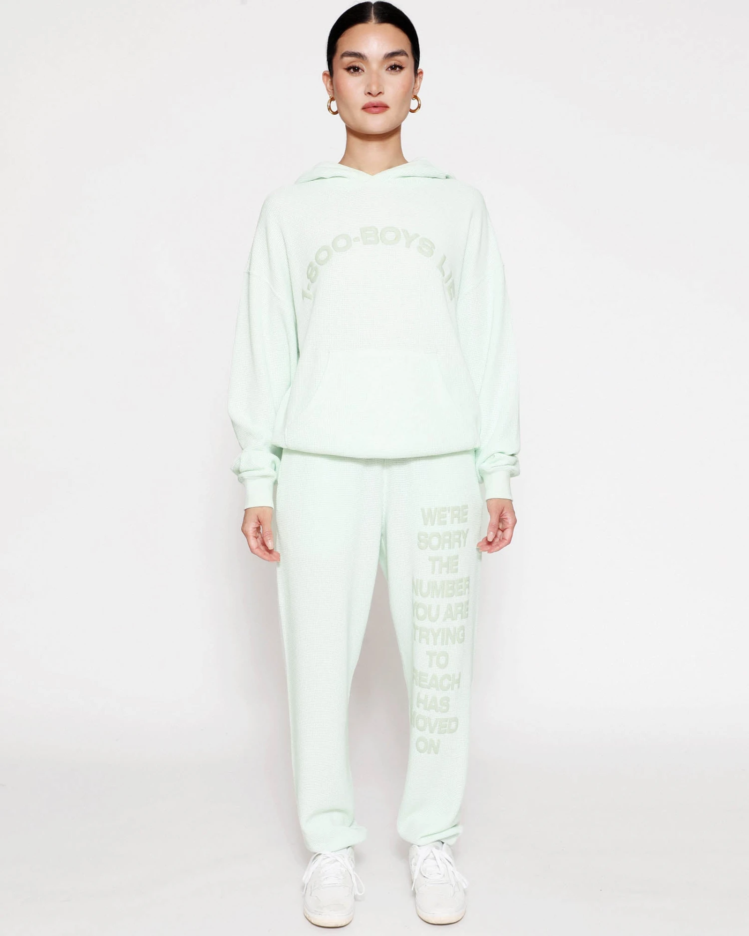 Soft thermal fabric in a soft green. High rise sweatpants with back and side pockets, elastic waistband and cuffs. Features puff print graphics.
