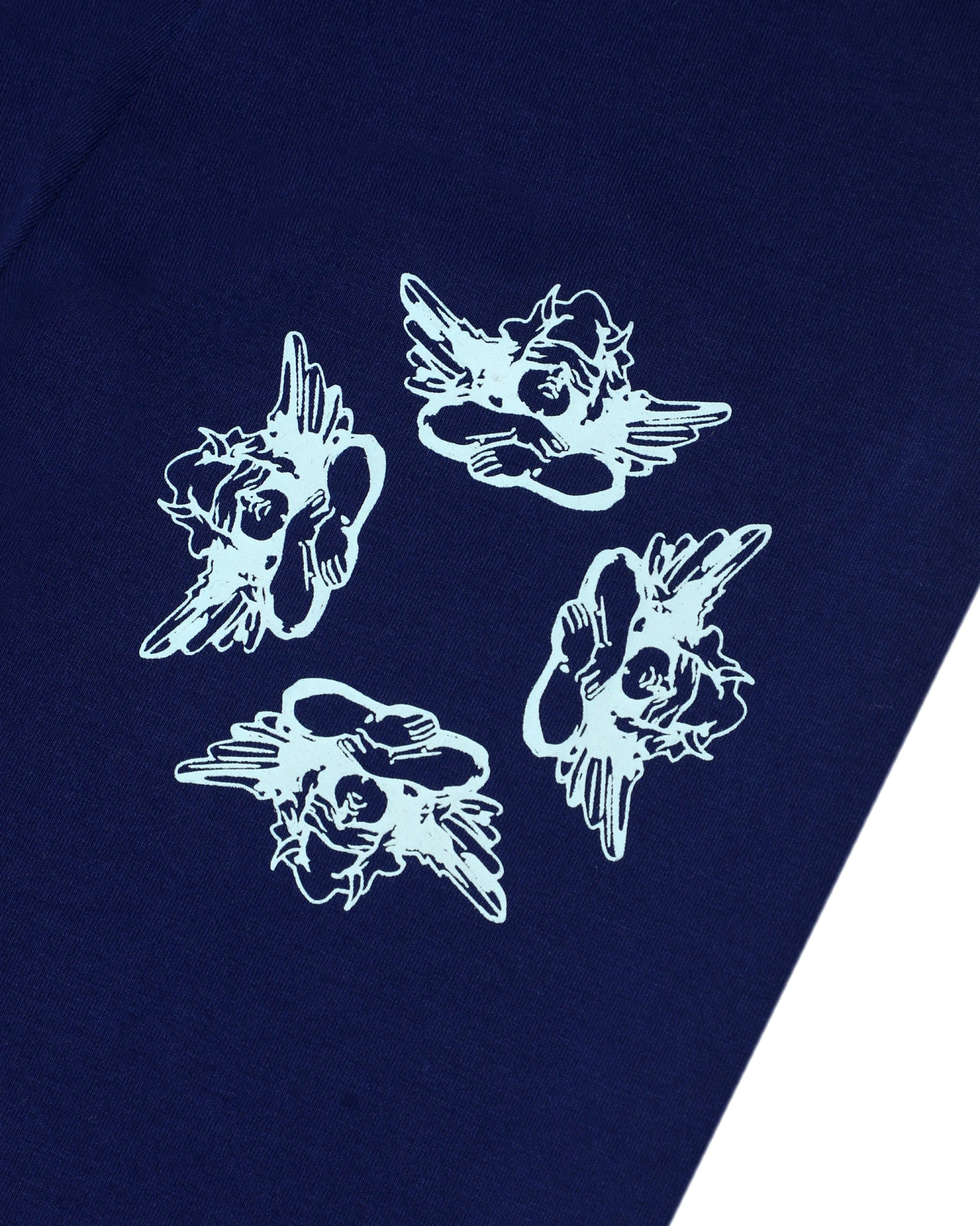 Mid-rise flared yoga pant in blue with elastic waistband. Printed front graphic.