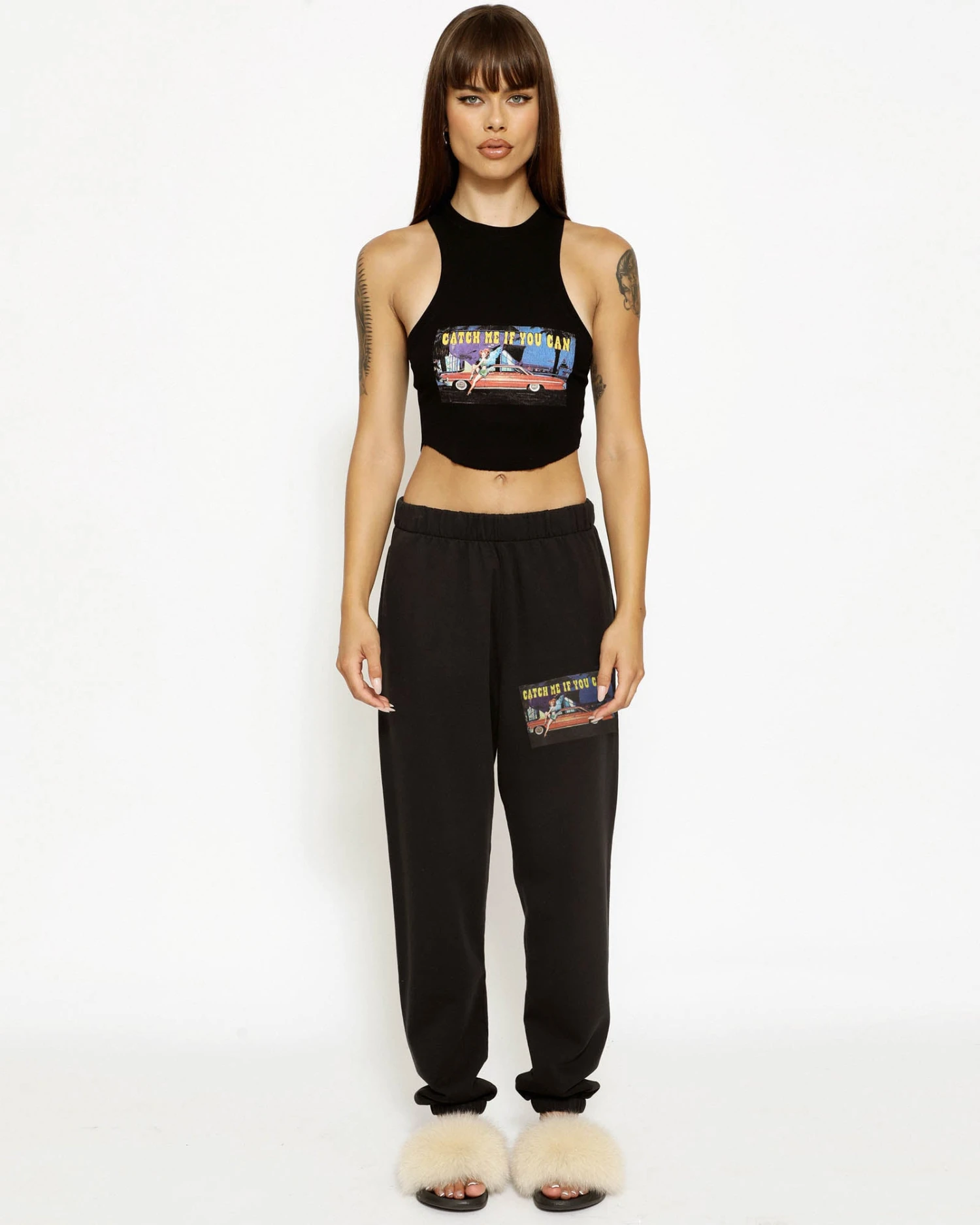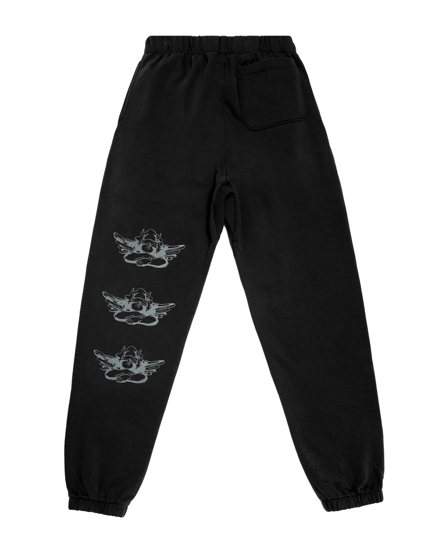 Mid-weight fleece fabric in black. High rise sweatpants with back and side pockets, elastic waistband and cuffs.