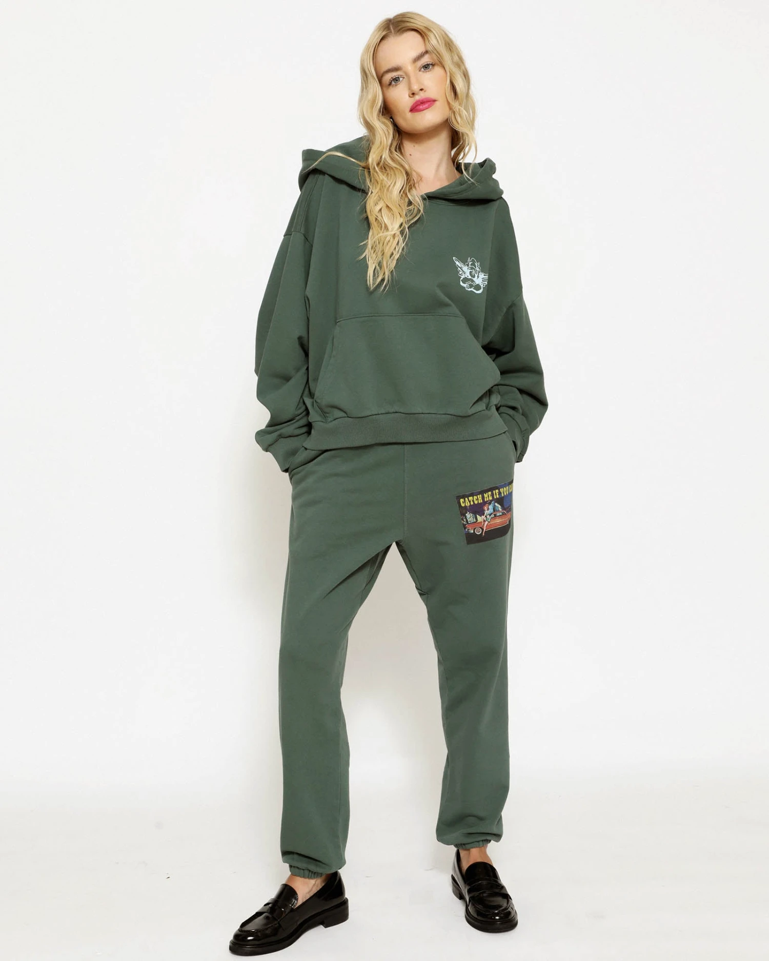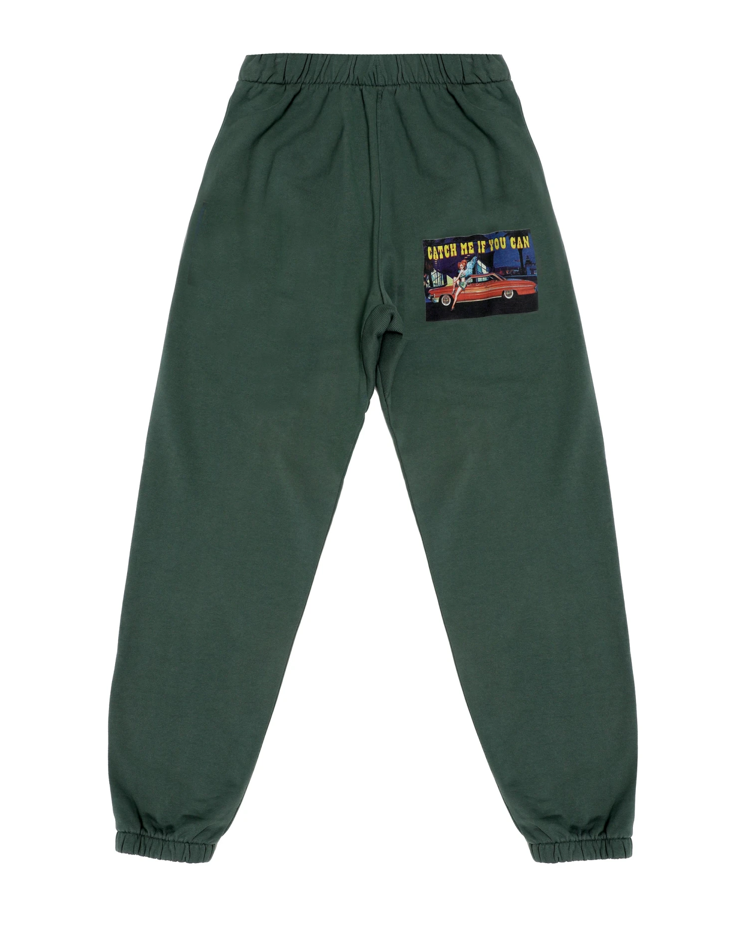 Mid-weight fleece fabric in emerald green. High rise sweatpants with back and side pockets, elastic waistband and cuffs.