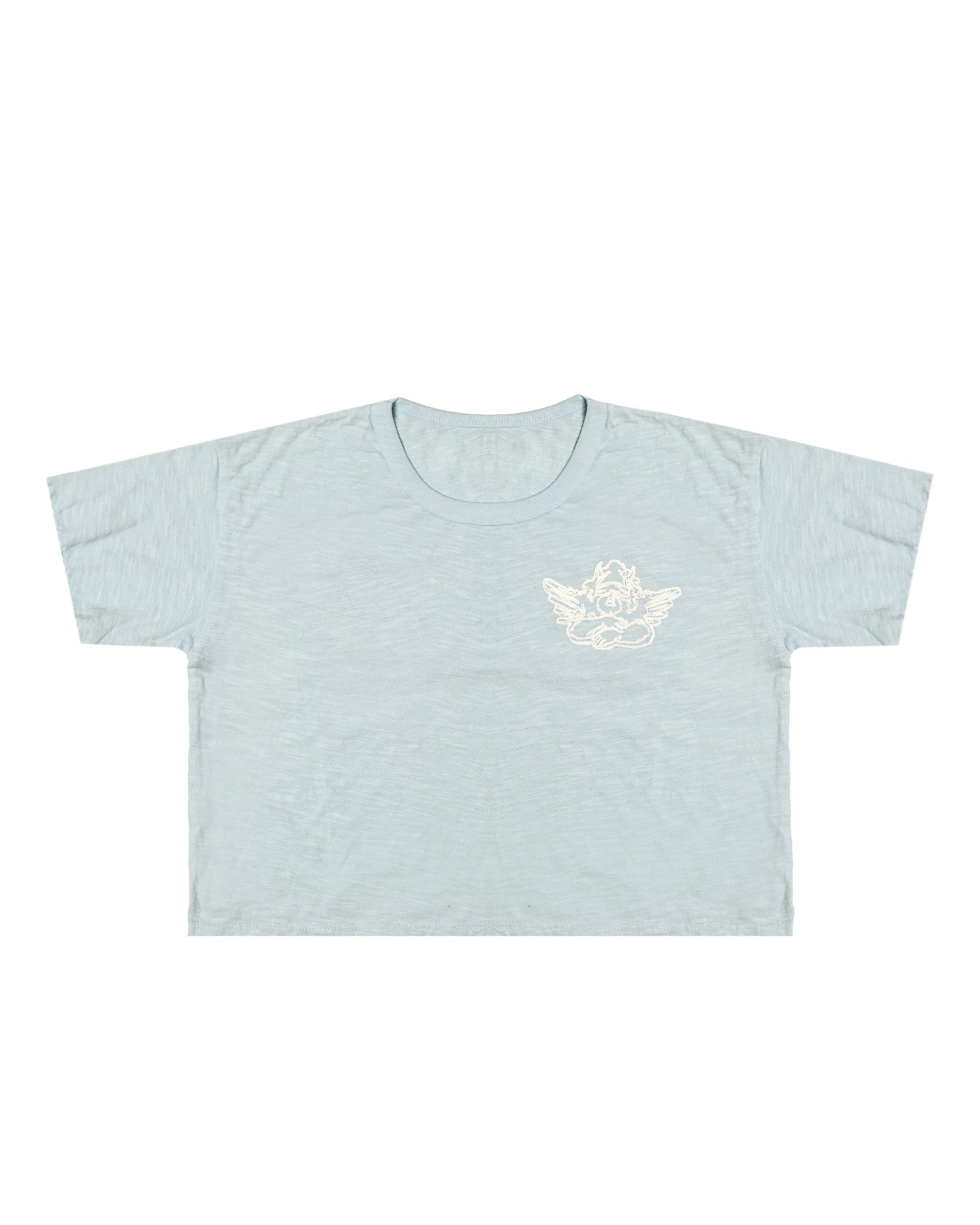 Cotton slub cropped baby tee in baby blue. Lightweight and slightly sheer.