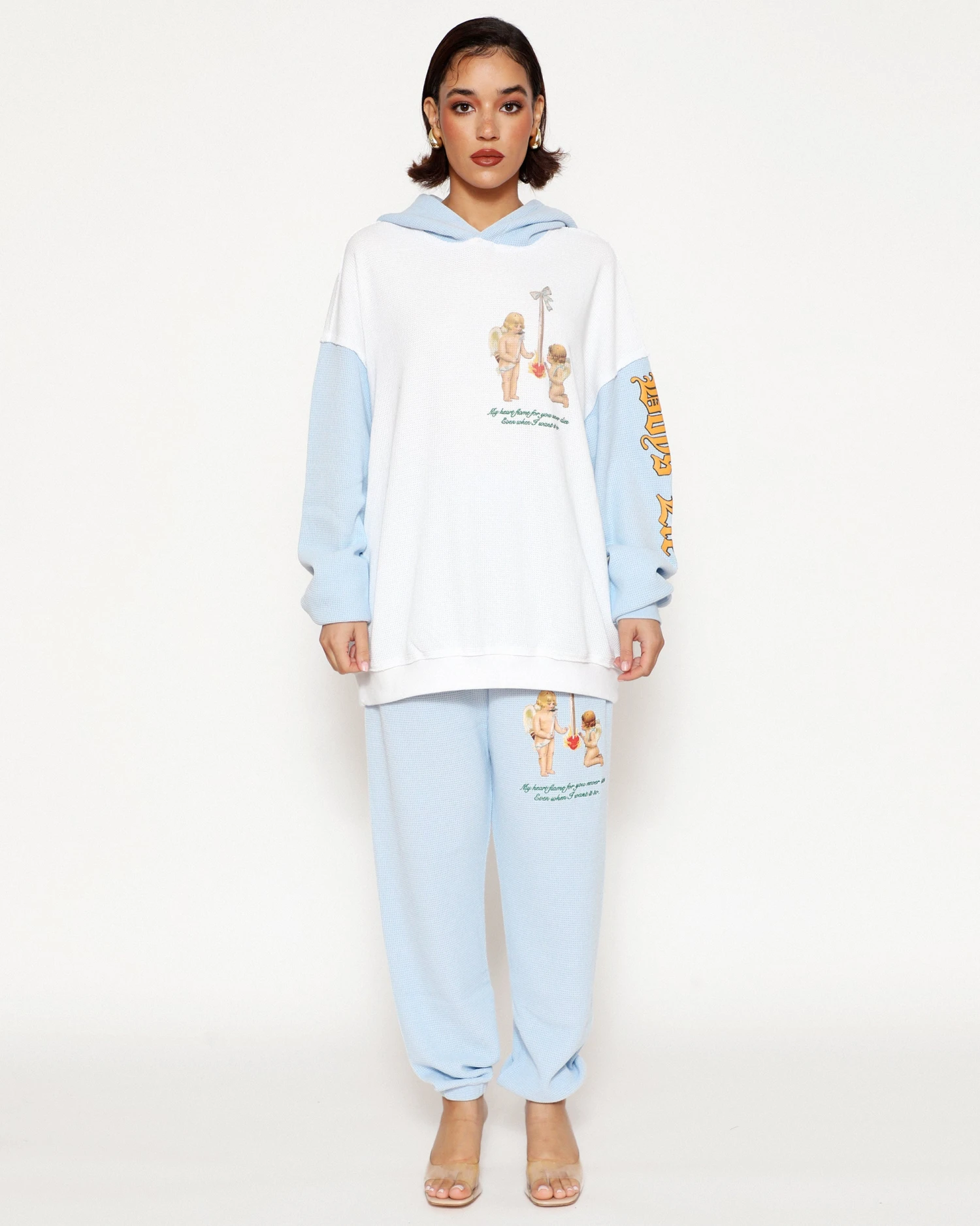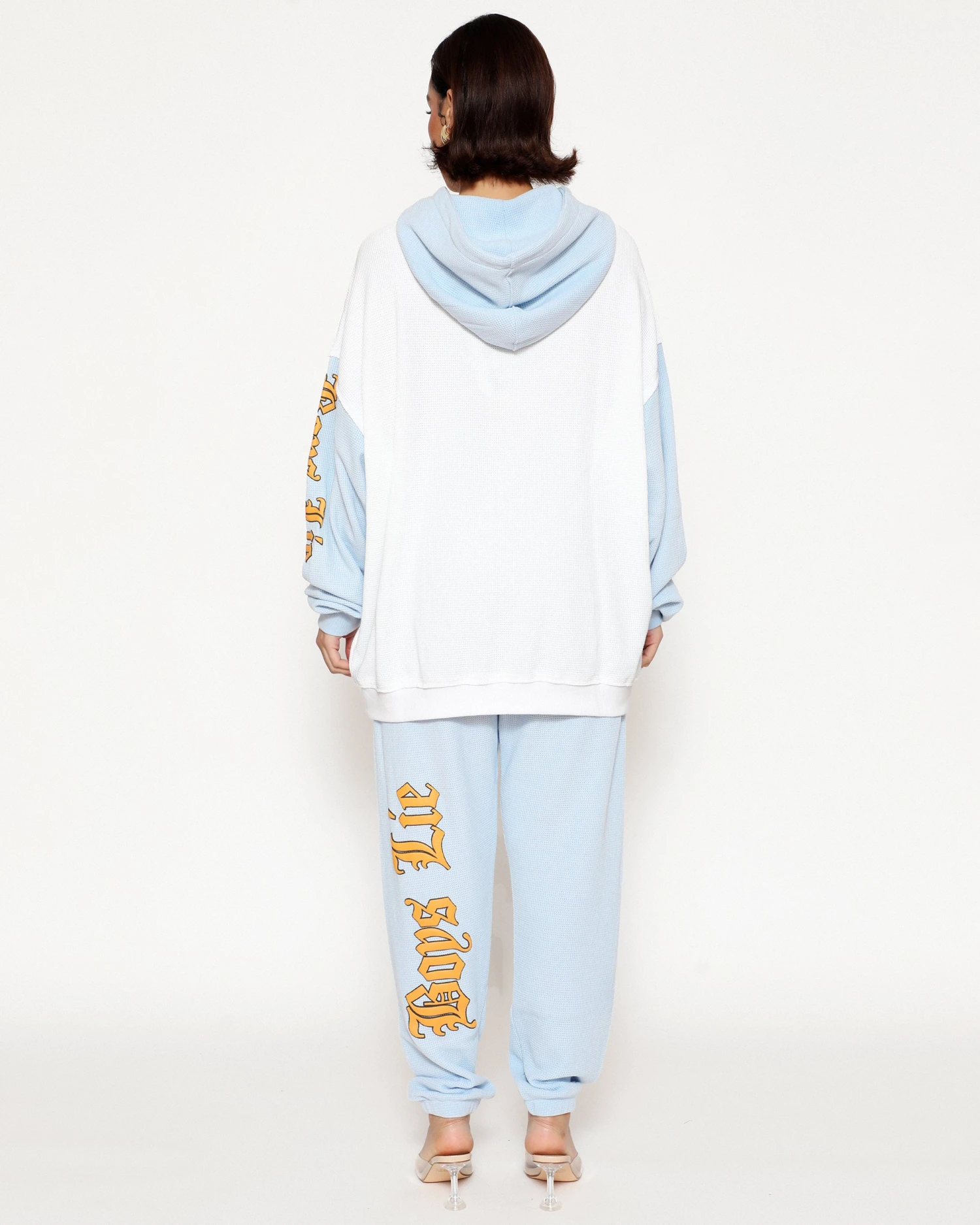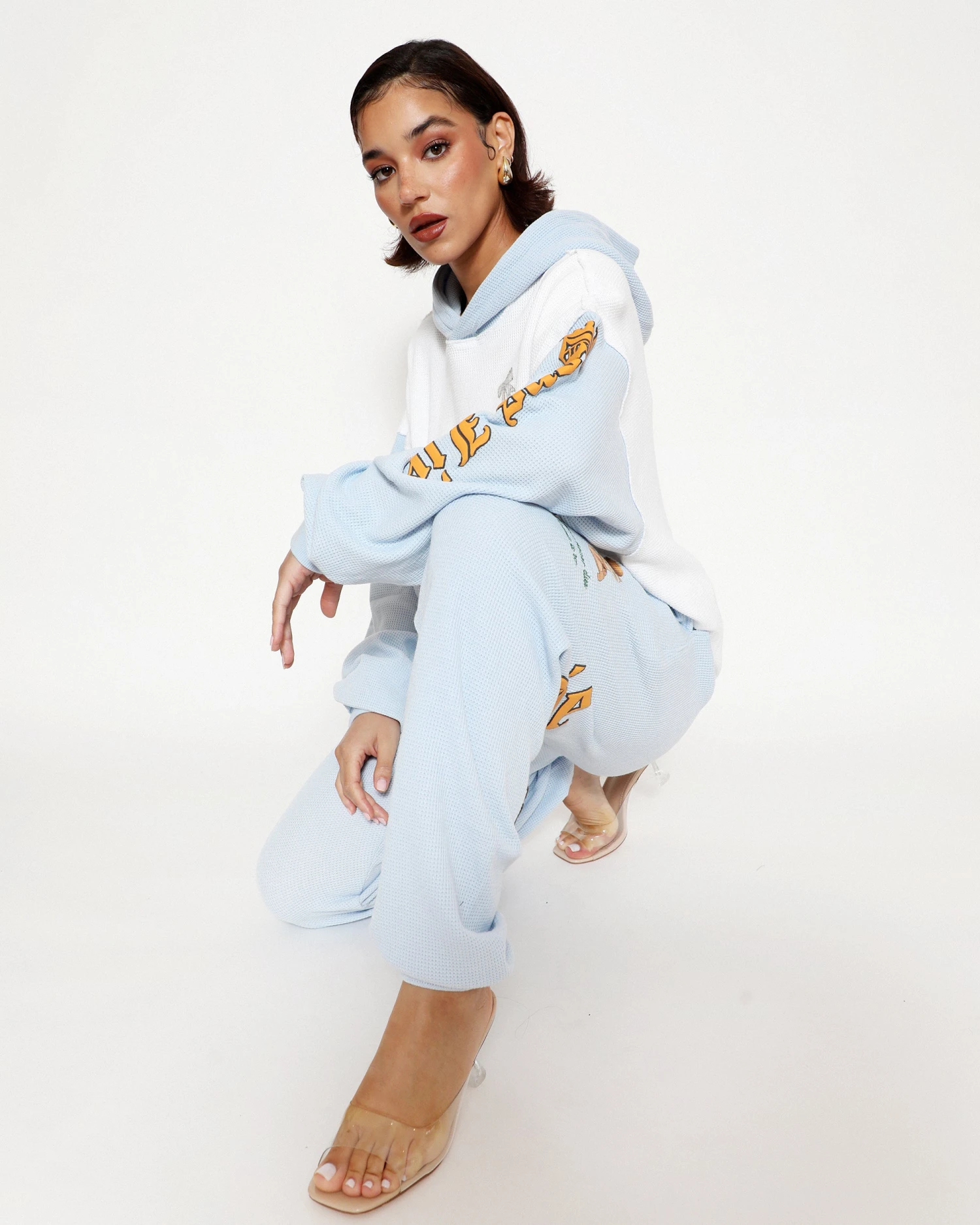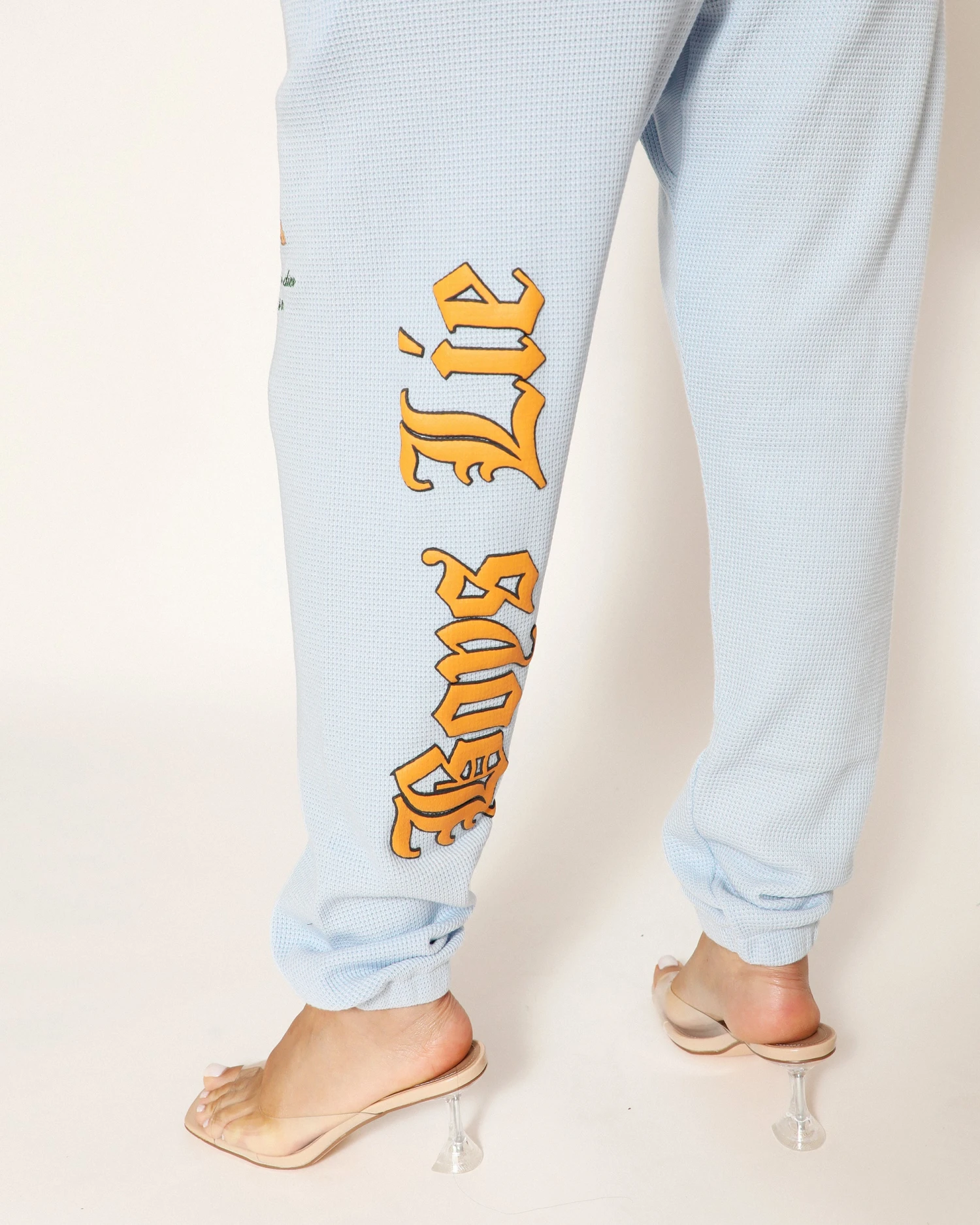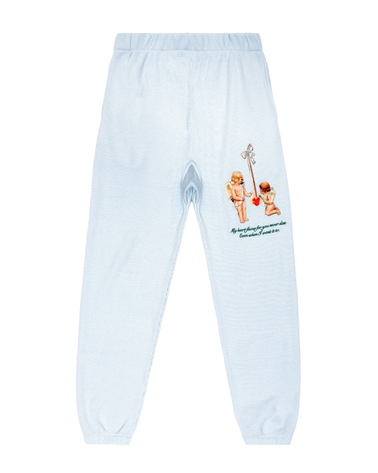 Thermal sweatpants in baby blue. High rise sweatpants with back and side pockets, elastic waistband and cuffs. Embroidered front and printed back graphics.