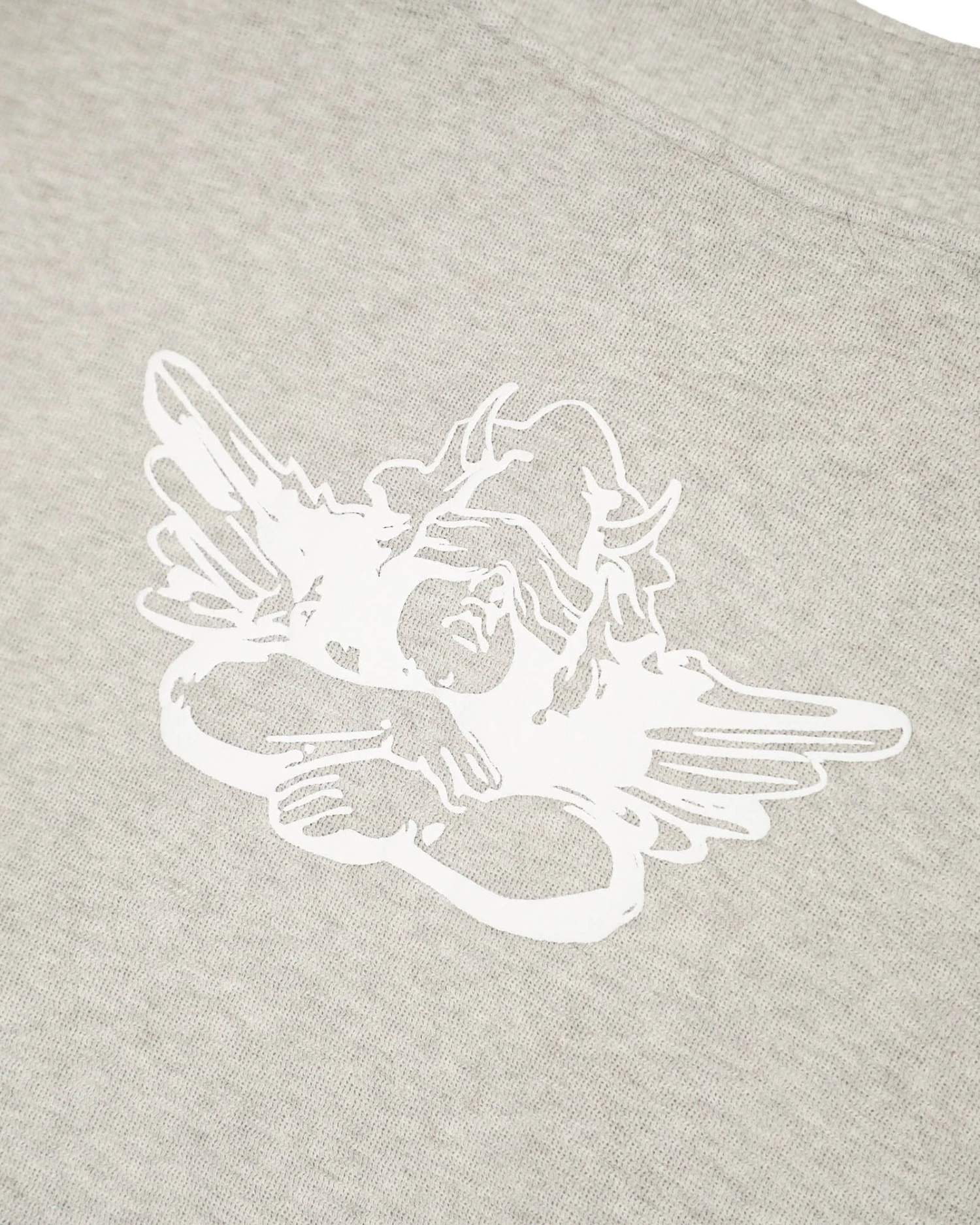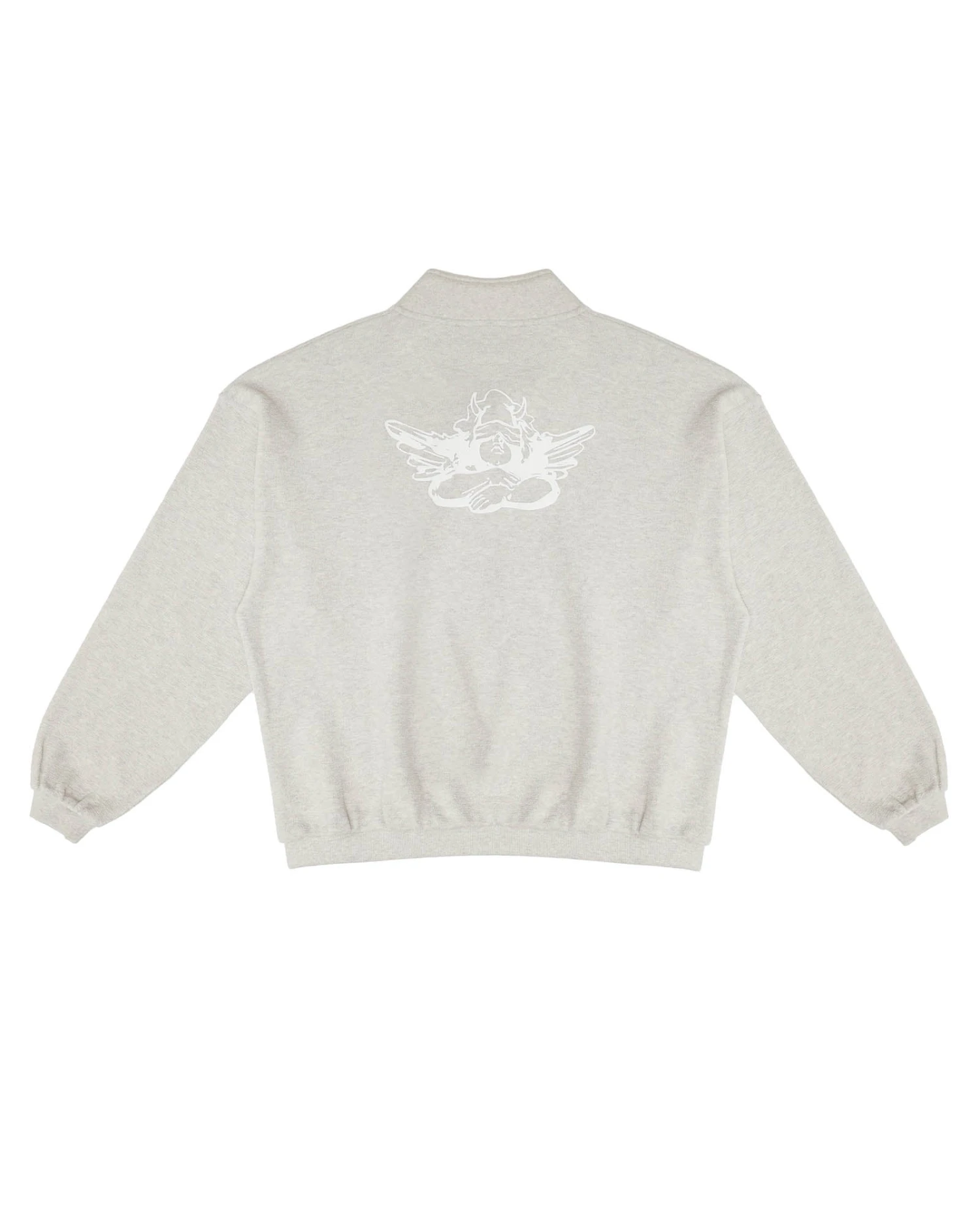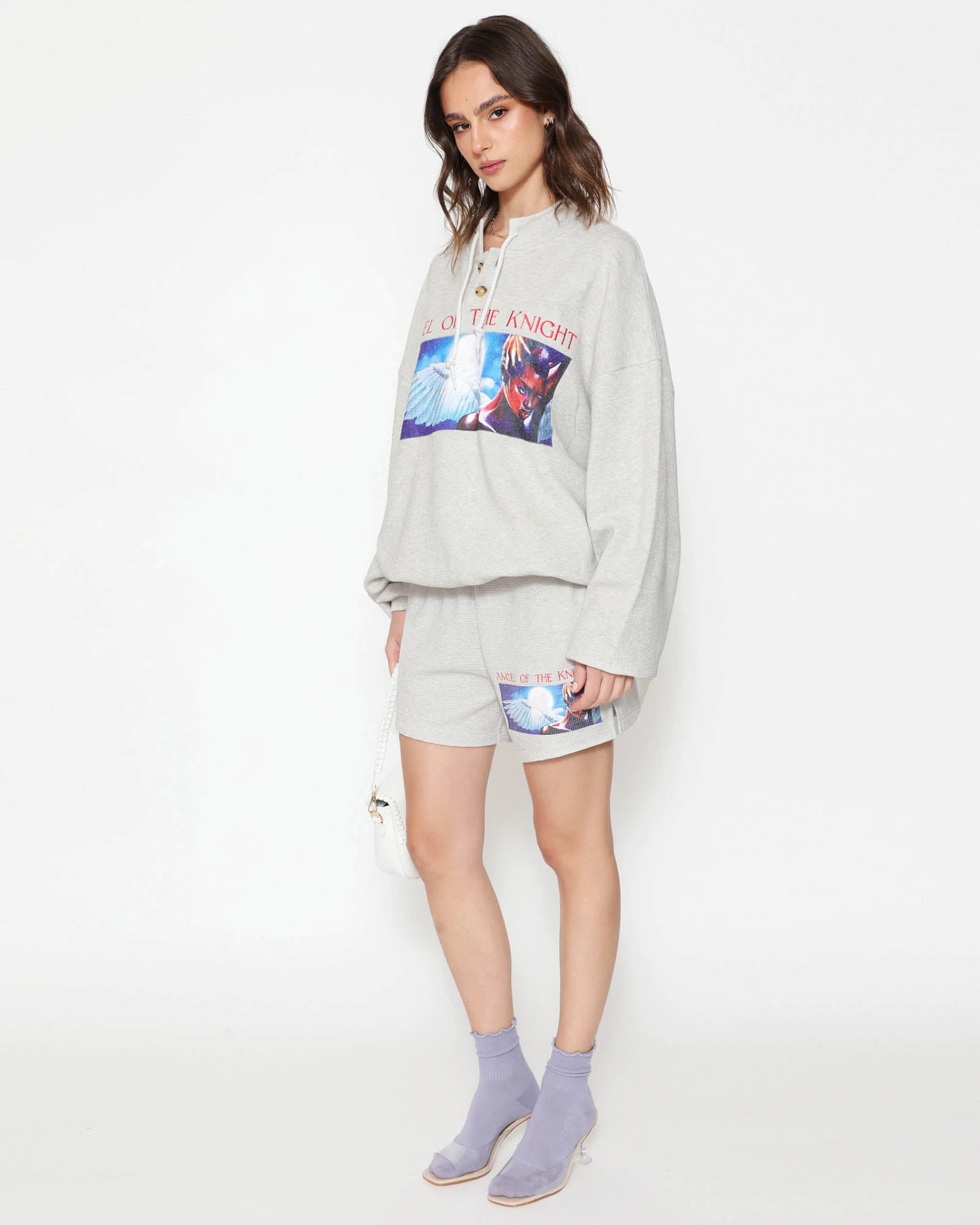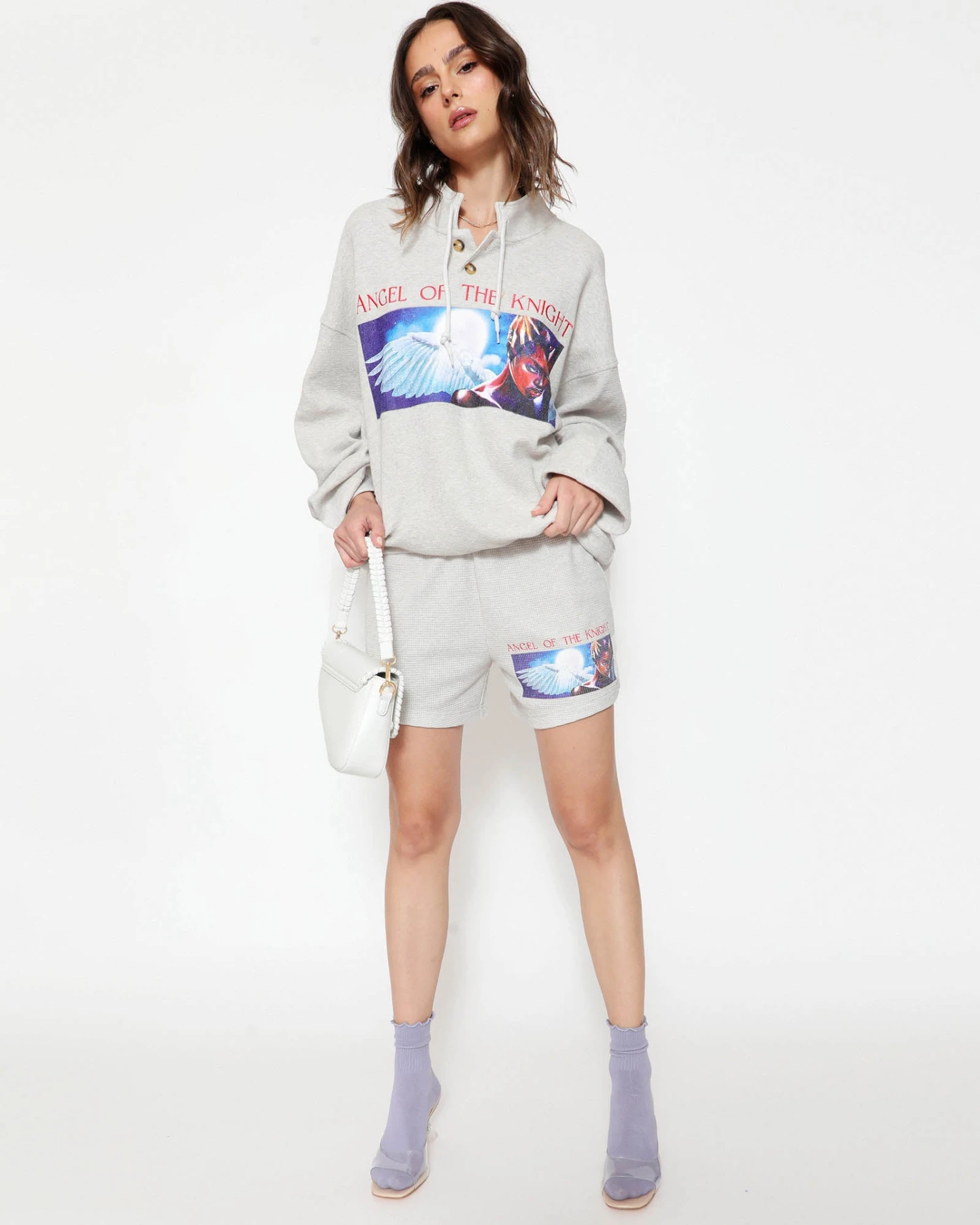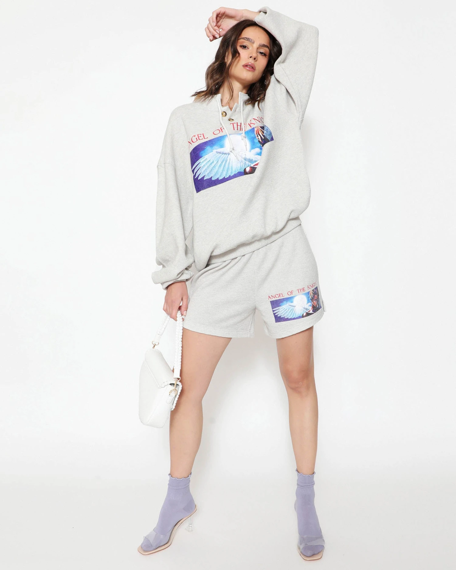 Inside out french terry fabric in heather grey. Henley style crewneck with button details, drawstring, and ribbed cuffs and hem.