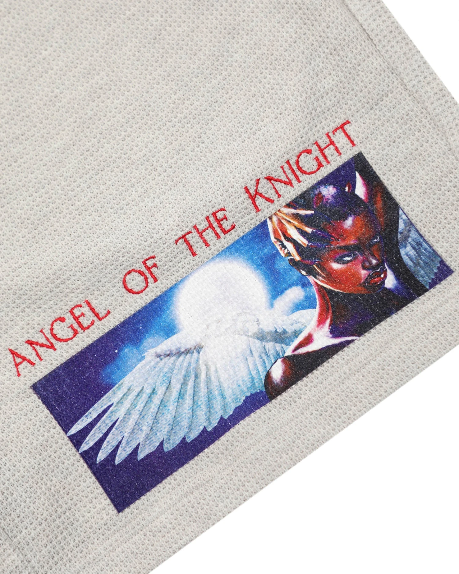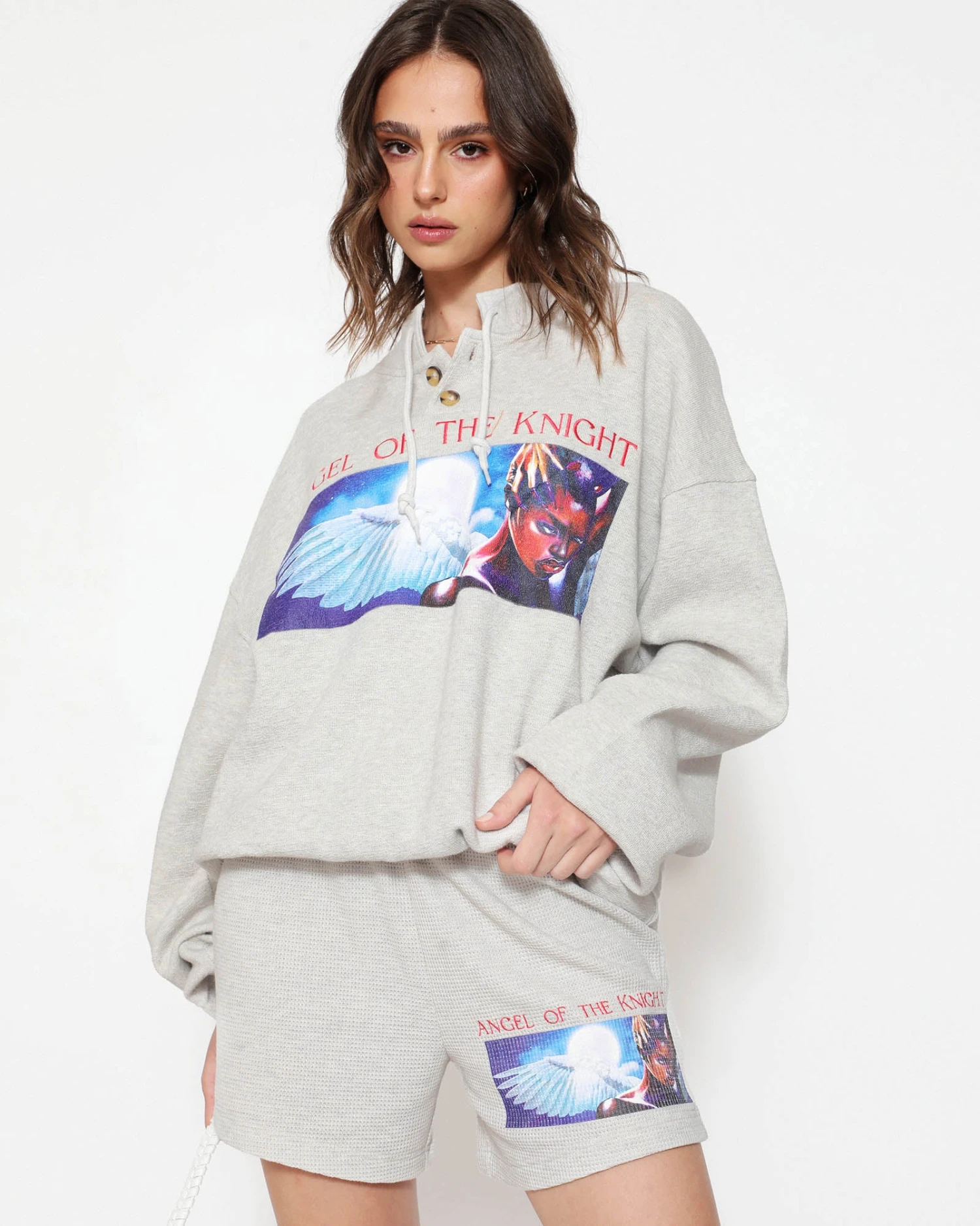 Soft thermal fabric in heather grey. High rise shorts with adjustable drawstring and an oversized fit.