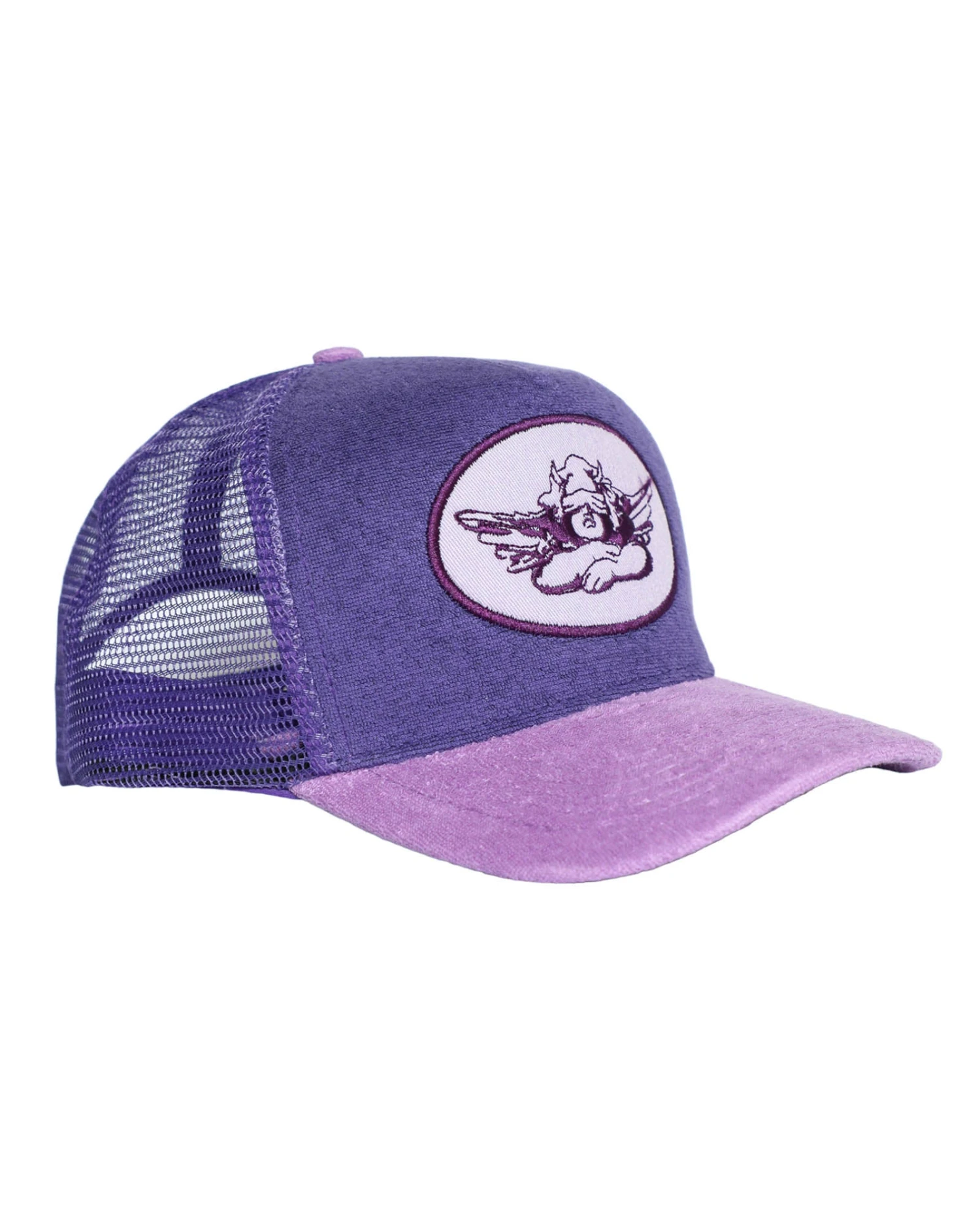 Dark purple trucker hat with lavender patch and purple terry. Adjustable snapback.