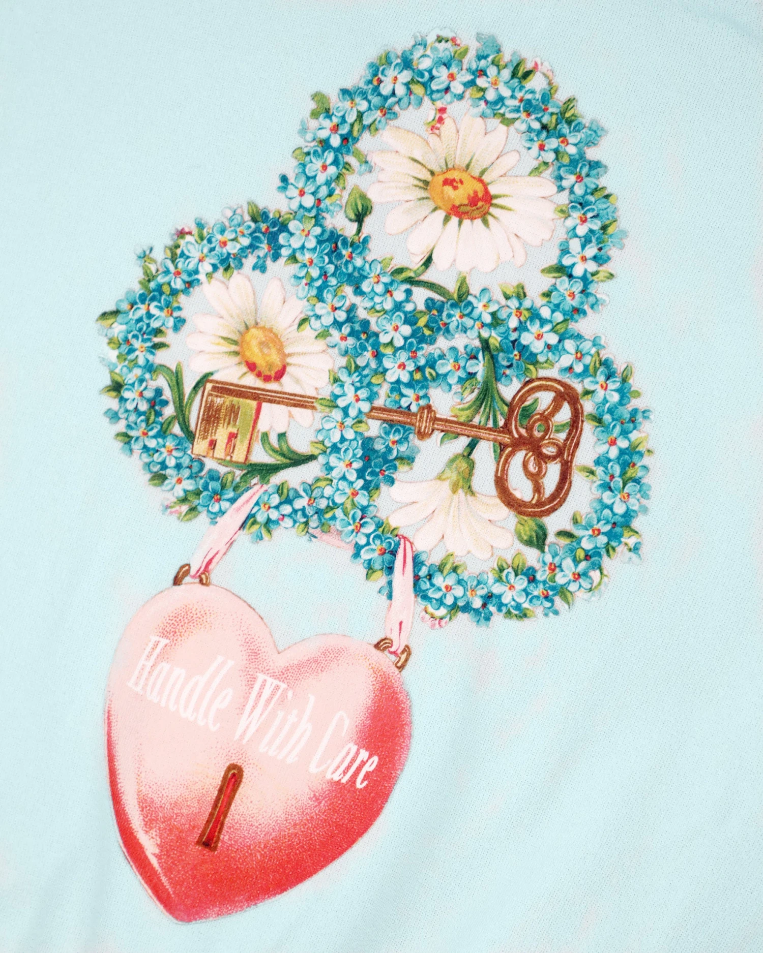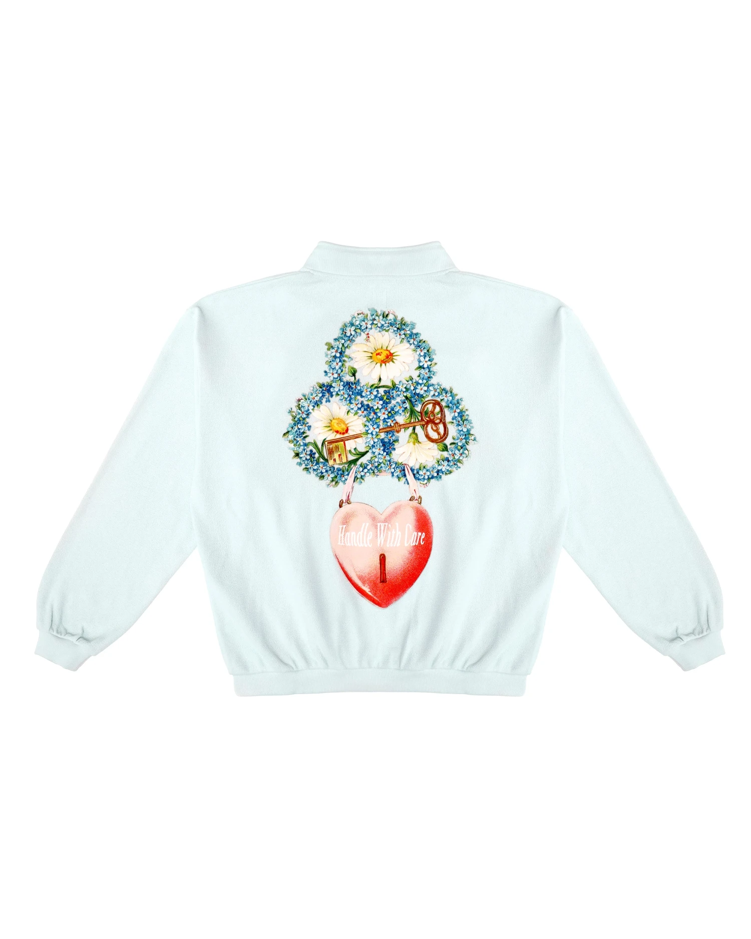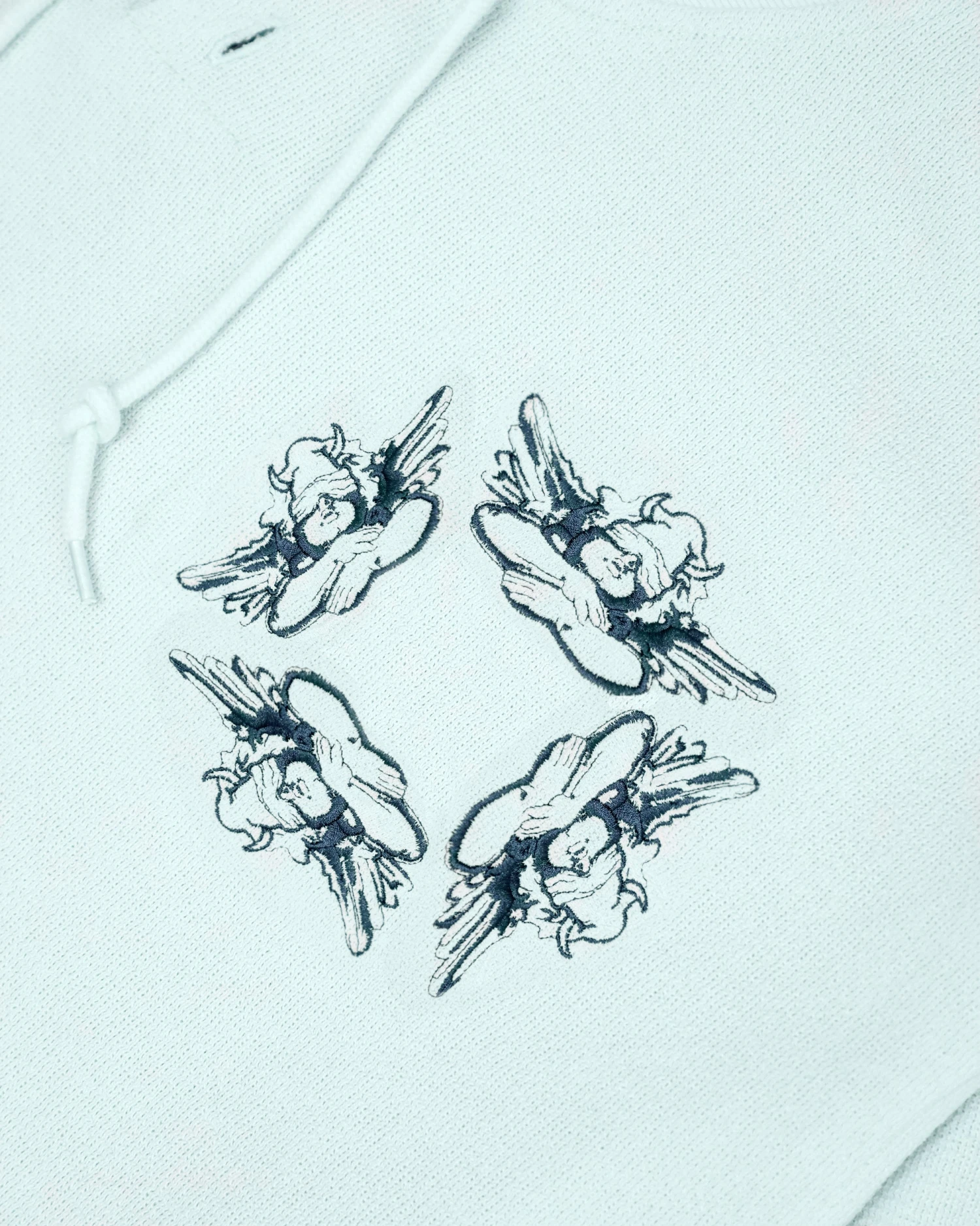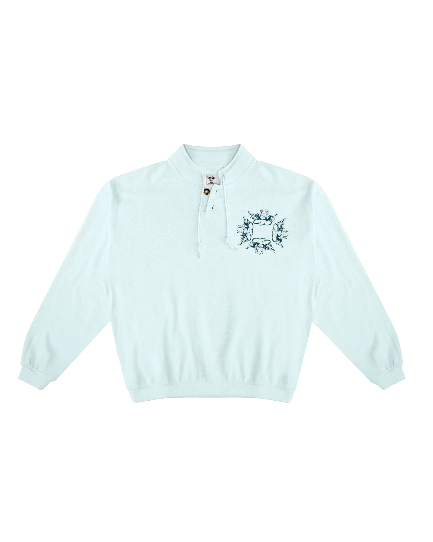 Inside out french terry in light teal. Henley style crewneck with button details, drawstring, and ribbed cuffs and hem. Features embroidered logos.