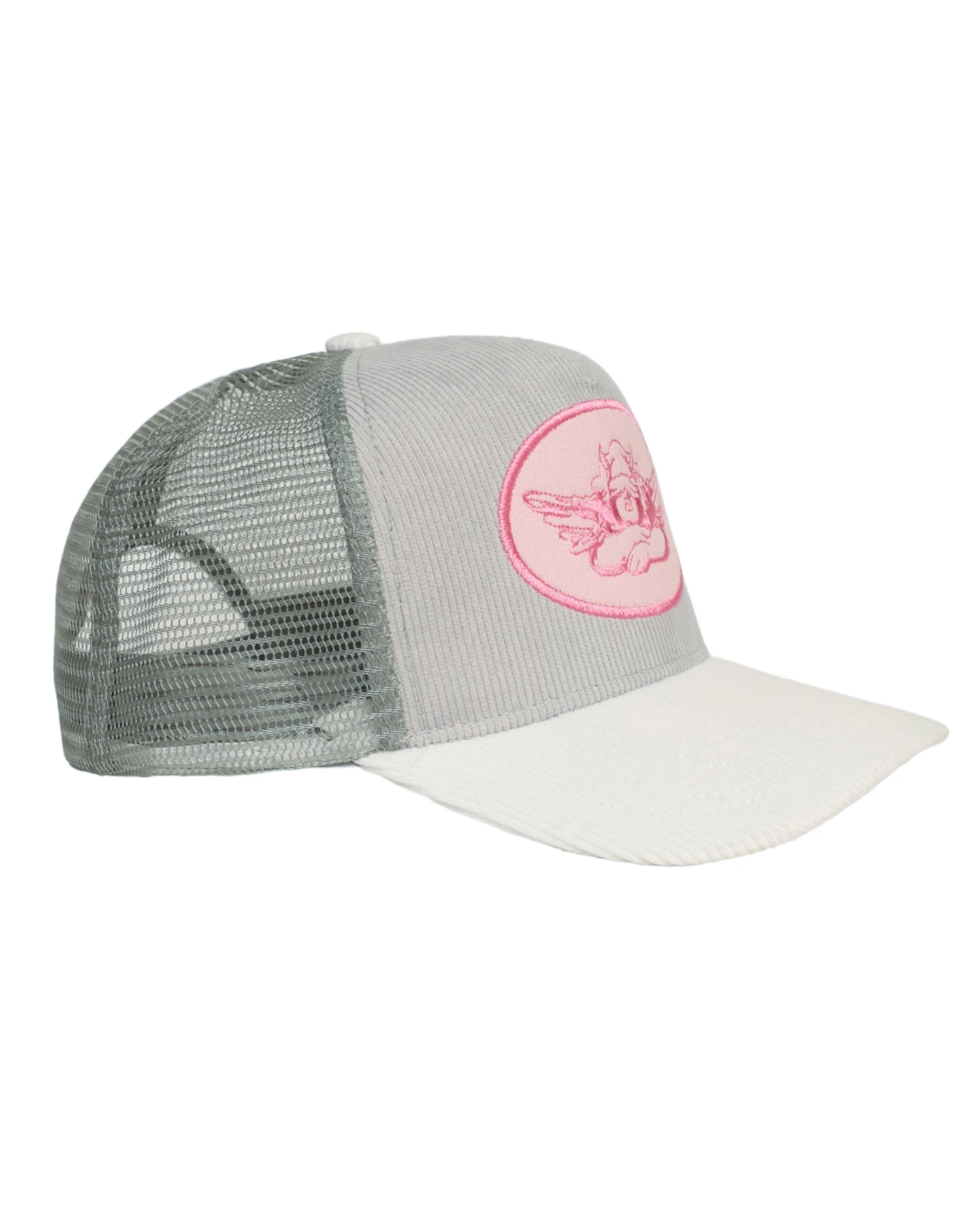 Grey trucker hat with pink patch and grey corduroy. Adjustable snapback.