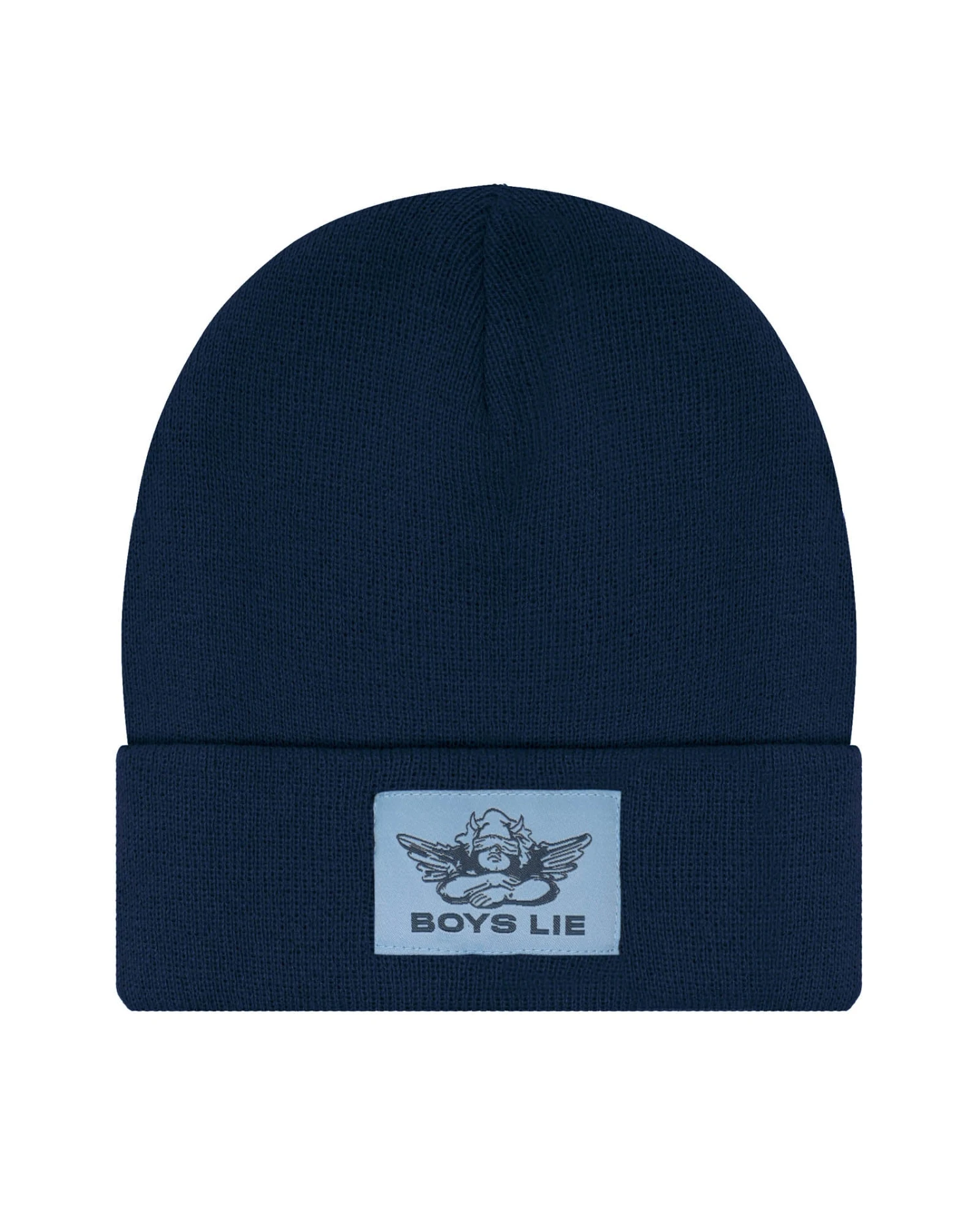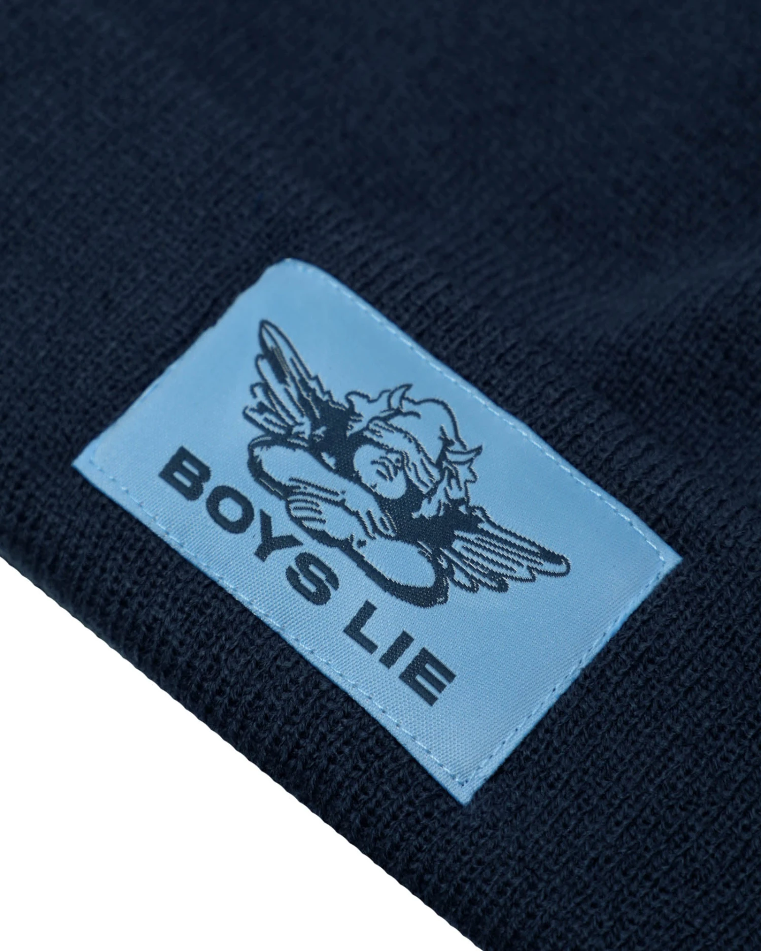Blue beanie with monochromatic blue Boys Lie logo patch.