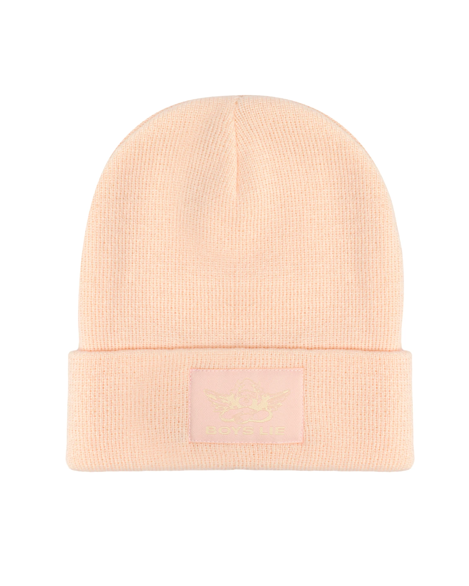 Blush beanie with monochromatic cream Boys Lie logo patch.