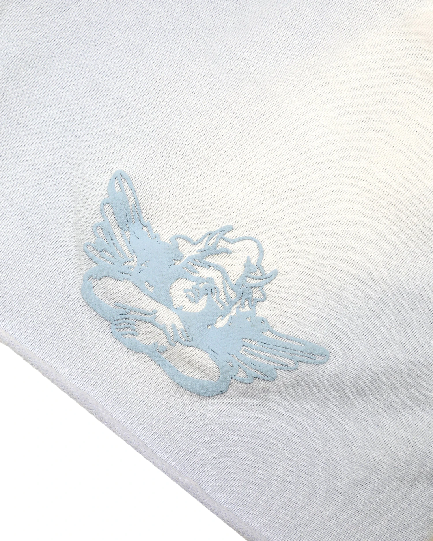 Lightweight french terry fabric in baby blue with potassium dye. High-rise shorts with thick waistband, adjustable drawstring, side pockets, and raw edge hem. Features puff print detail.