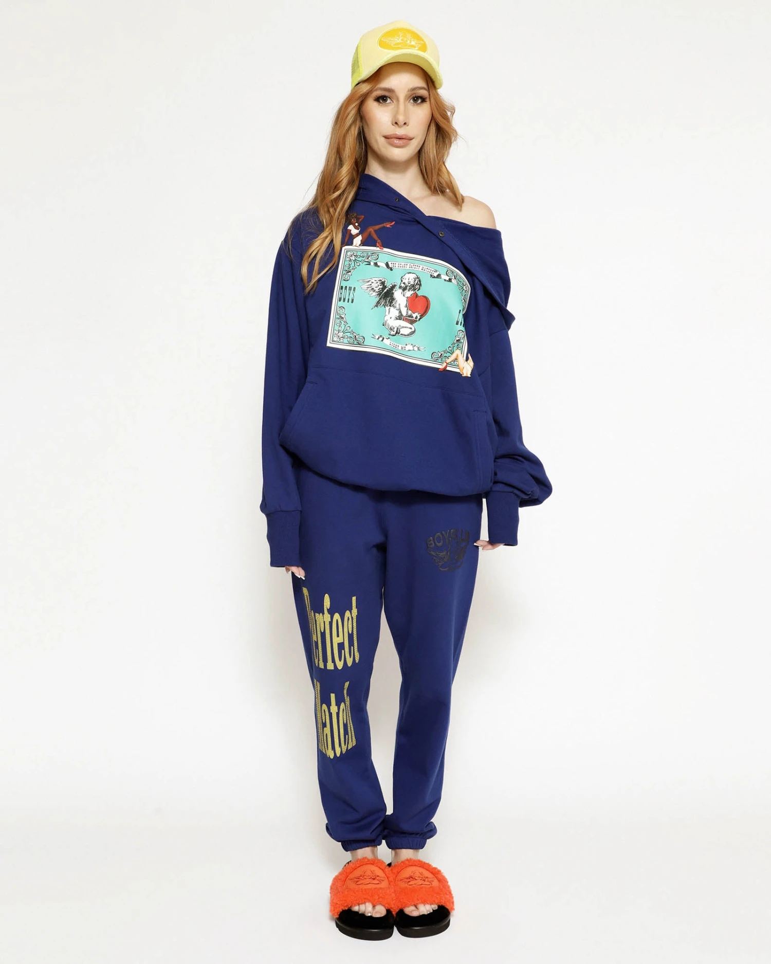 Lightweight fleece hoodie in dark navy blue with rhinestone embellishments and puff print details. Oversized hood with snap closure and front pocket.