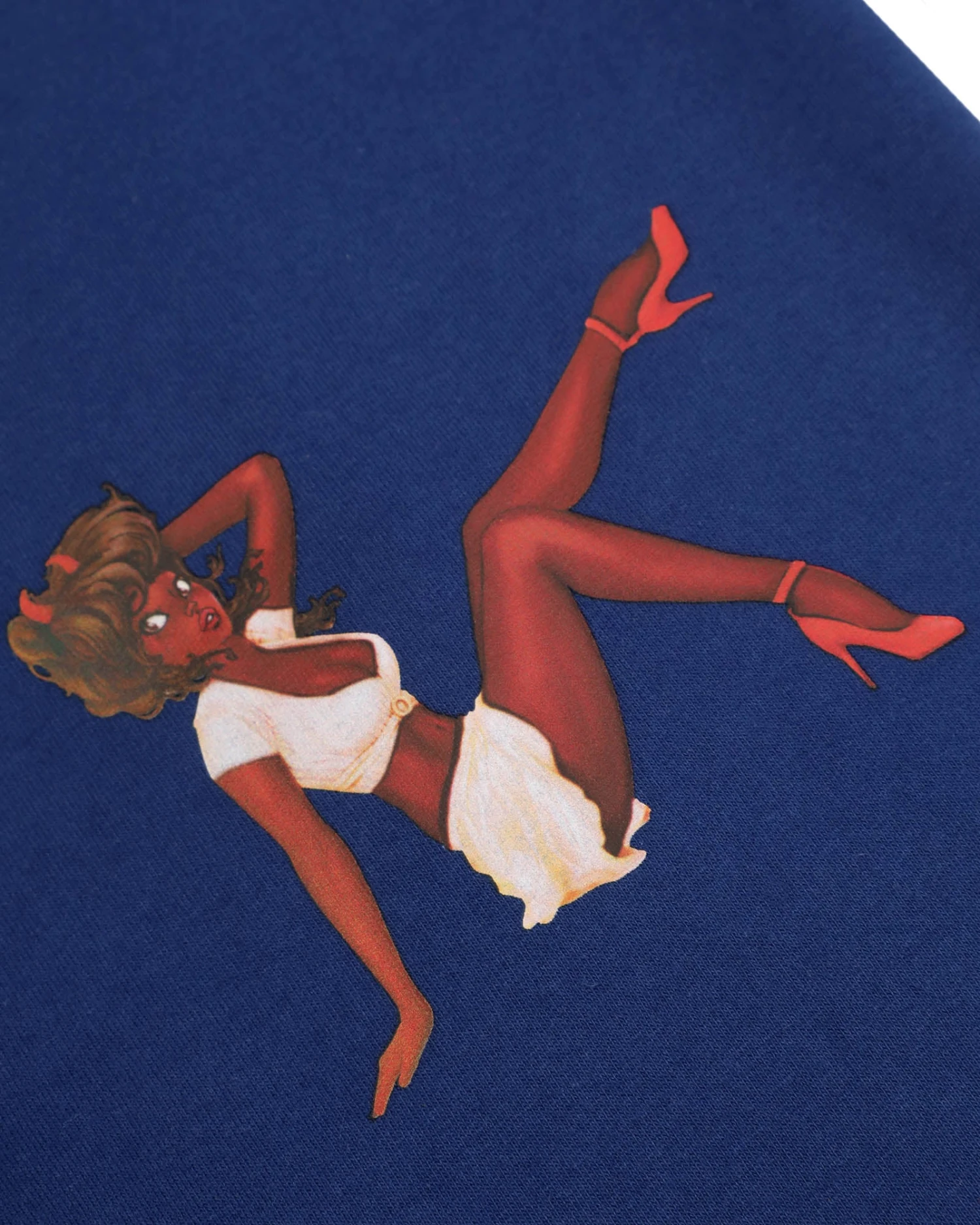 Lightweight fleece fabric in navy blue with rhinestone embellishments. High rise sweatpants with back and side pockets, elastic waistband and cuffs.