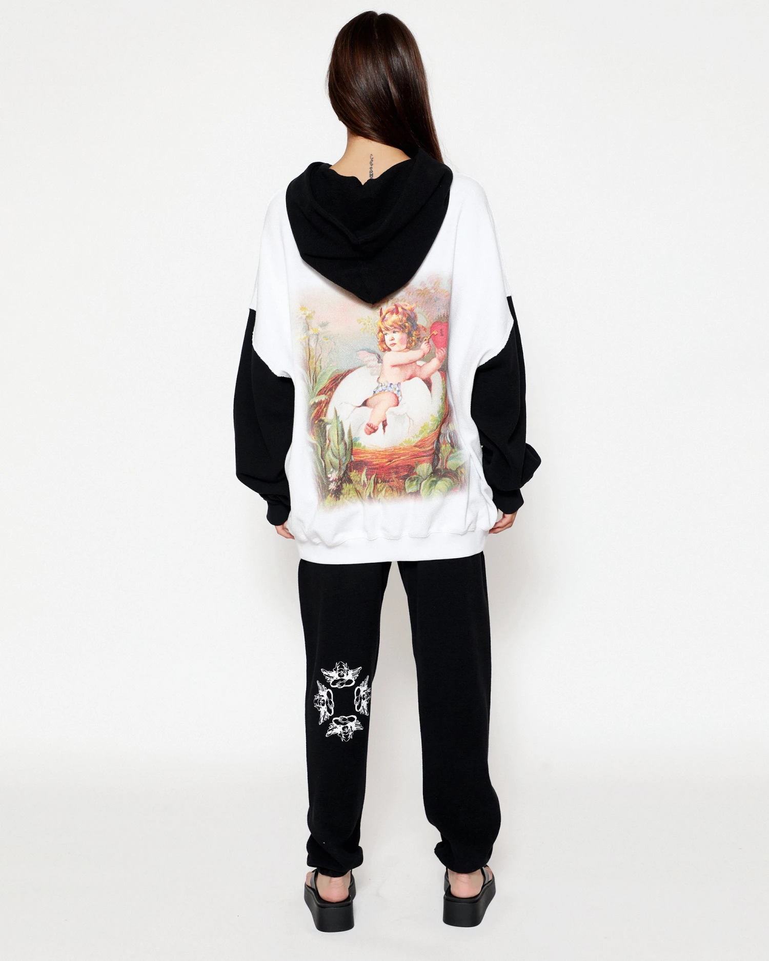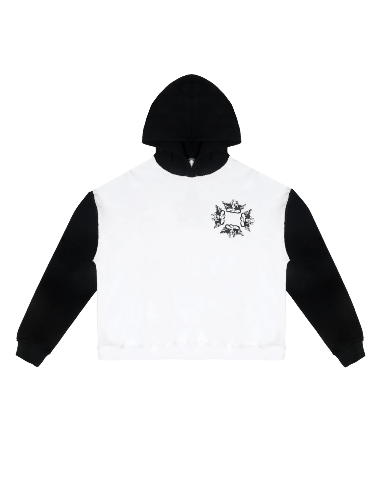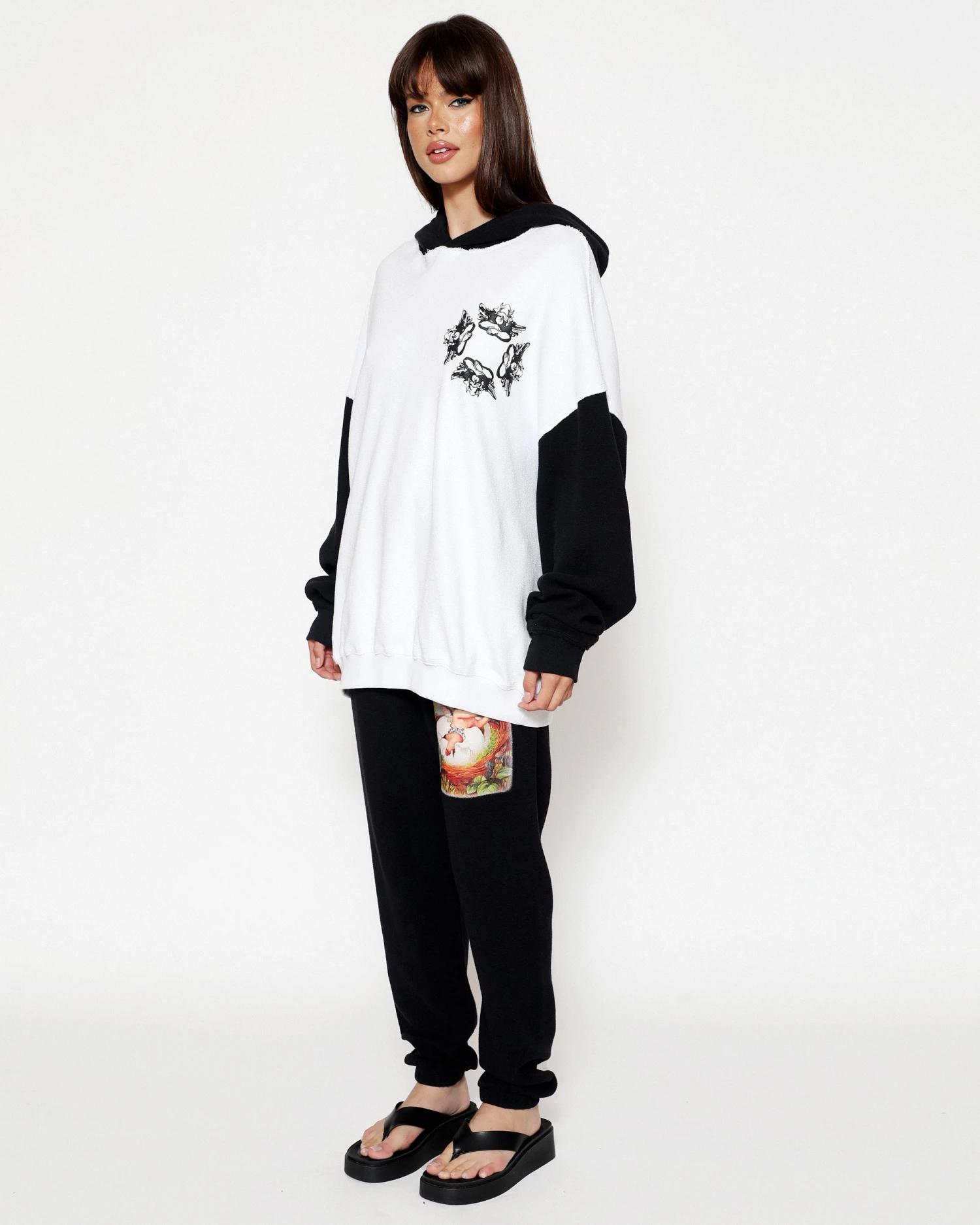 Inside out french terry fabric in white and black. Oversized hoodie featuring a dramatic hood and front and back printed graphics.