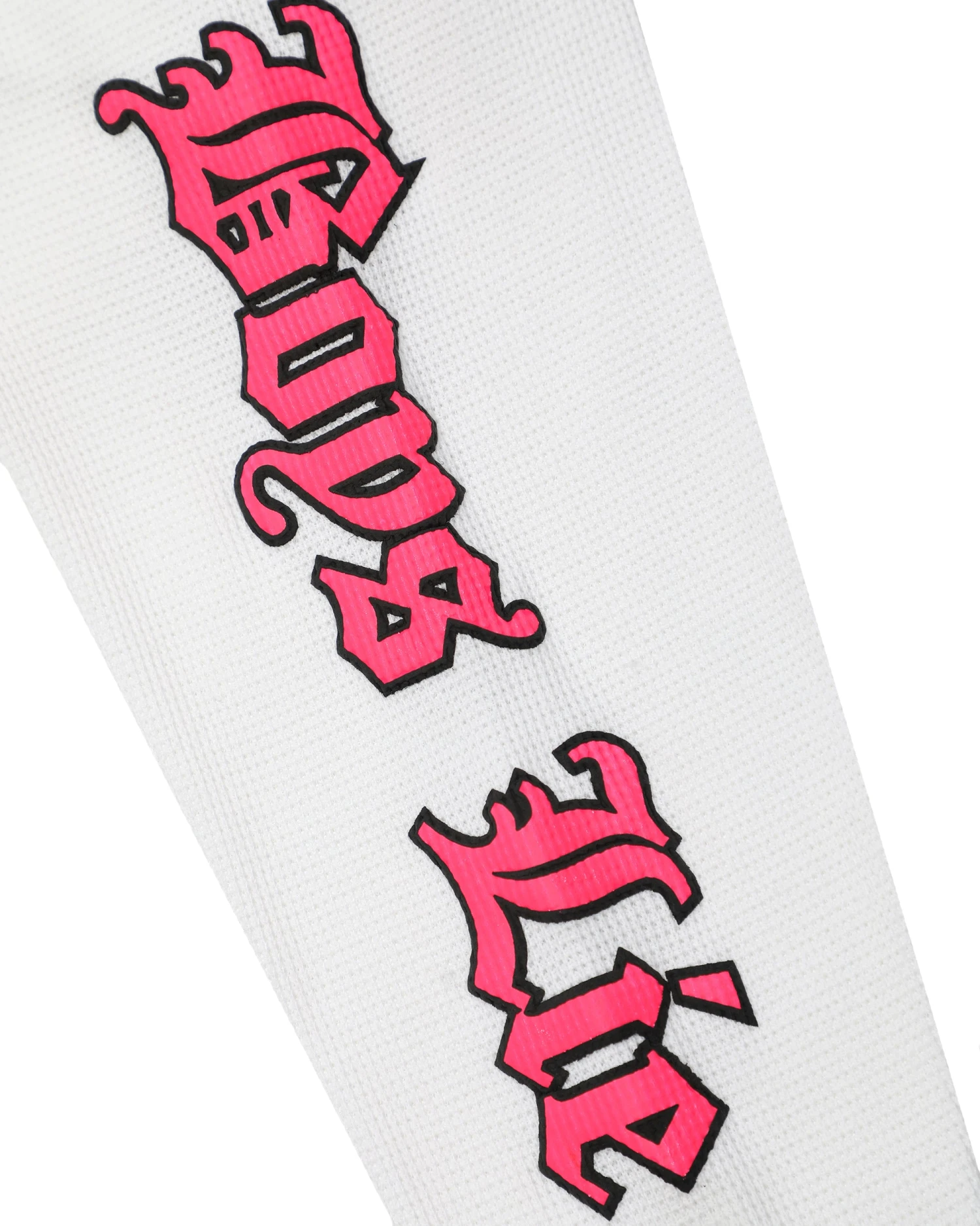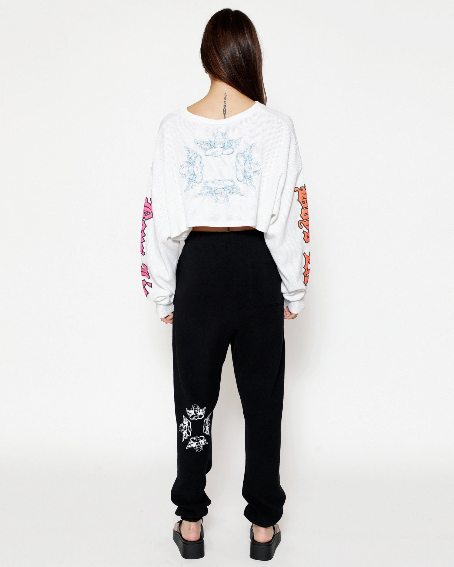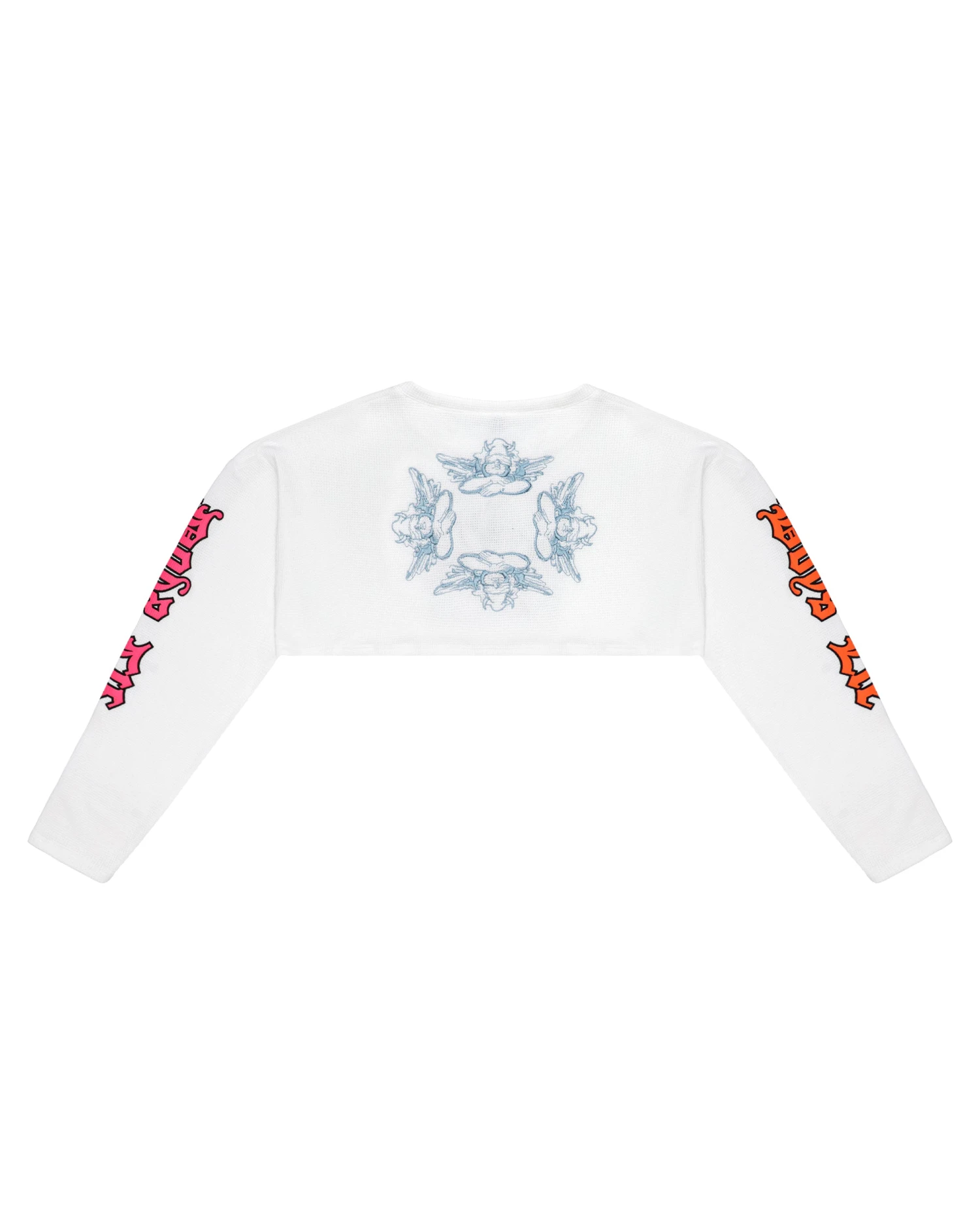 Oversized cropped longsleeve in white. Printed front graphic and sleeves with embroidered back logo.