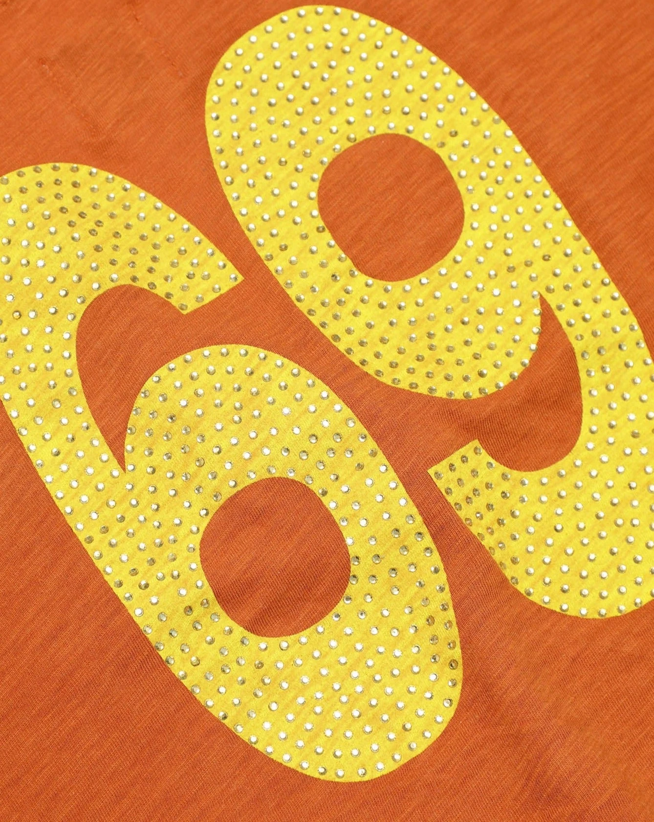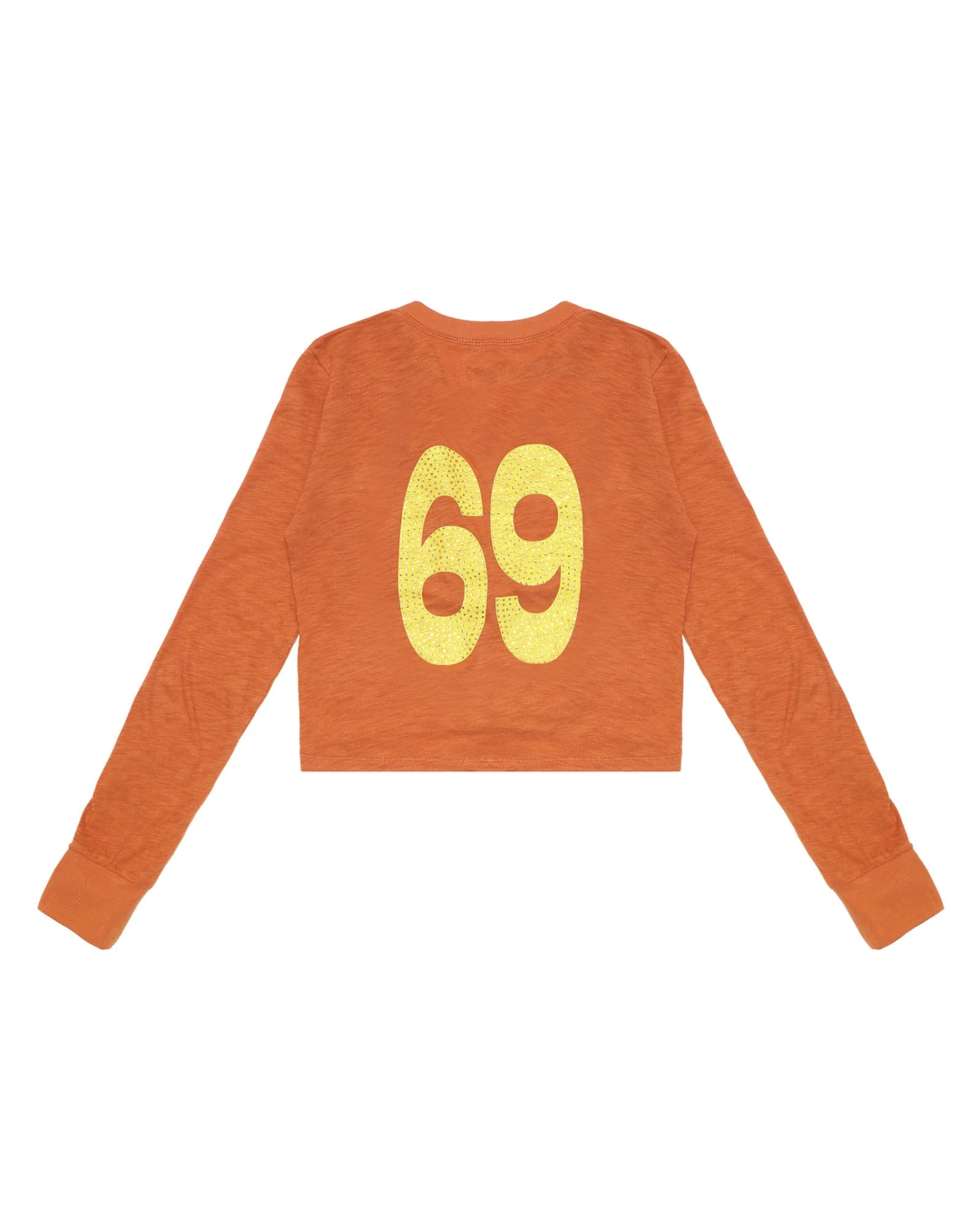 Burnt orange cropped henley long sleeve with button details and rhinestone embellishments.