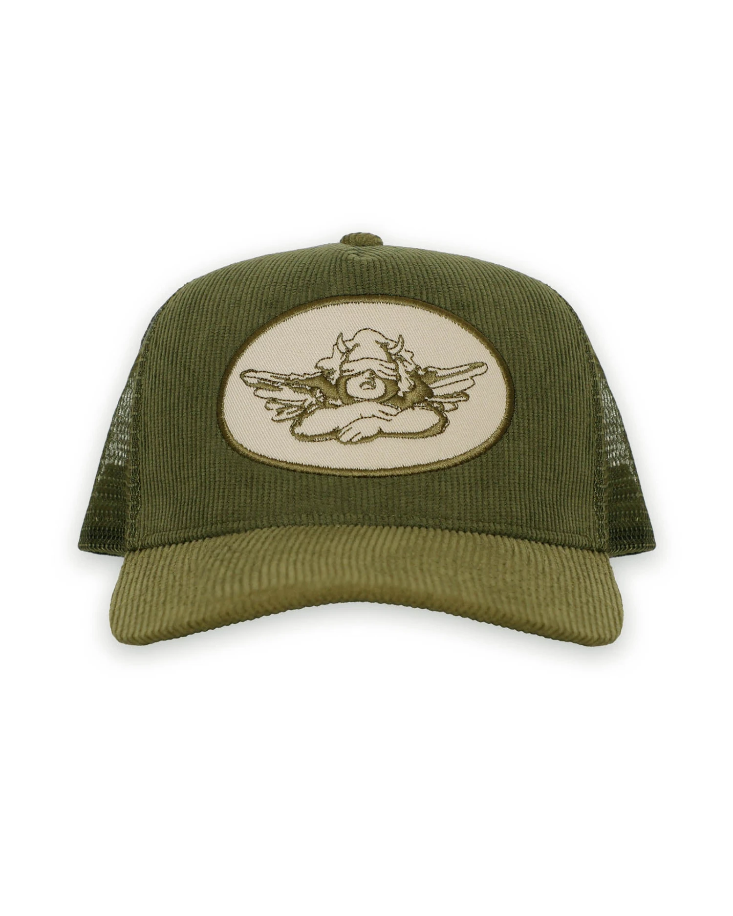 Olive green trucker hat with light green patch and olive corduroy. Adjustable snapback.