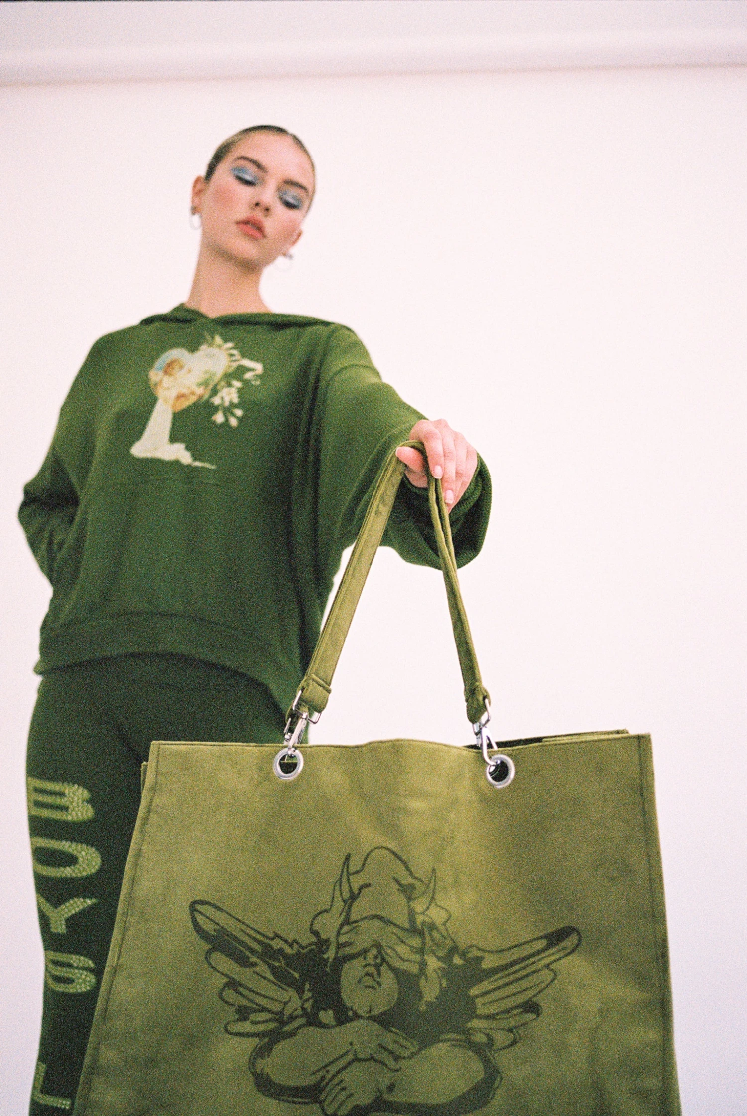 Oversized olive green velour structured tote. Small interior pocket, silver hardware, and magnetic closure.