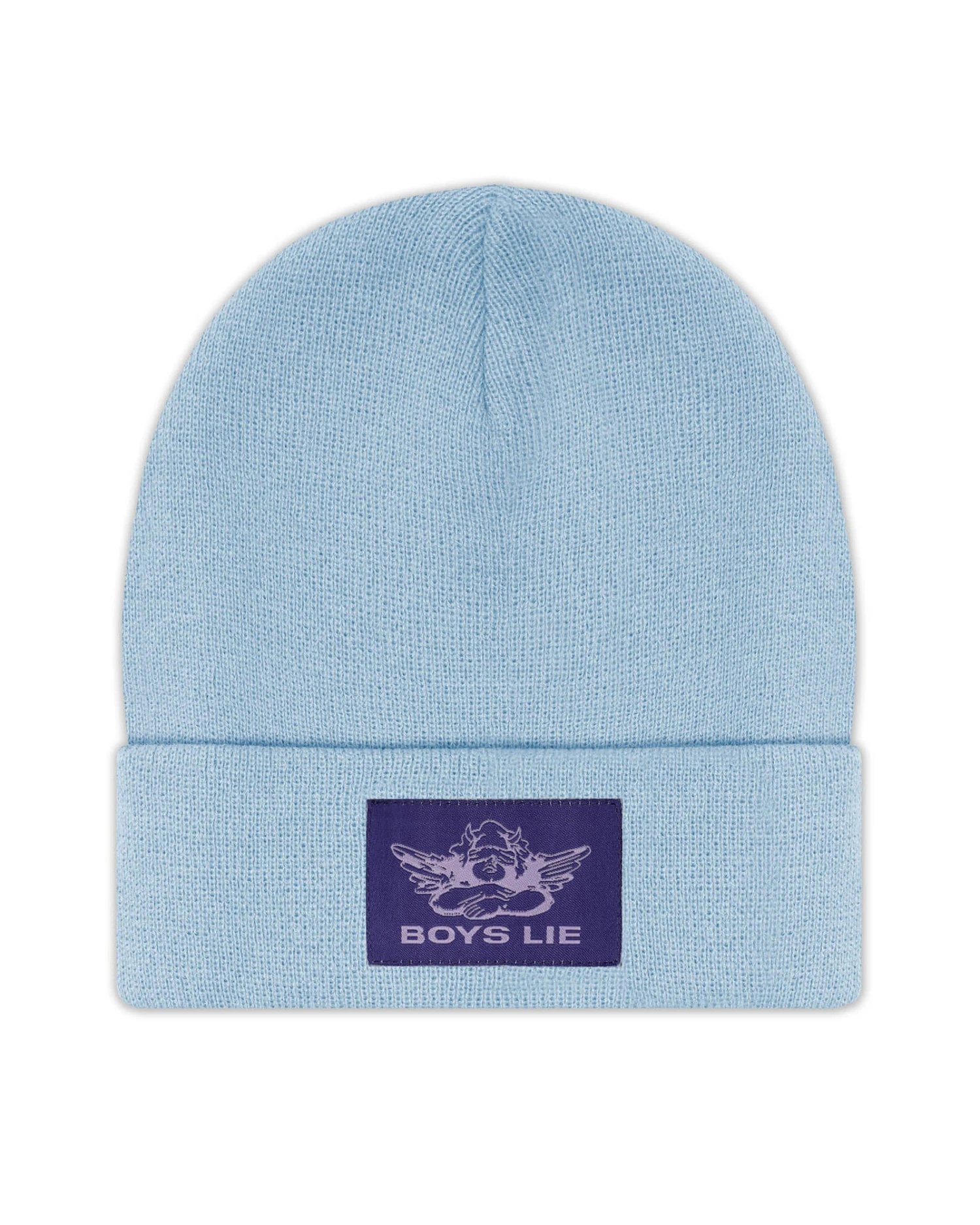 Light blue beanie with purple Boys Lie logo patch.