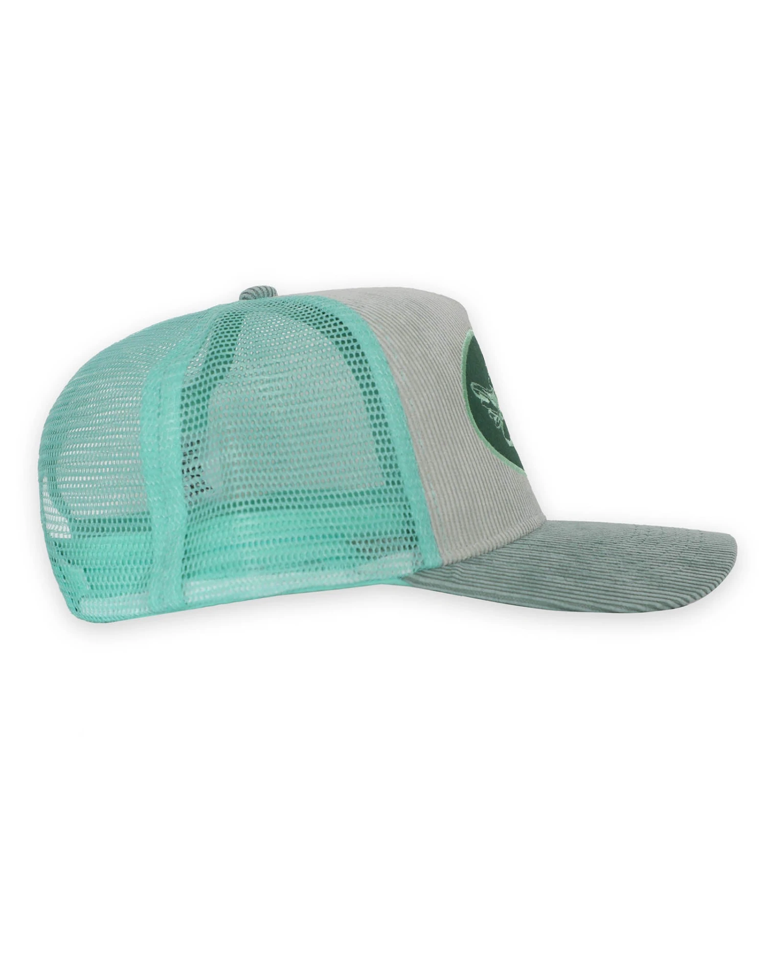 Aquamarine trucker hat with green patch and pale blue/grey corduroy. Adjustable snapback.