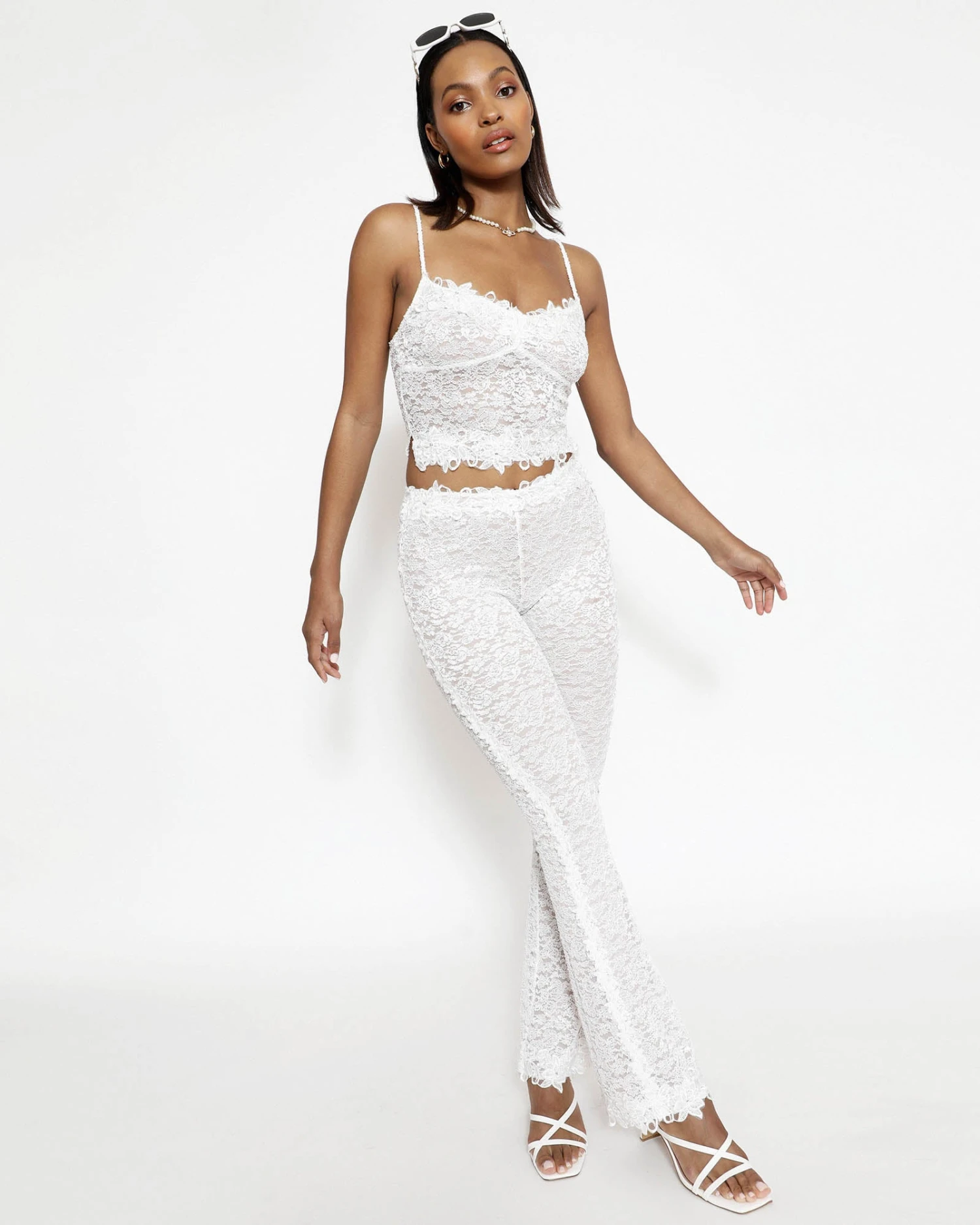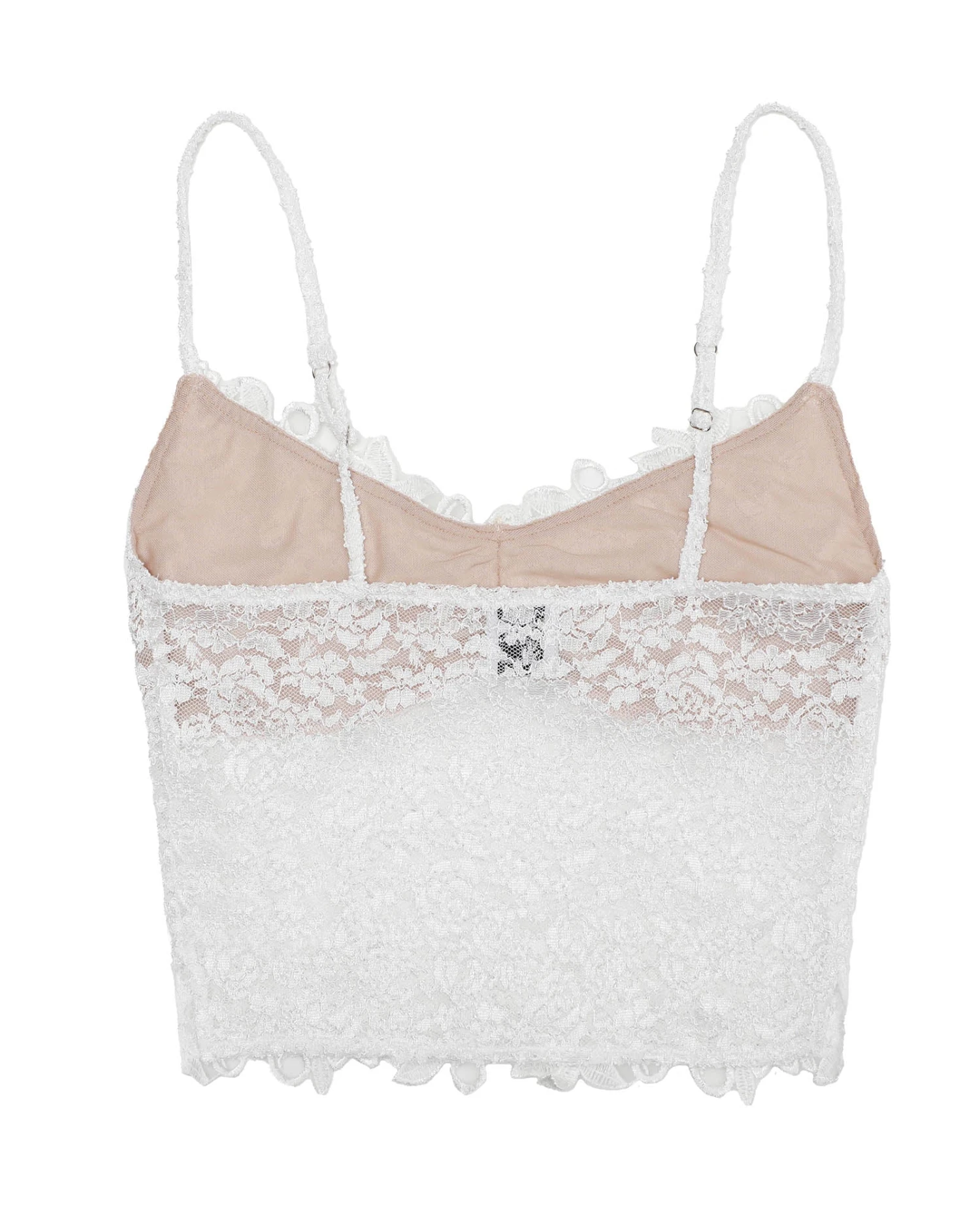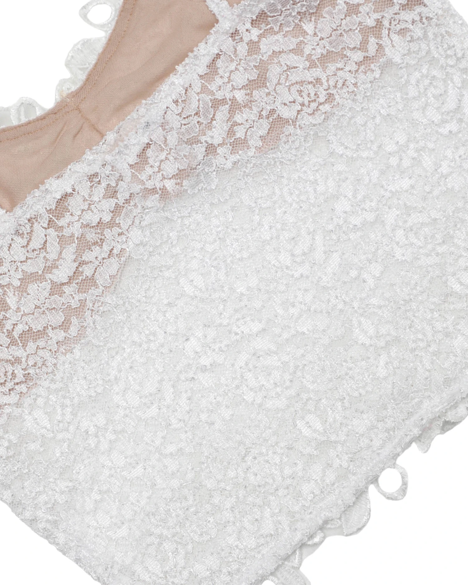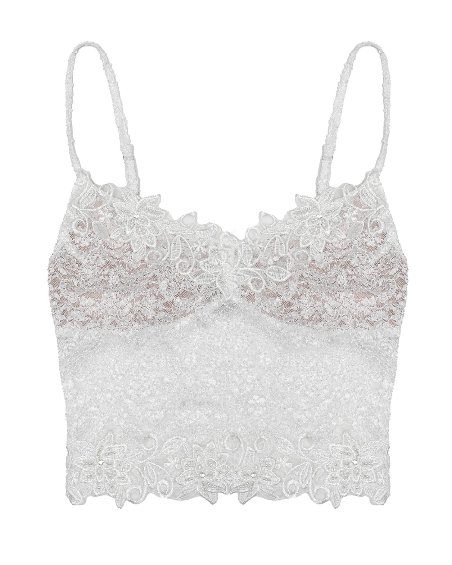 Sheer lace white crop top with low neckline, floral beaded trim, small side splits, and adjustable straps. Featured nude lining at bust.