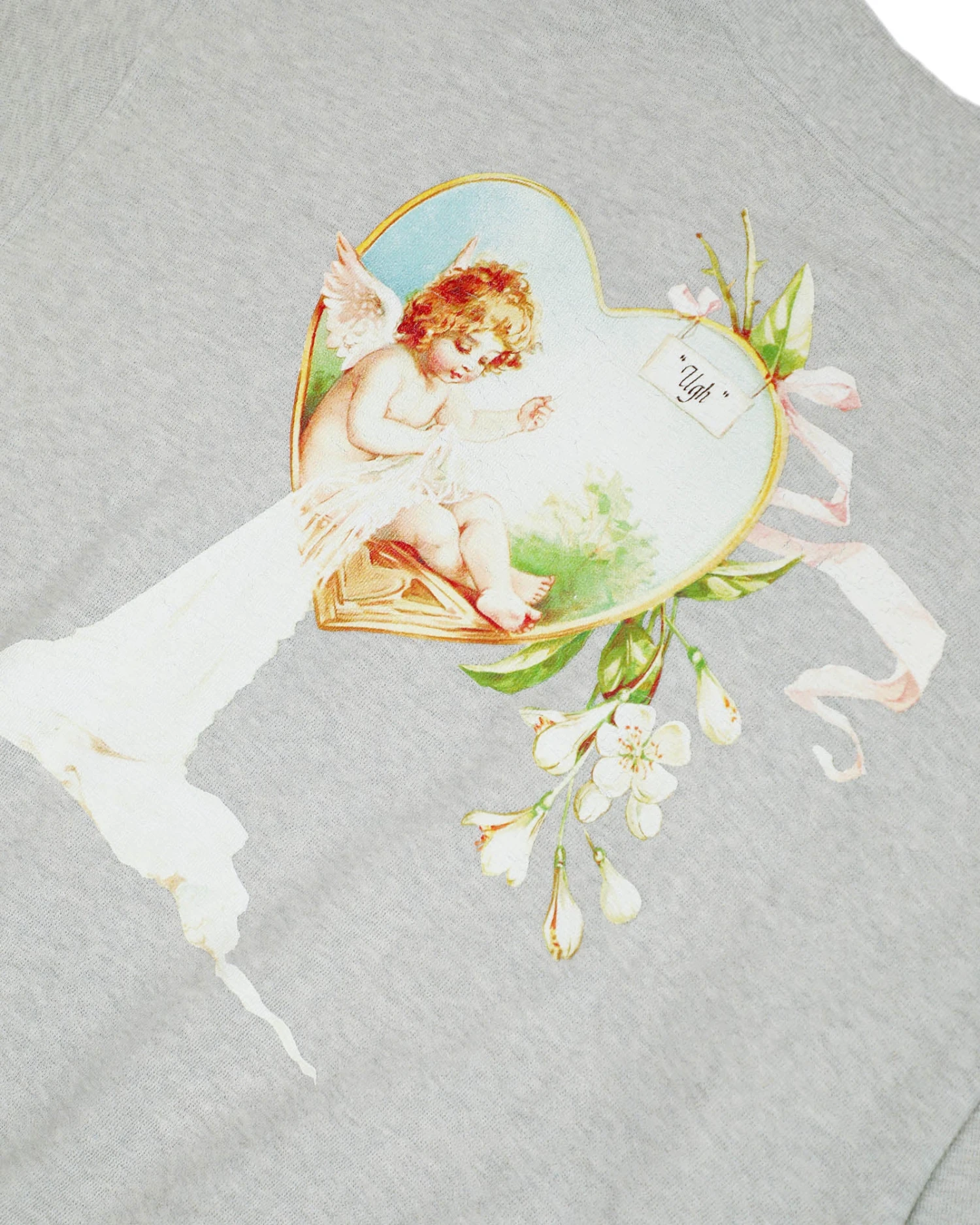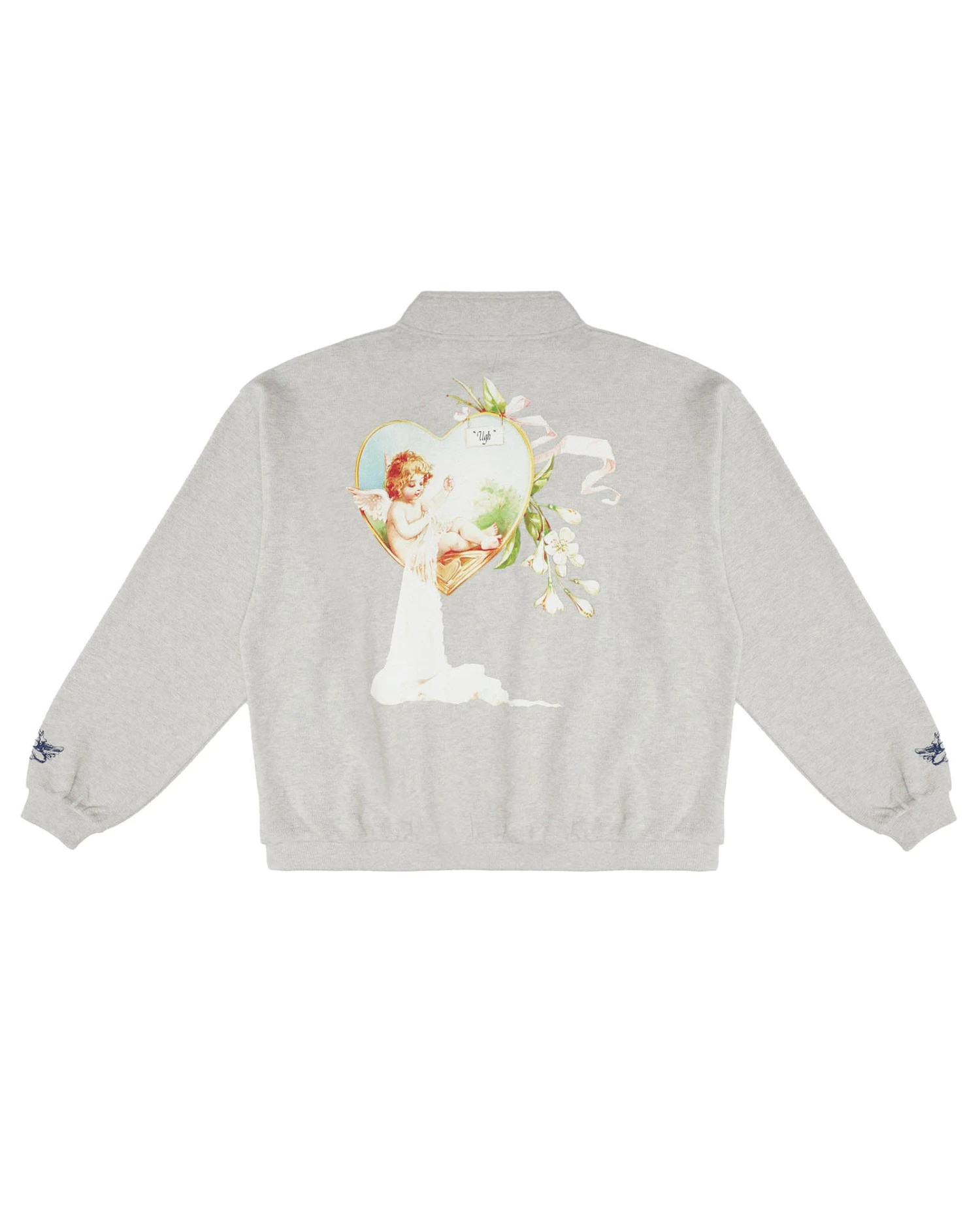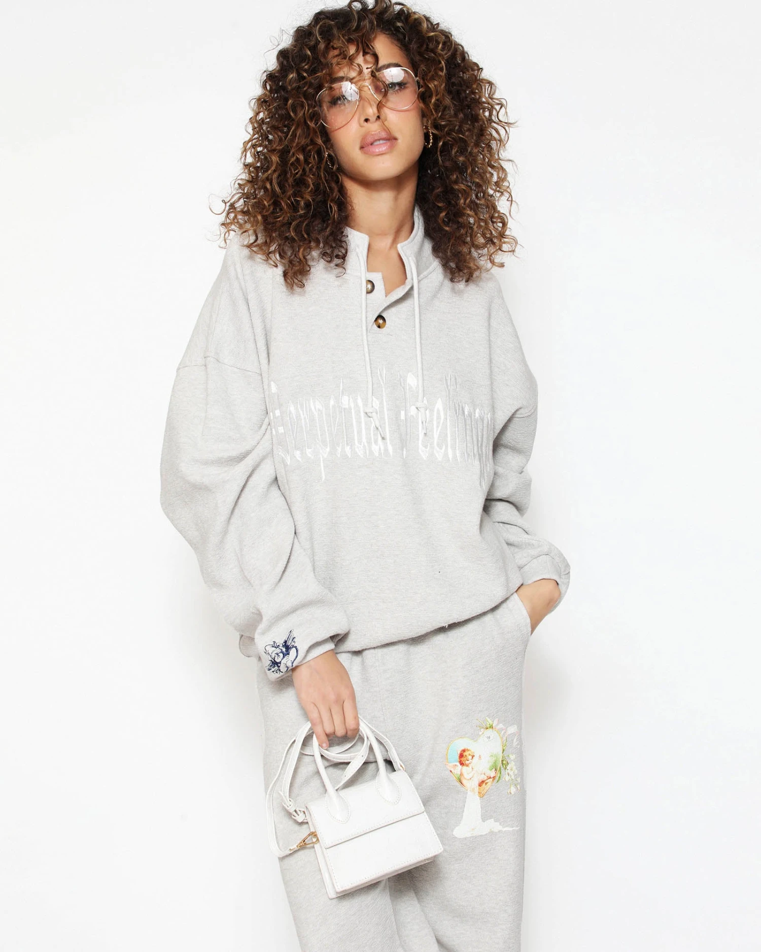 Inside out french terry fabric in heather grey. Henley style crewneck with button details, drawstring, ribbed cuffs and hem, and embroidery.