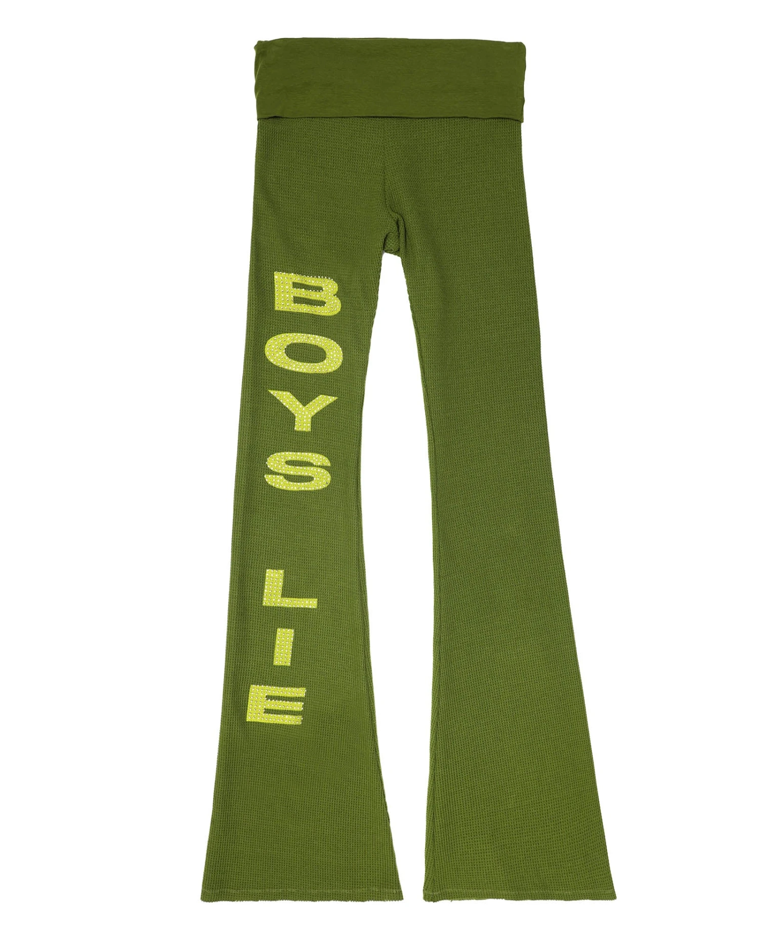 Mid rise soft thermal pants in olive green. Adjustable jersey fold-over waistband and flared hem with rhinestone embellishments.