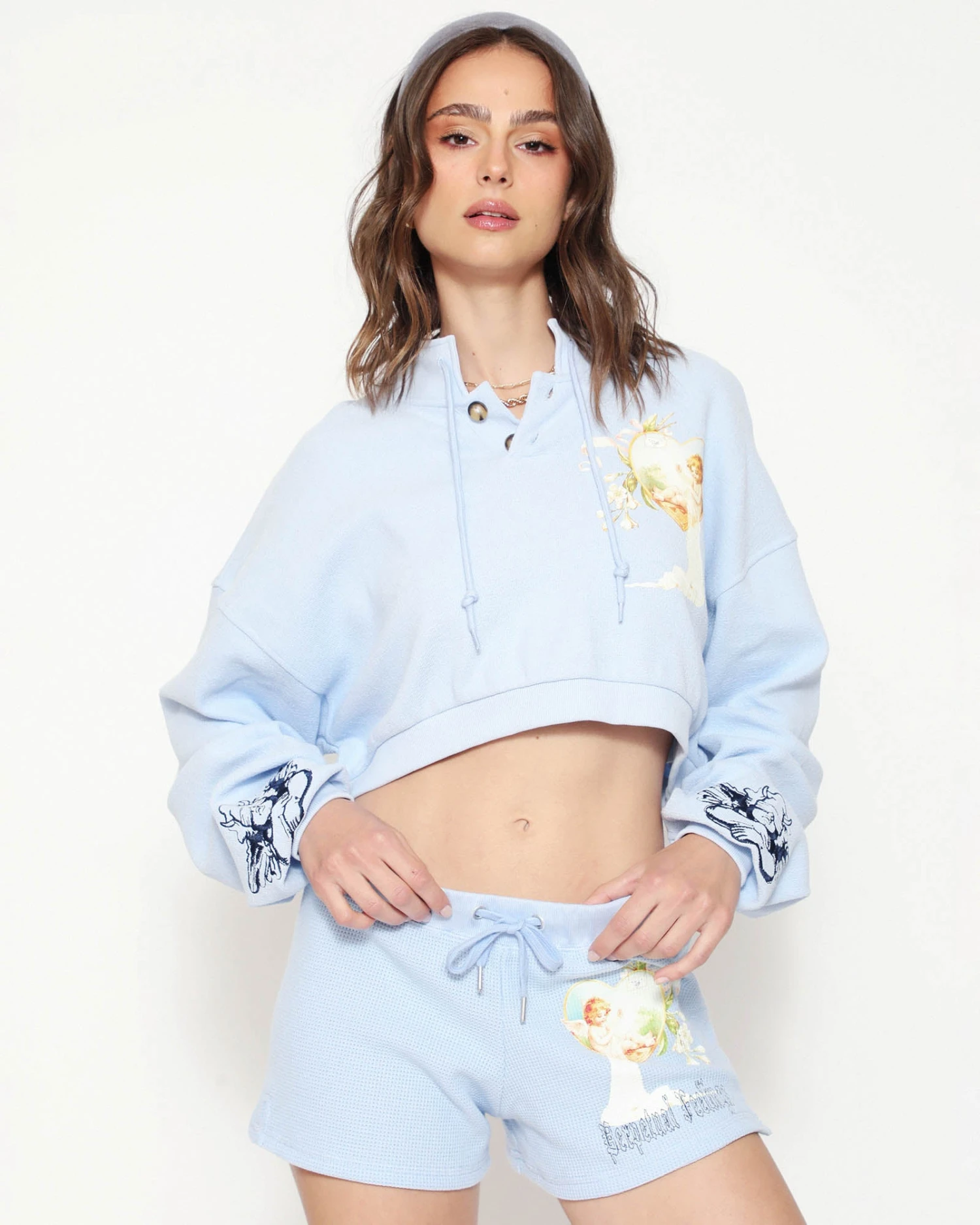 Soft thermal fabric in baby blue. Mid-rise shorts with adjustable drawstring and embroidery.