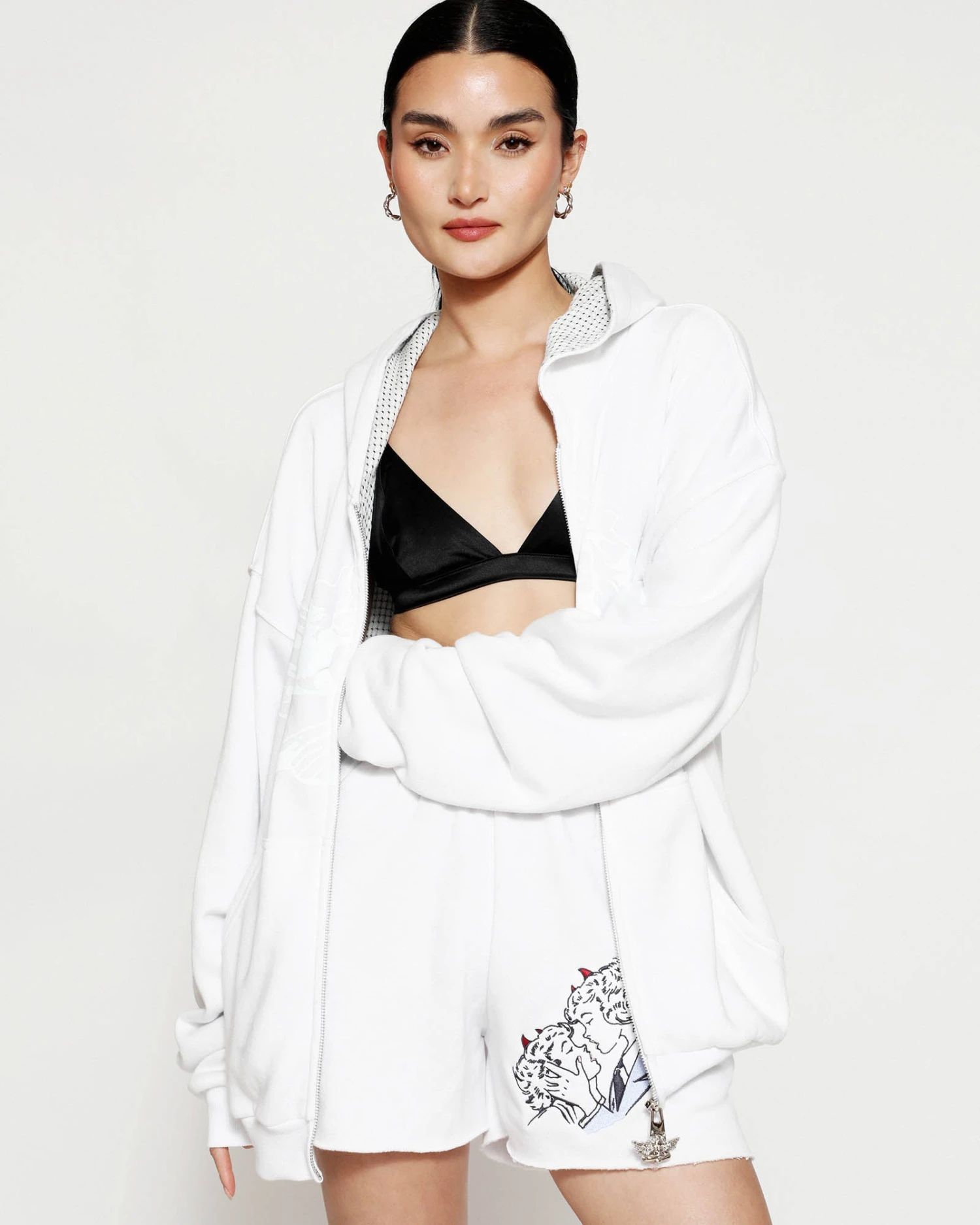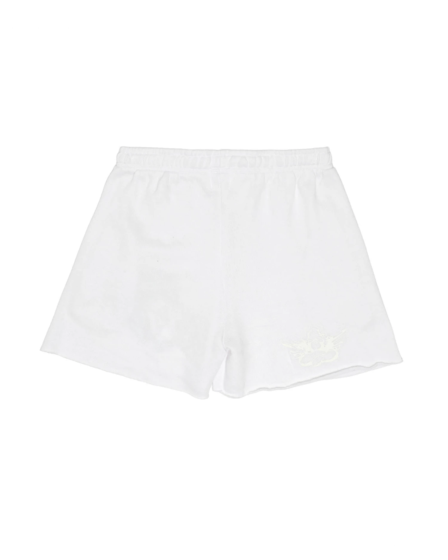 Fleece fabric in white. Mid-rise shorts with interior adjustable drawstring, side pockets, and a raw edge hem. Features embroidered graphic.