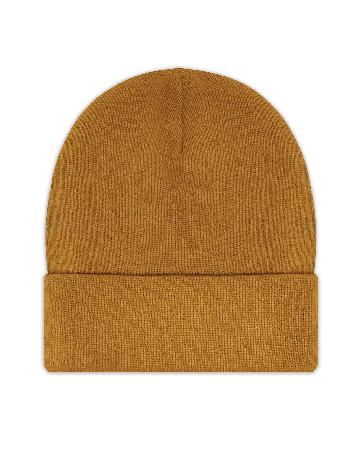 Dark gold beanie with monochromatic brown Boys Lie logo patch.