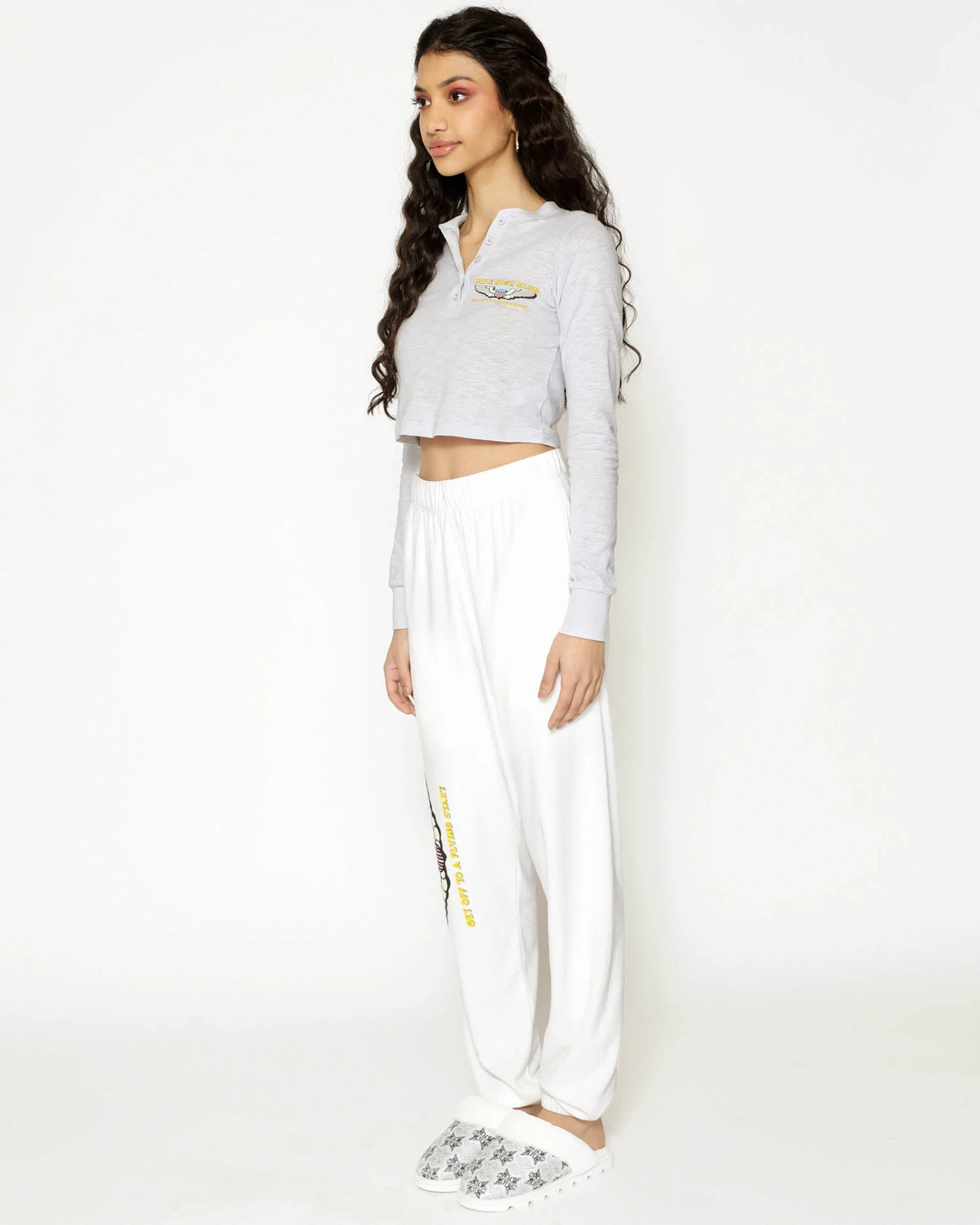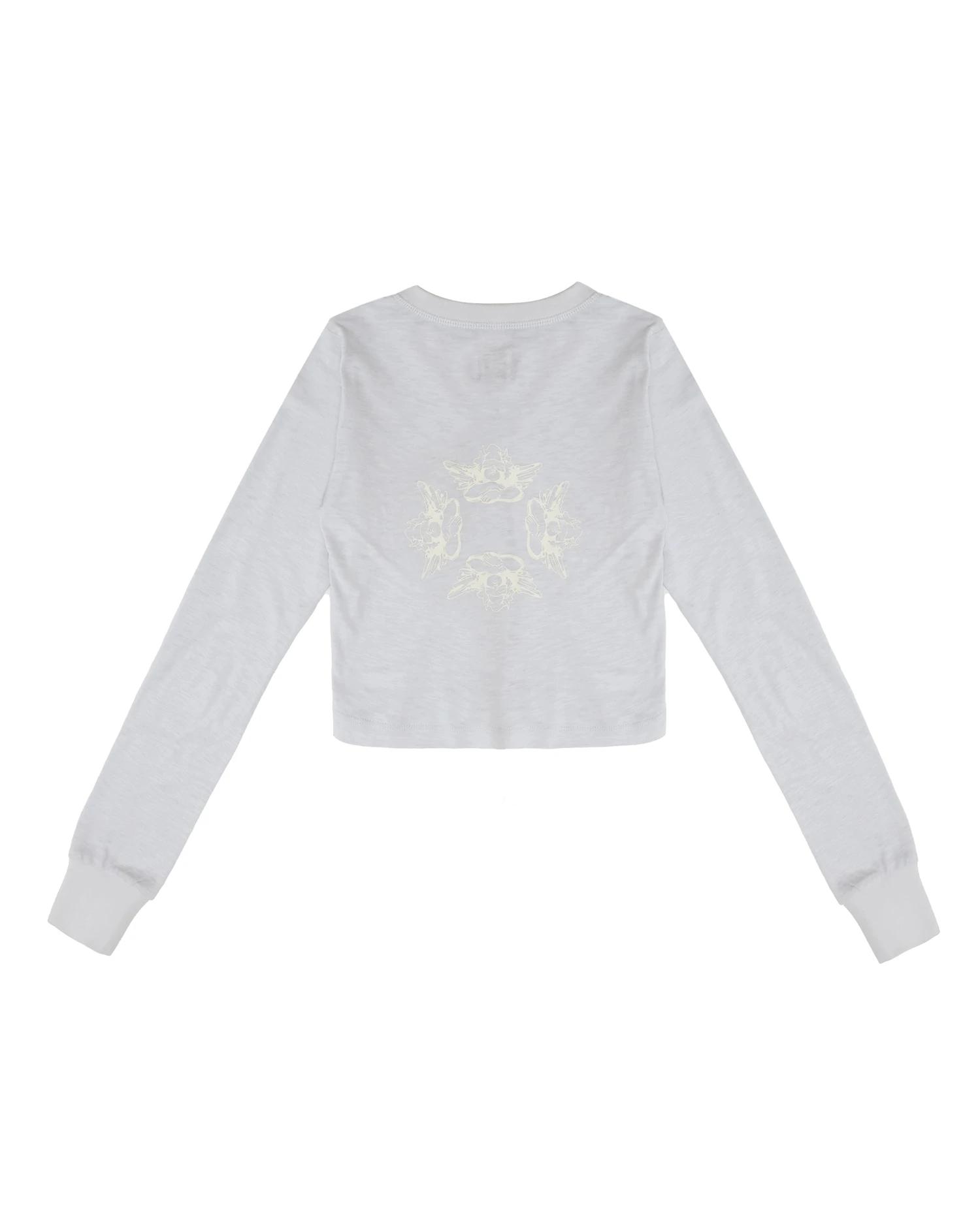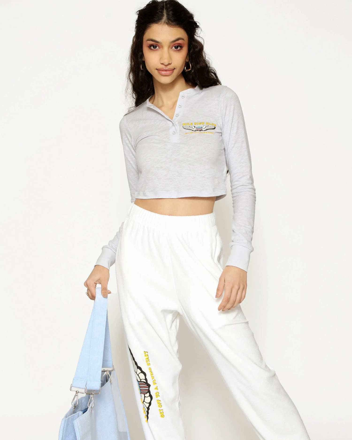 Light lavender cropped henley long sleeve with button details. Logos printed with vintage effect.