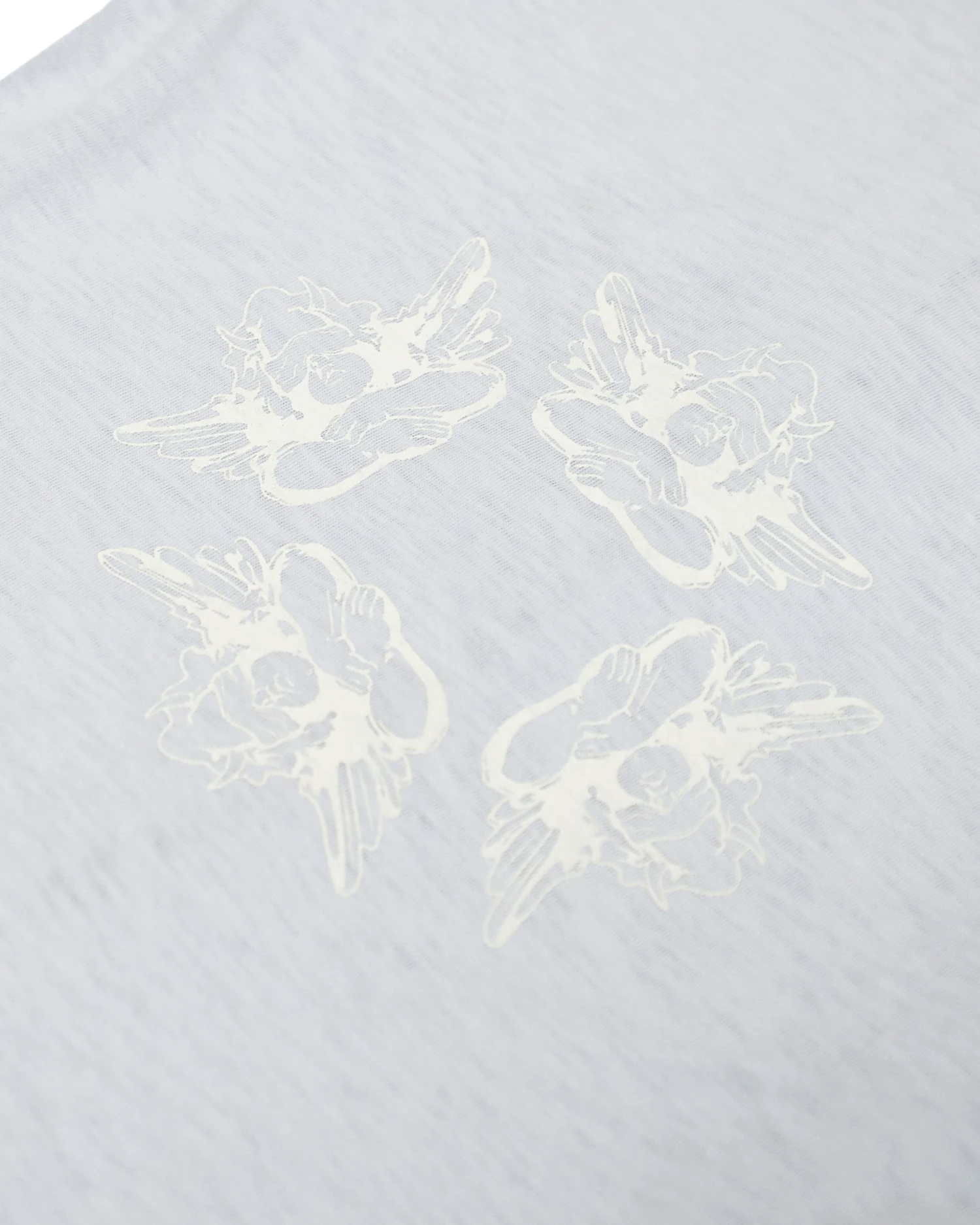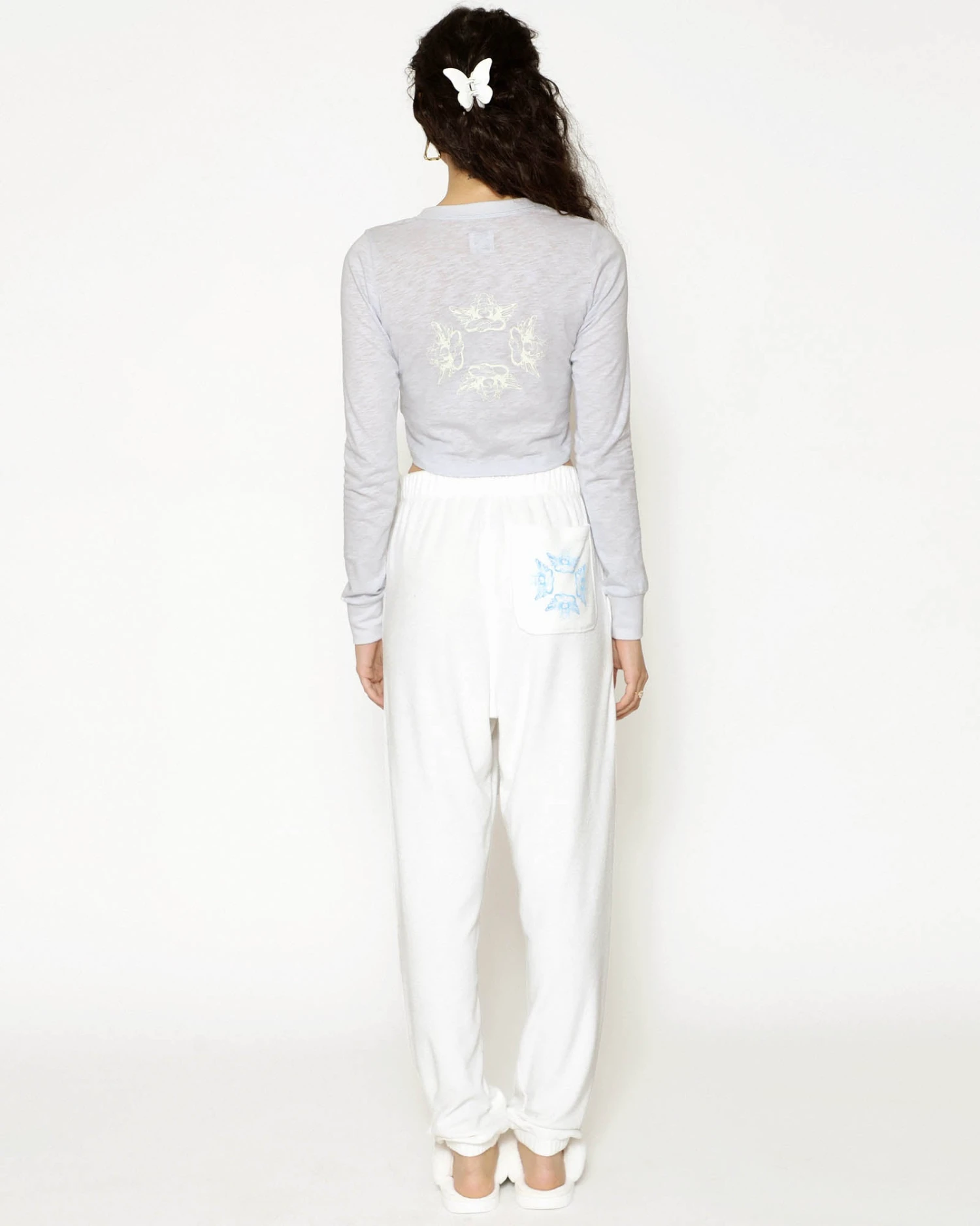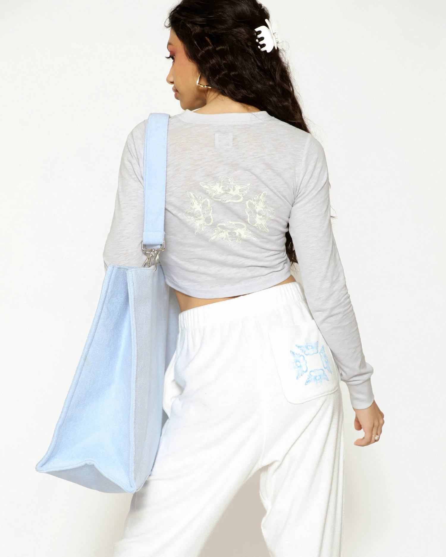 Light lavender cropped henley long sleeve with button details. Logos printed with vintage effect.