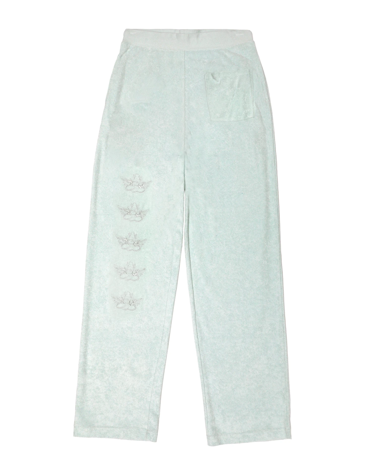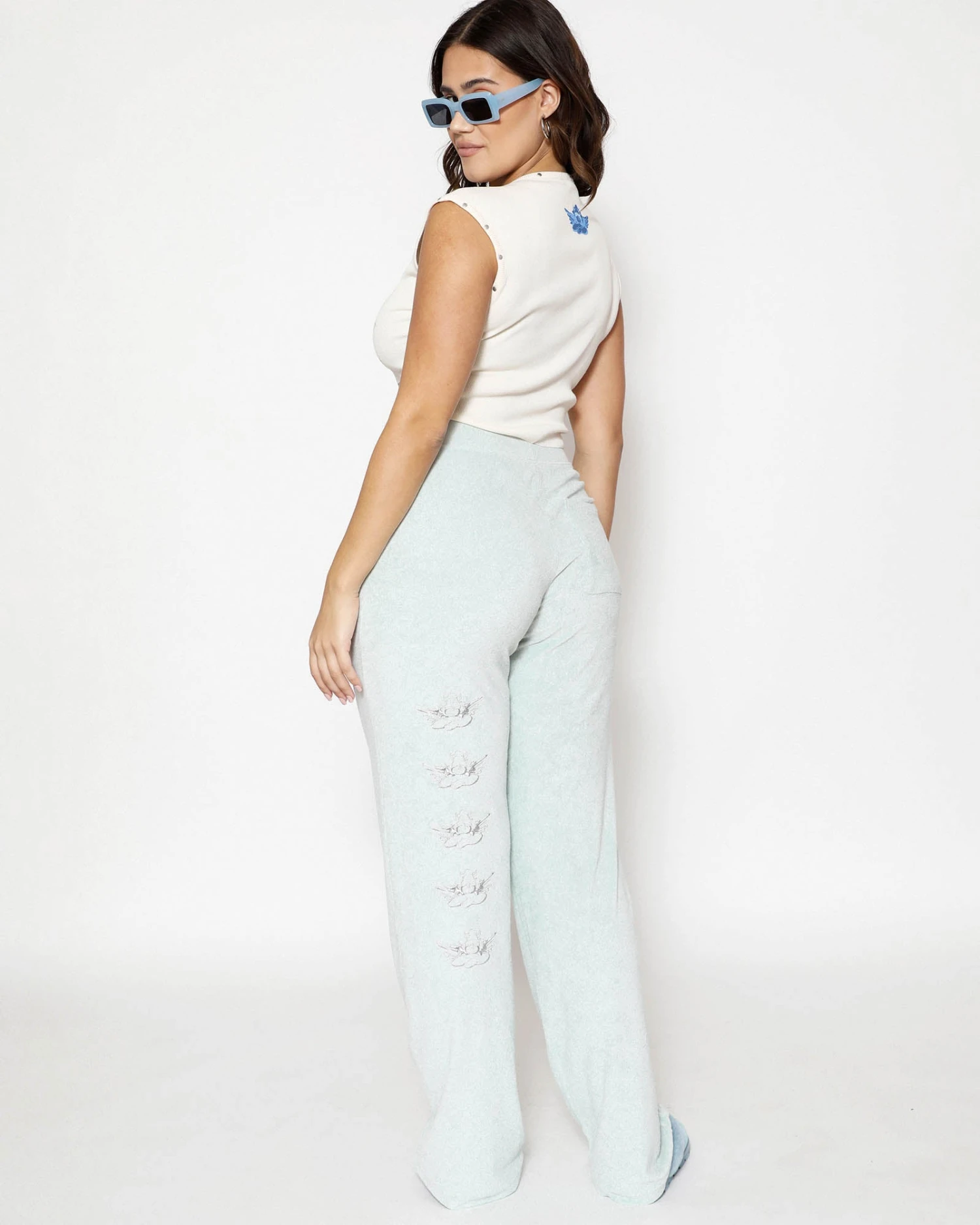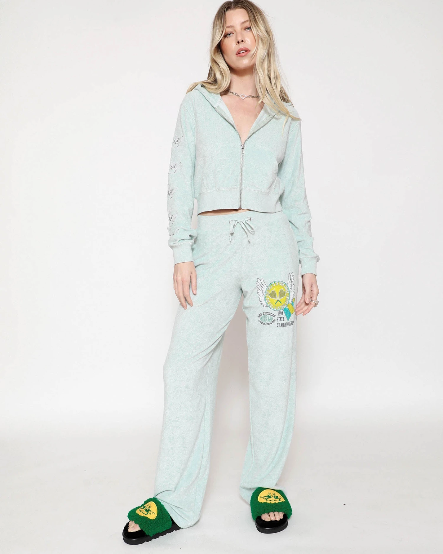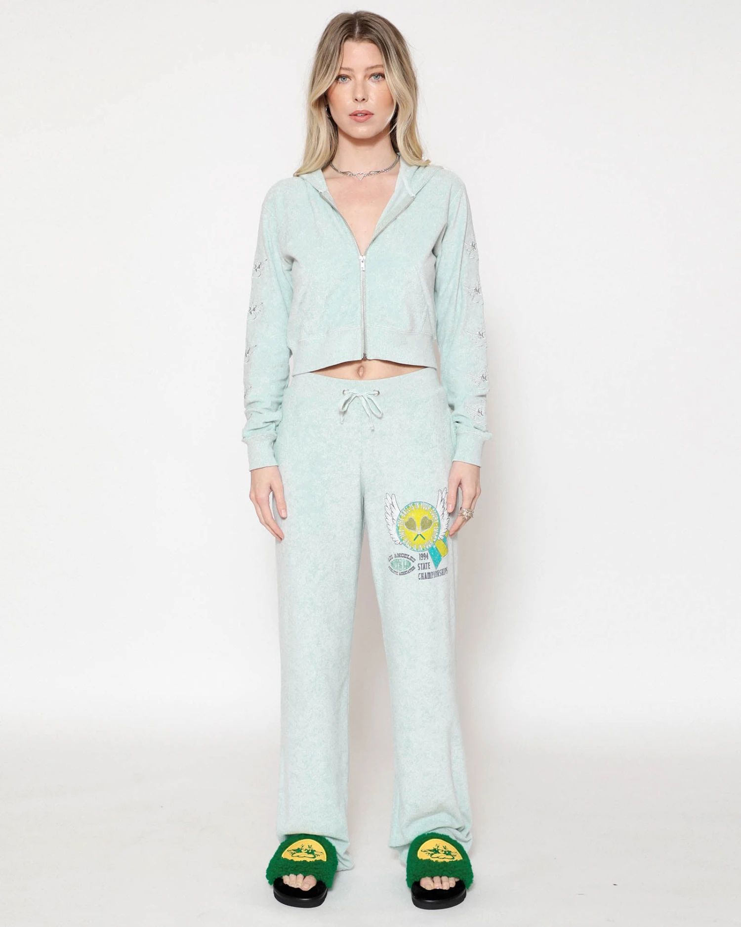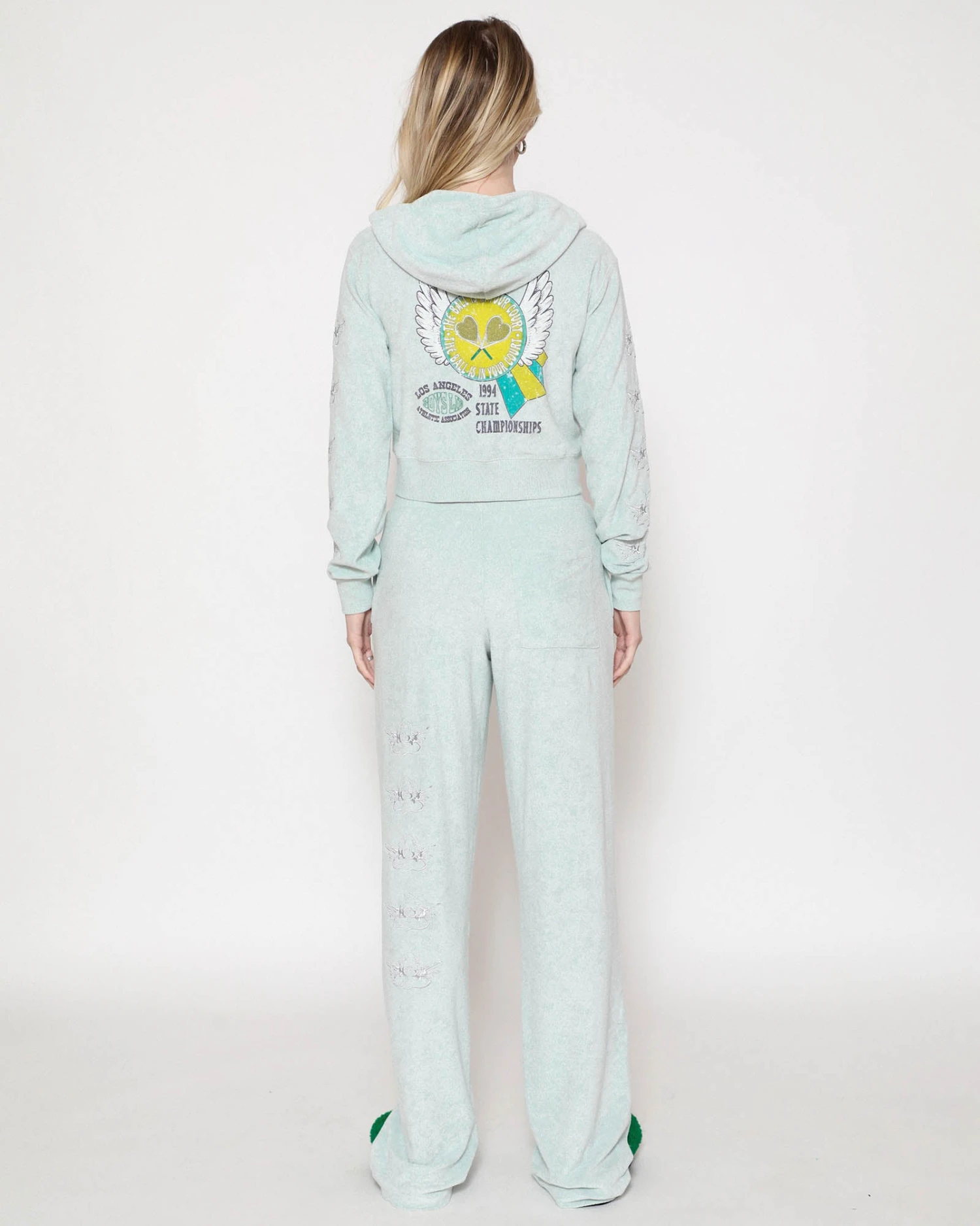 Lightweight terry cloth fabric in light blue-green. High rise sweatpants with side pockets, a drawstring waist, and straight leg with long inseam. Features metallic embroidery down the legs.