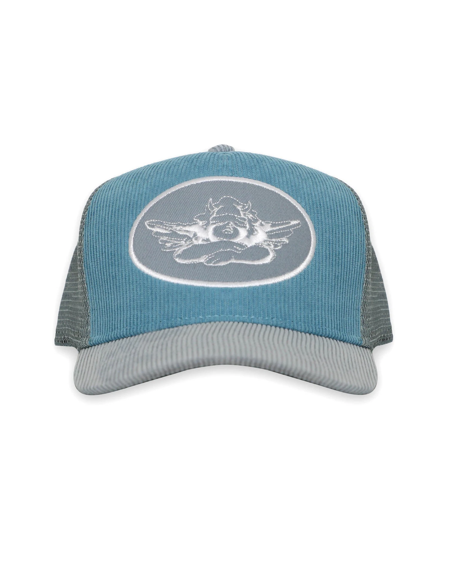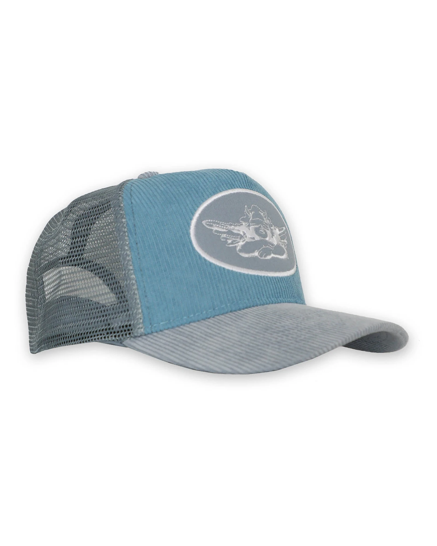 Grey trucker hat with grey patch and blue corduroy. Adjustable snapback.