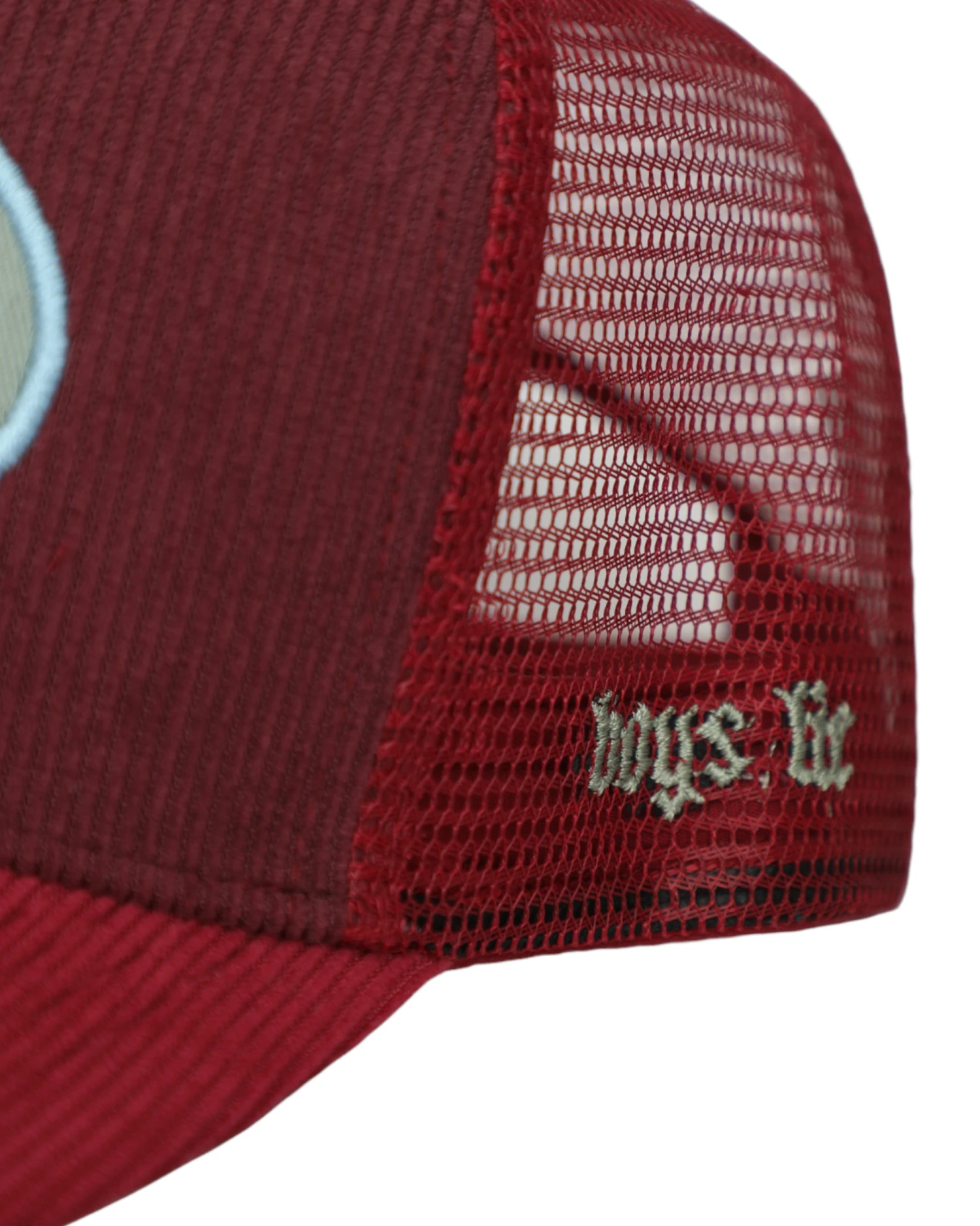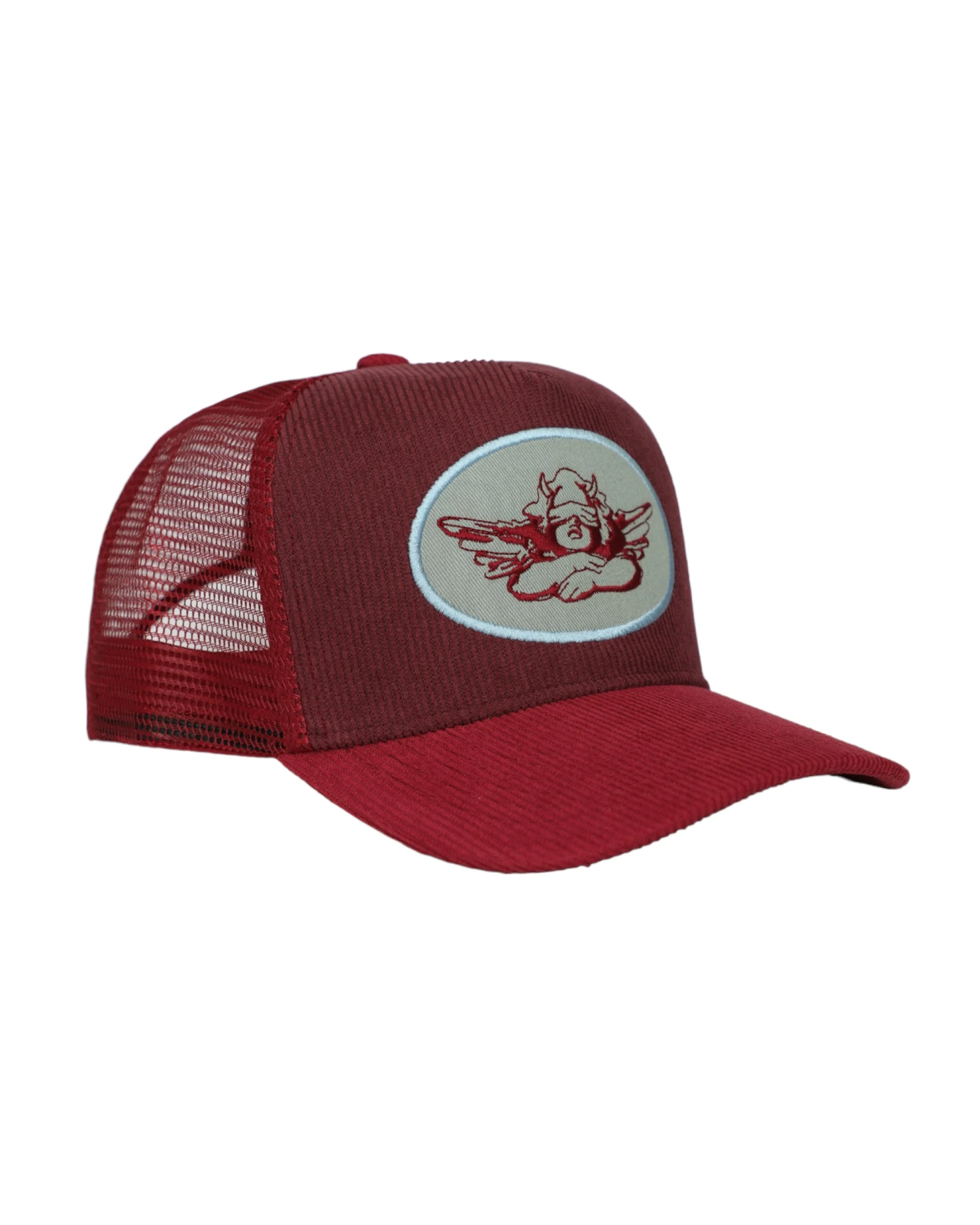 Maroon corduroy trucker hat with a blue patch and red brim. Adjustable snapback.